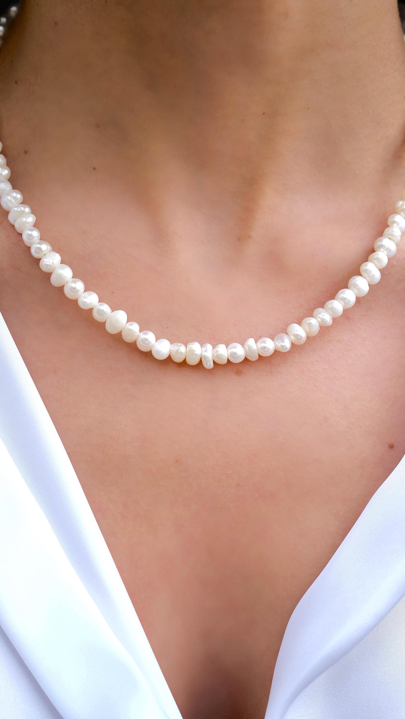 Each pearl is naturally unique, giving the necklace a soft organic character while maintaining a refined and delicate look. Perfect on its own or layered with other necklaces, this piece adds effortless sophistication to any outfit.