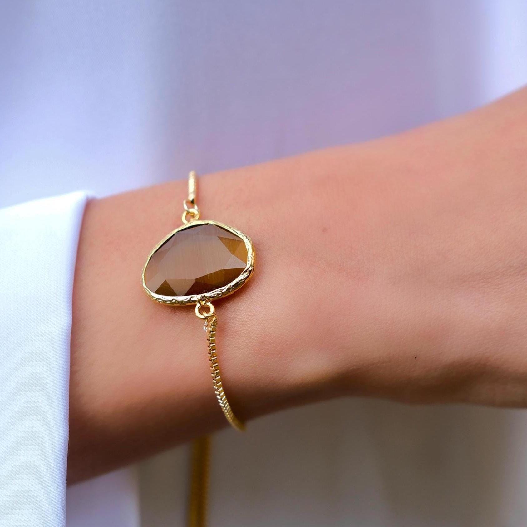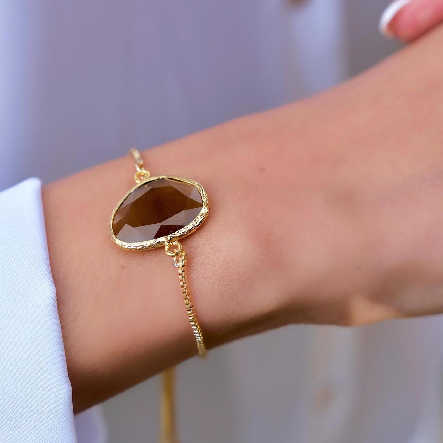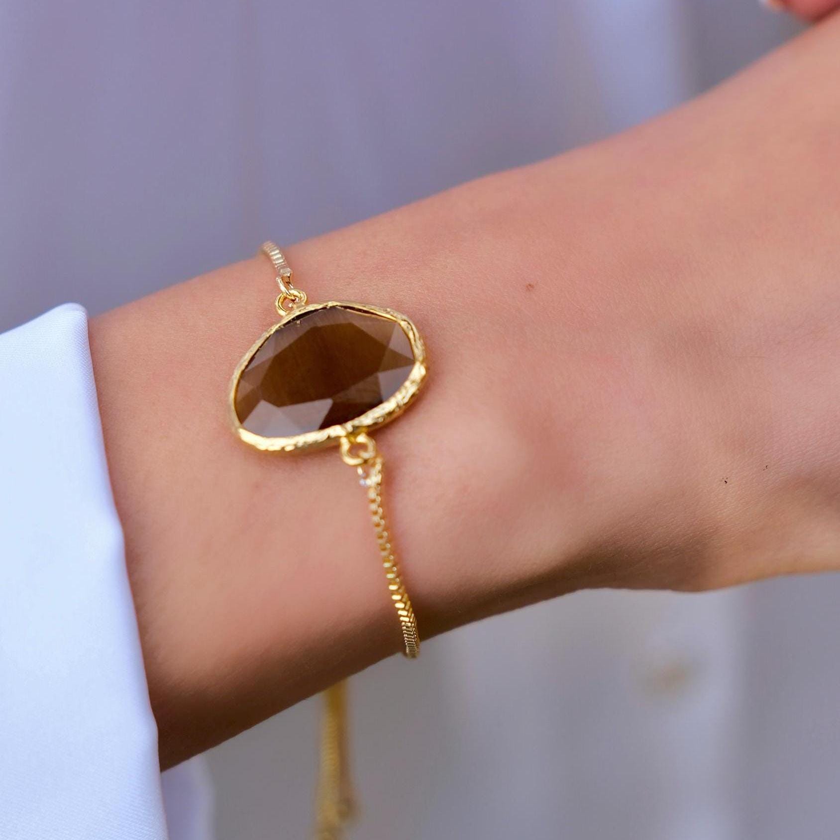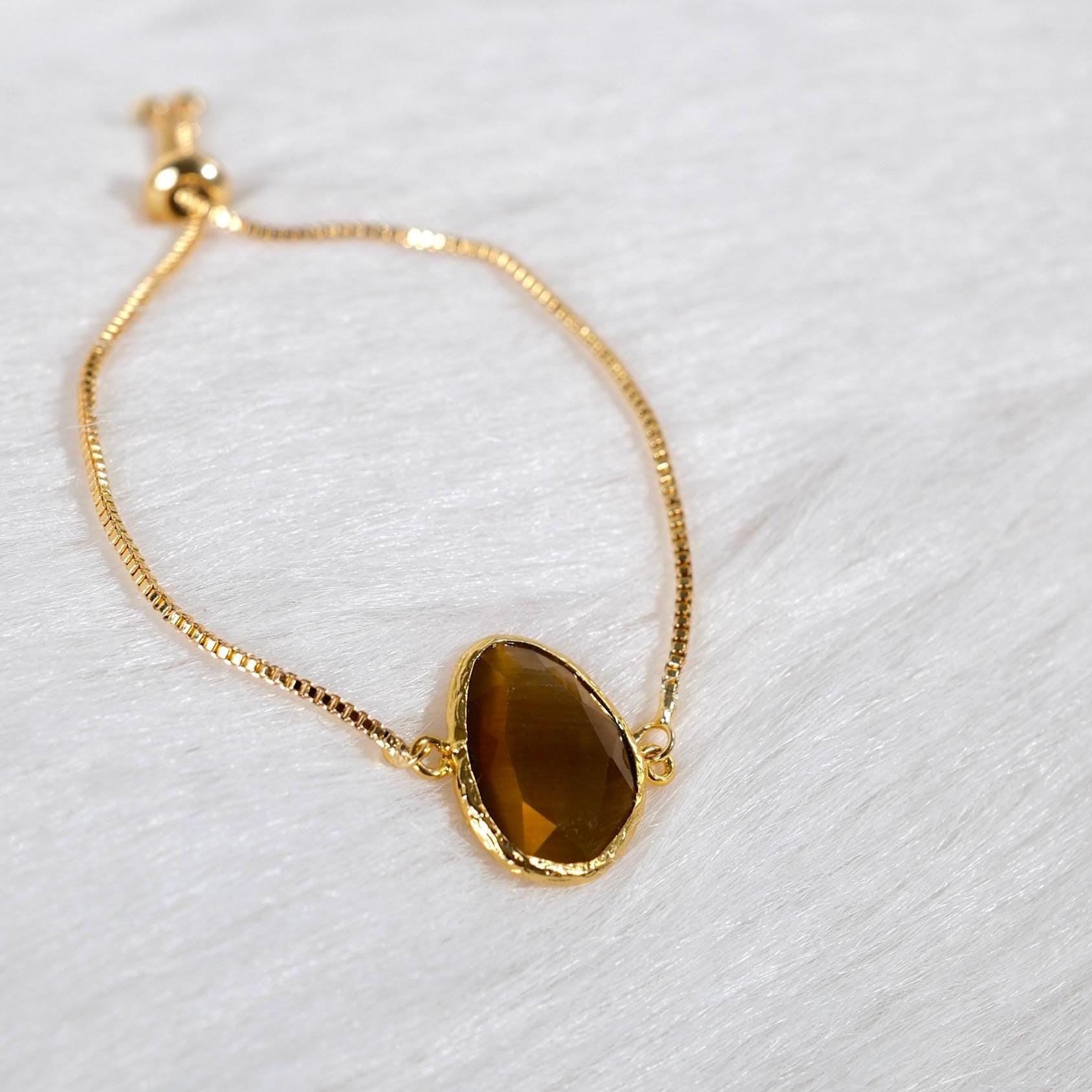 Tigers Eye Bracelet Gold Chain, Faceted Gemstone Adjustable Dainty Jewelry Gift for Her