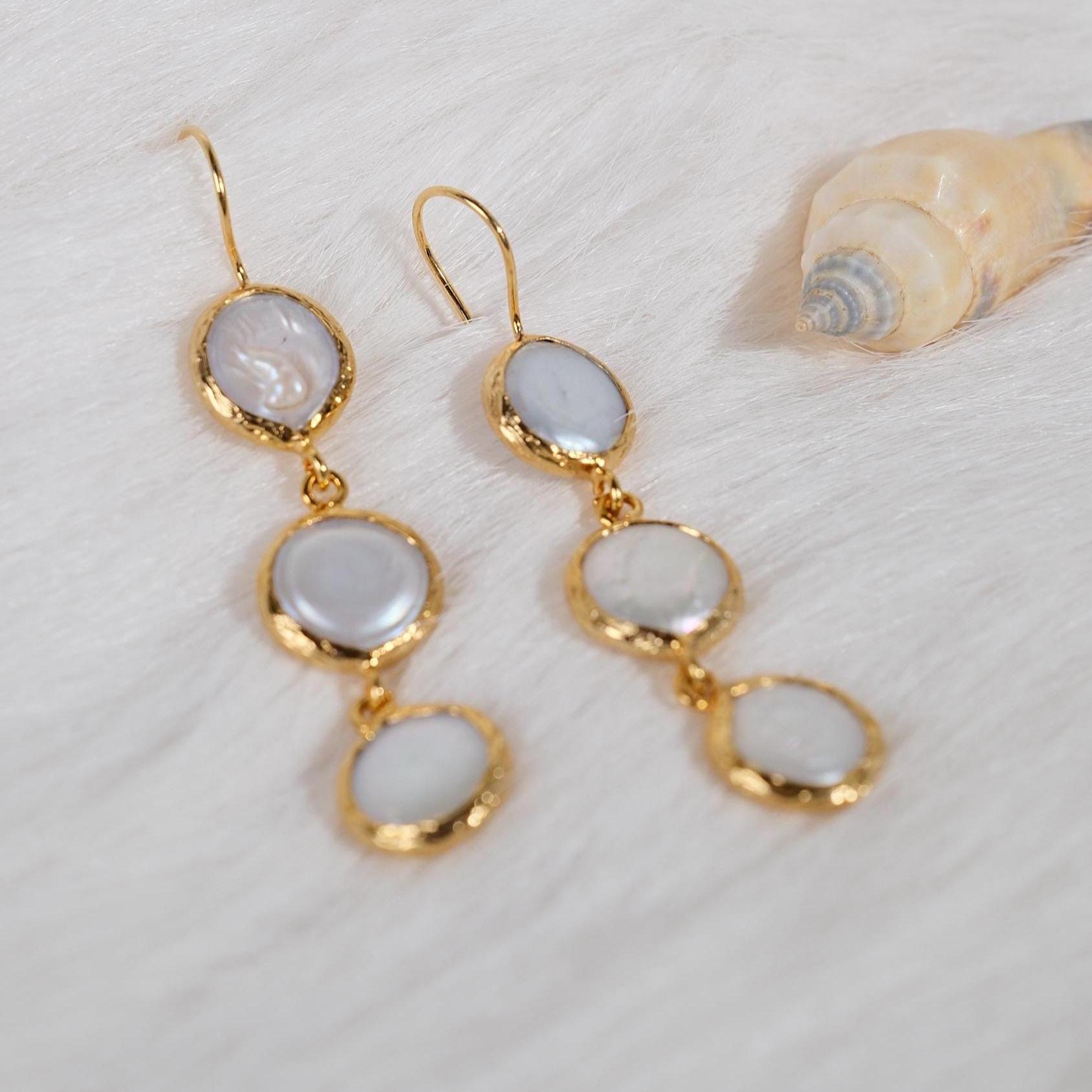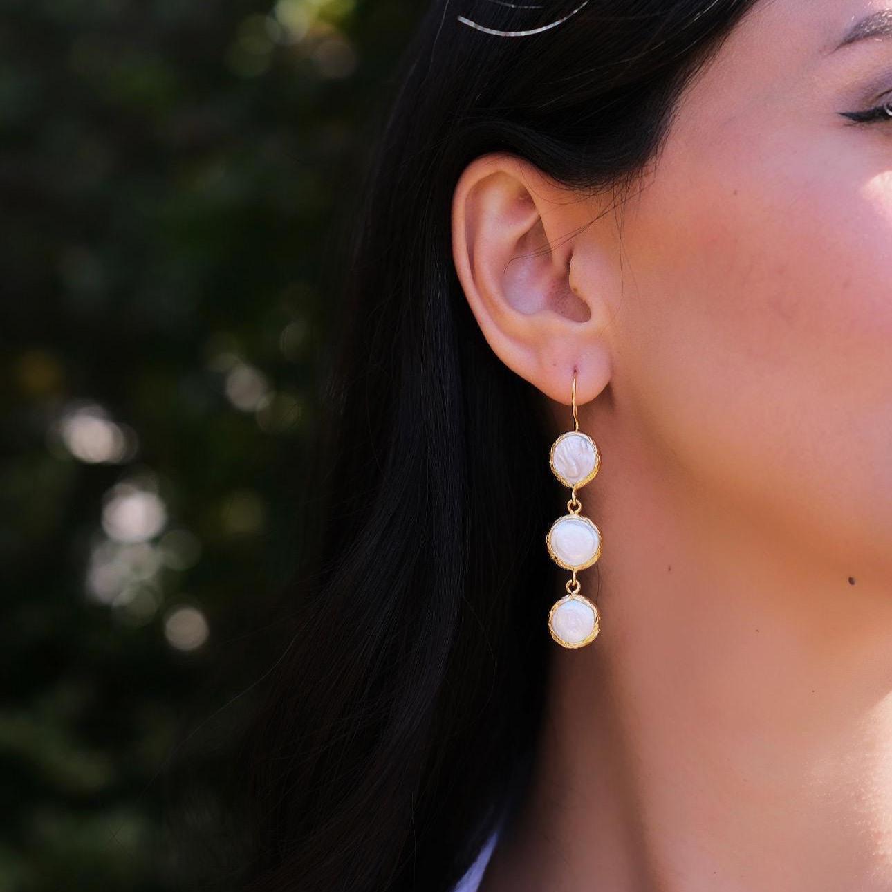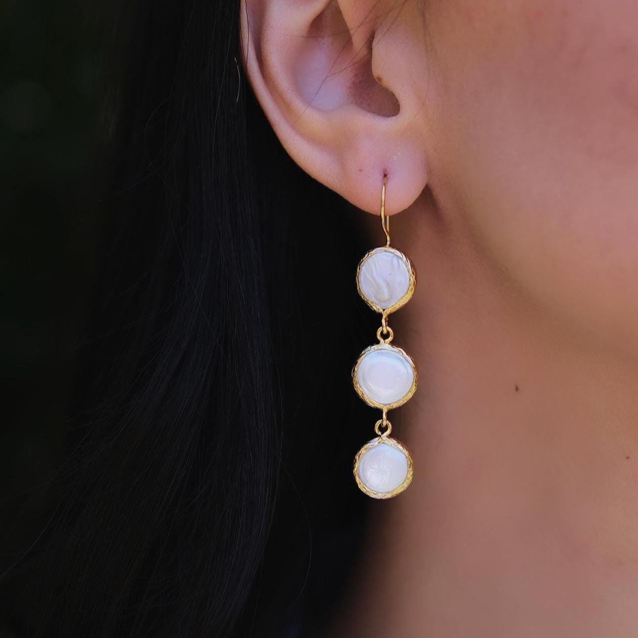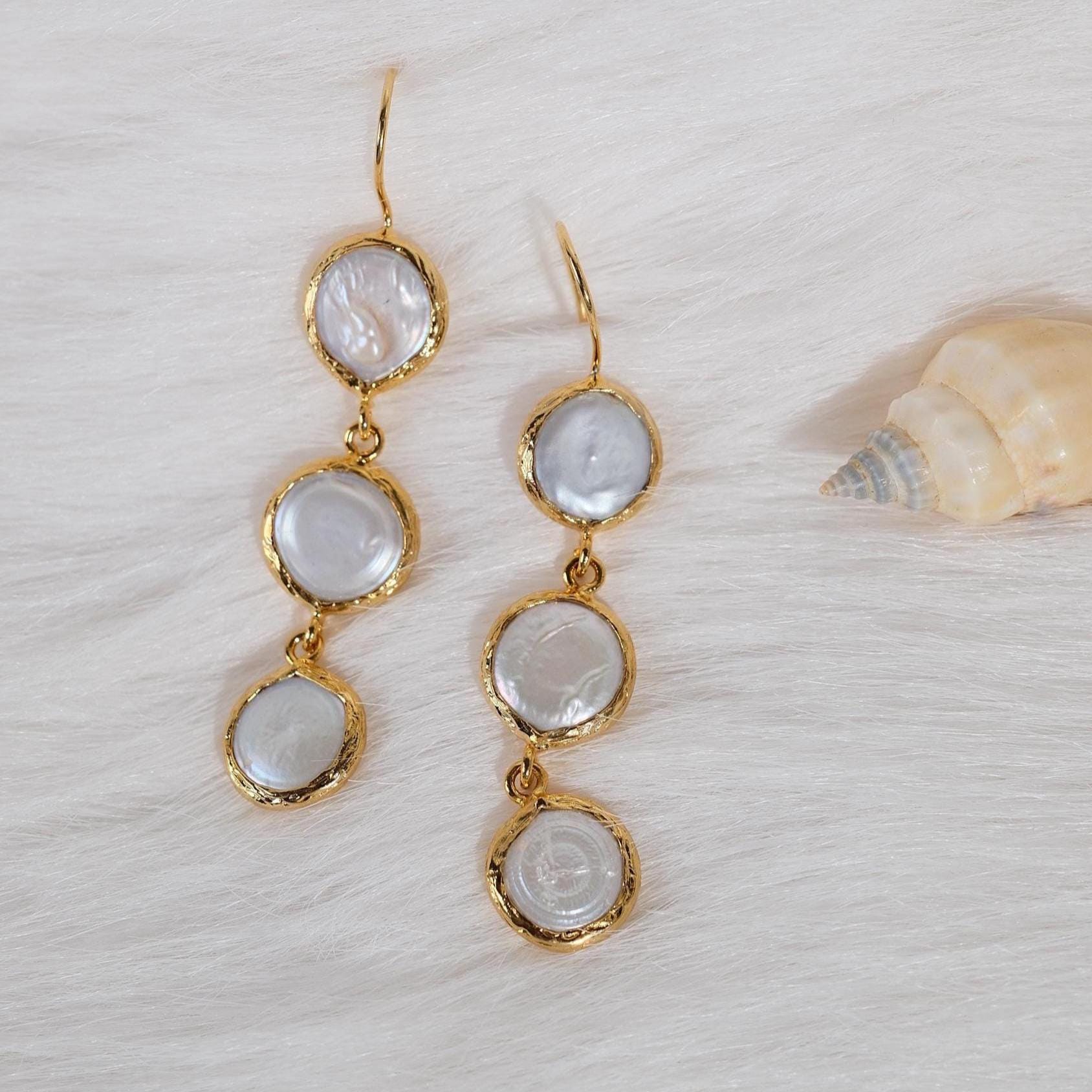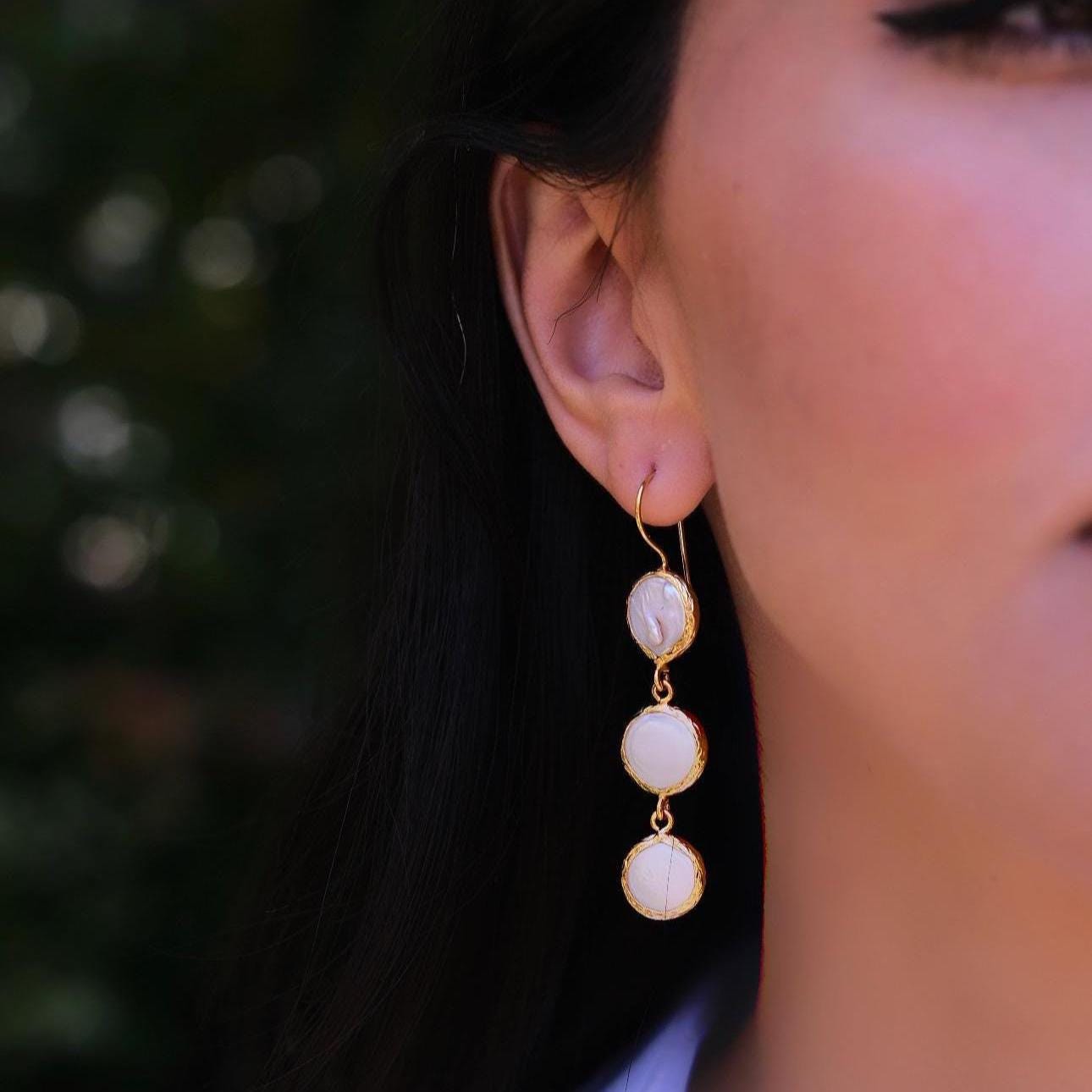 These long pearl drop earrings are the perfect finishing touch for weddings, bridal looks, or any elegant event. Featuring three lustrous pearls gently cascading in a vertical design, they offer graceful movement and a soft glow with every step.
