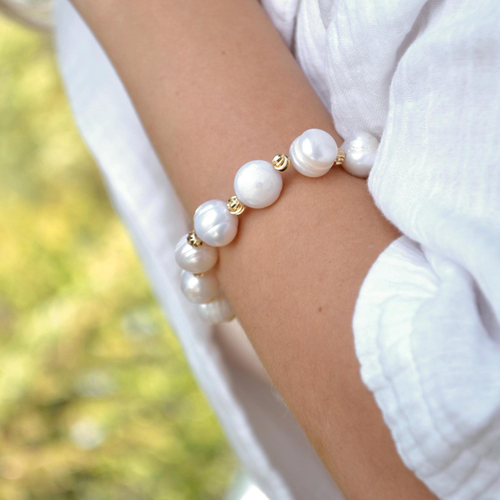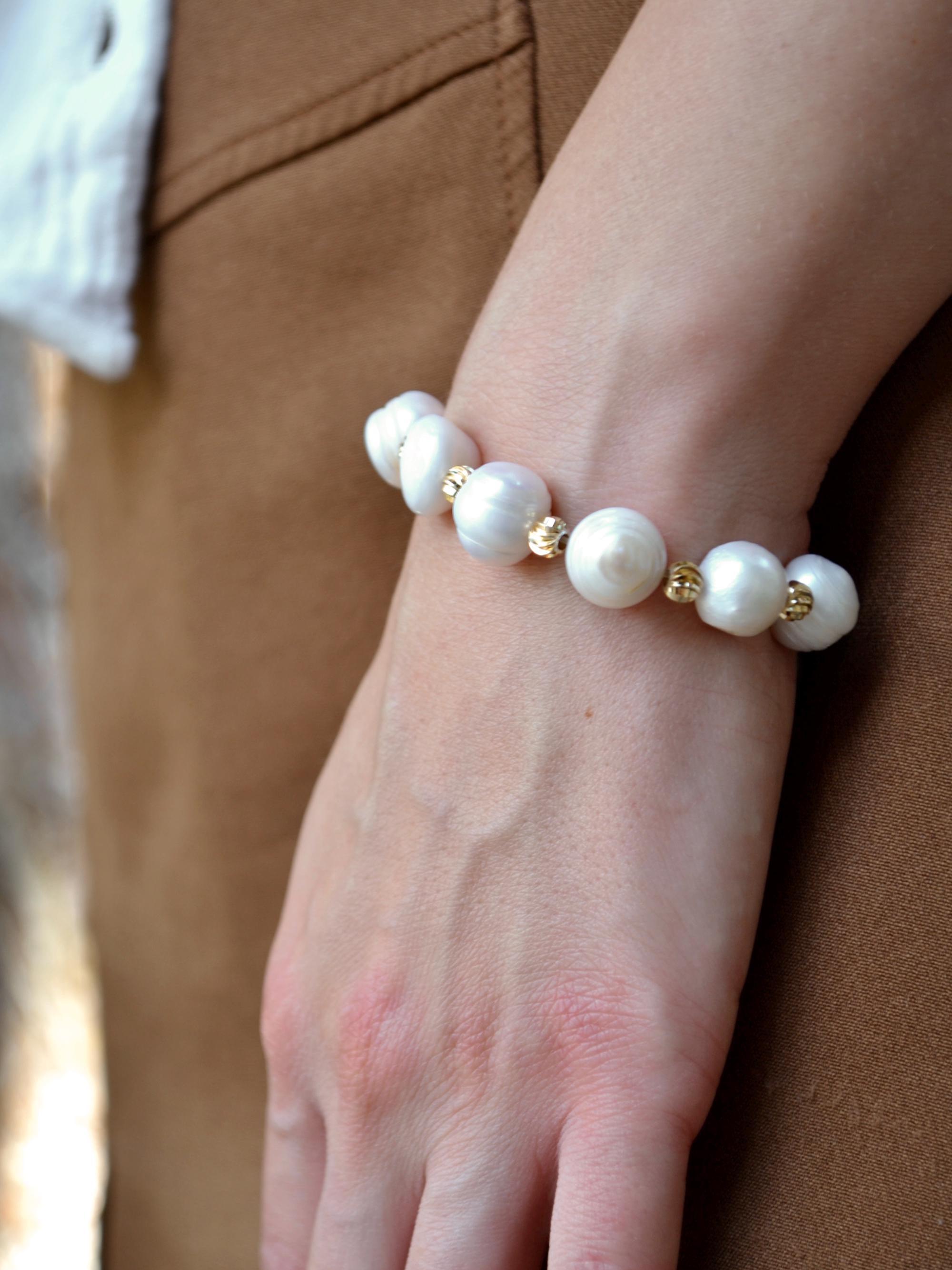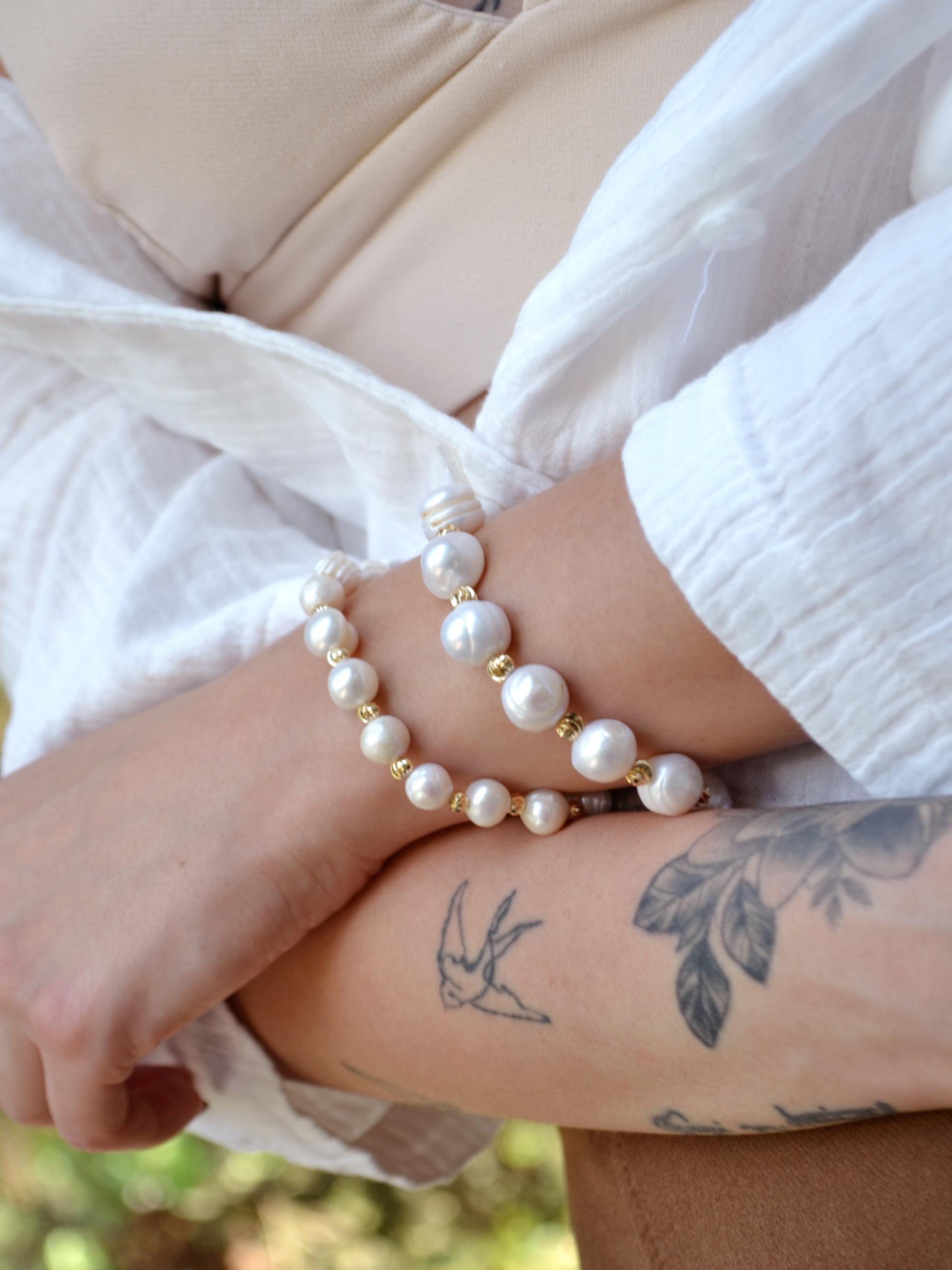 This piece features naturally shaped baroque freshwater pearls paired with warm gold accents, creating a soft organic look with a refined glow. Each pearl has its own unique character, making every bracelet truly one of a kind.