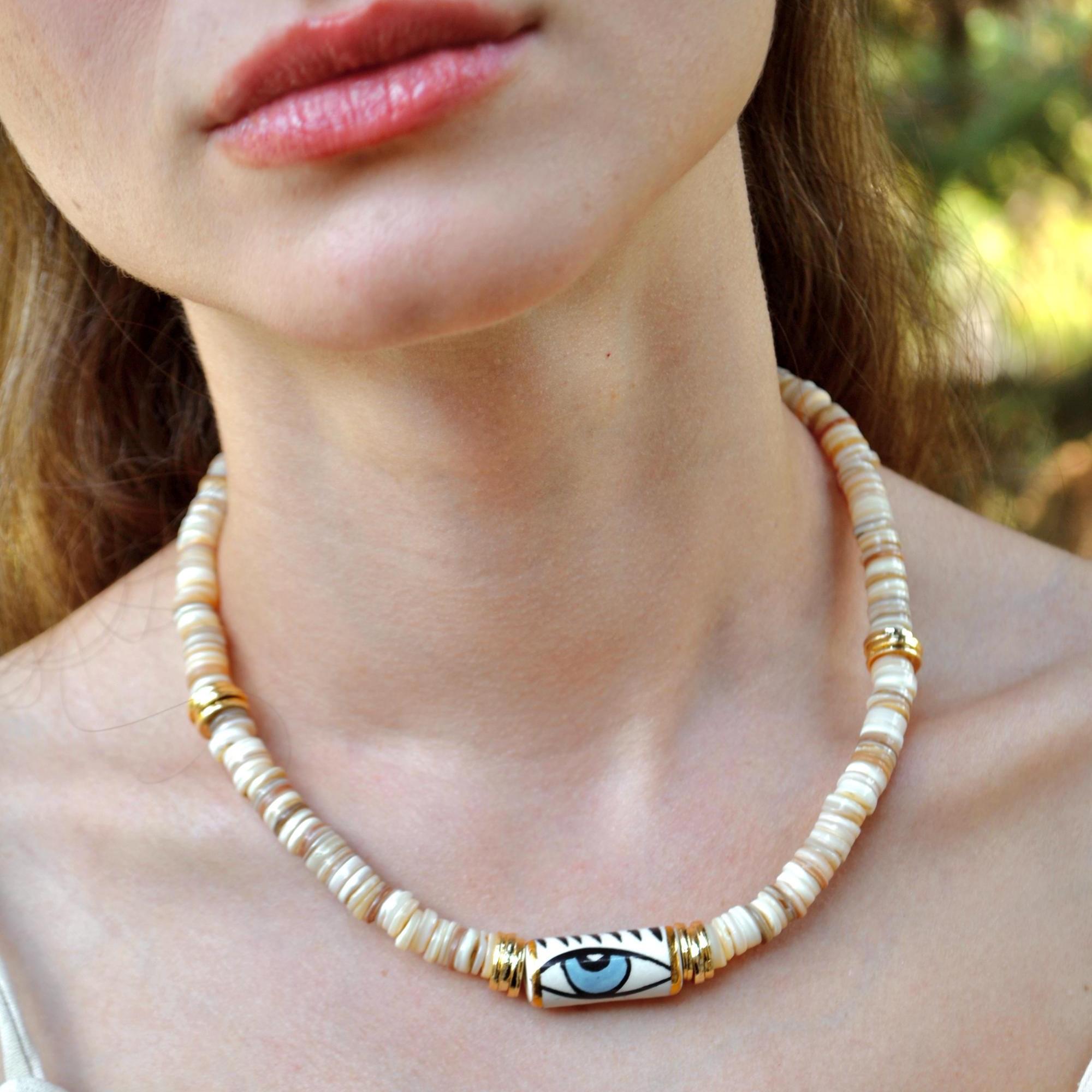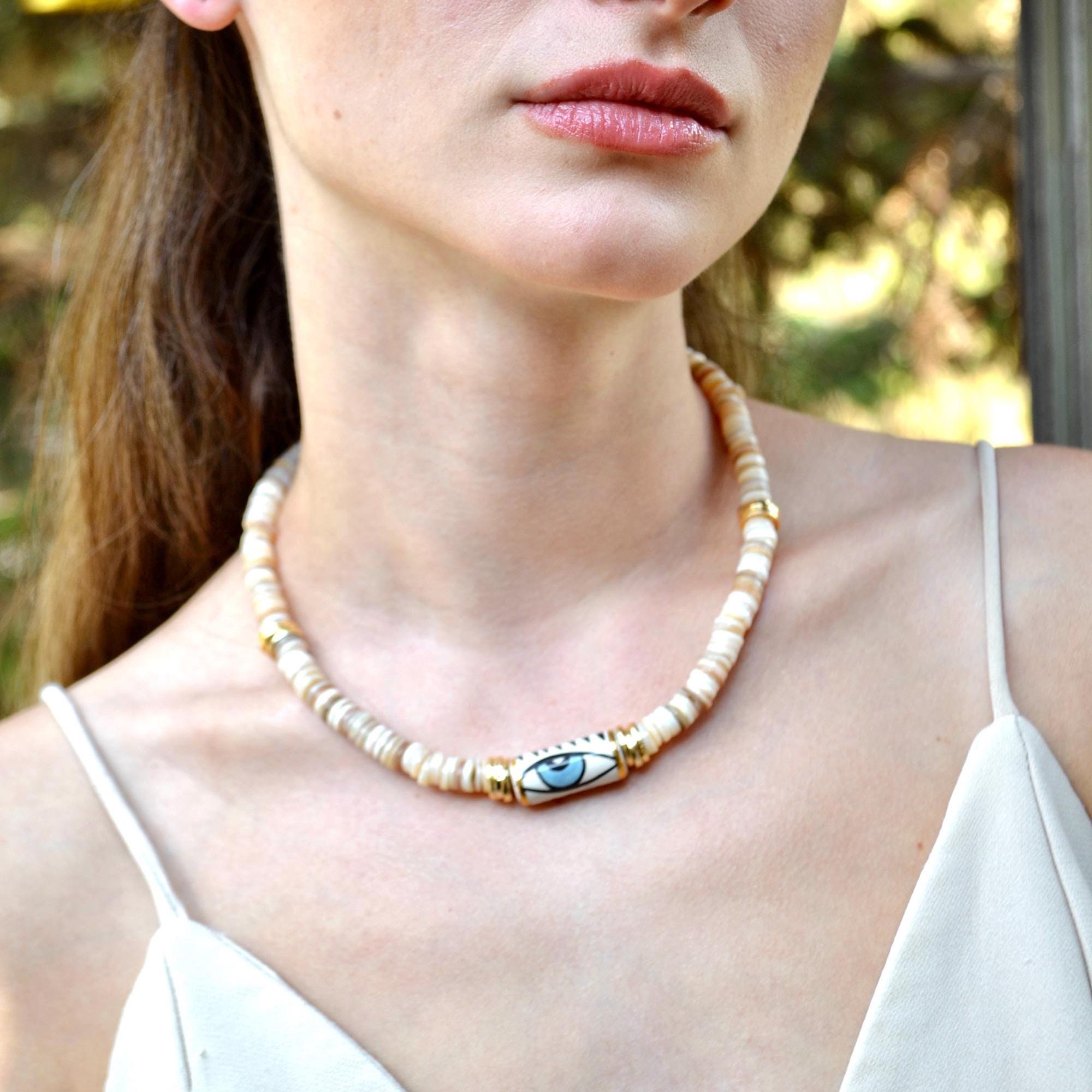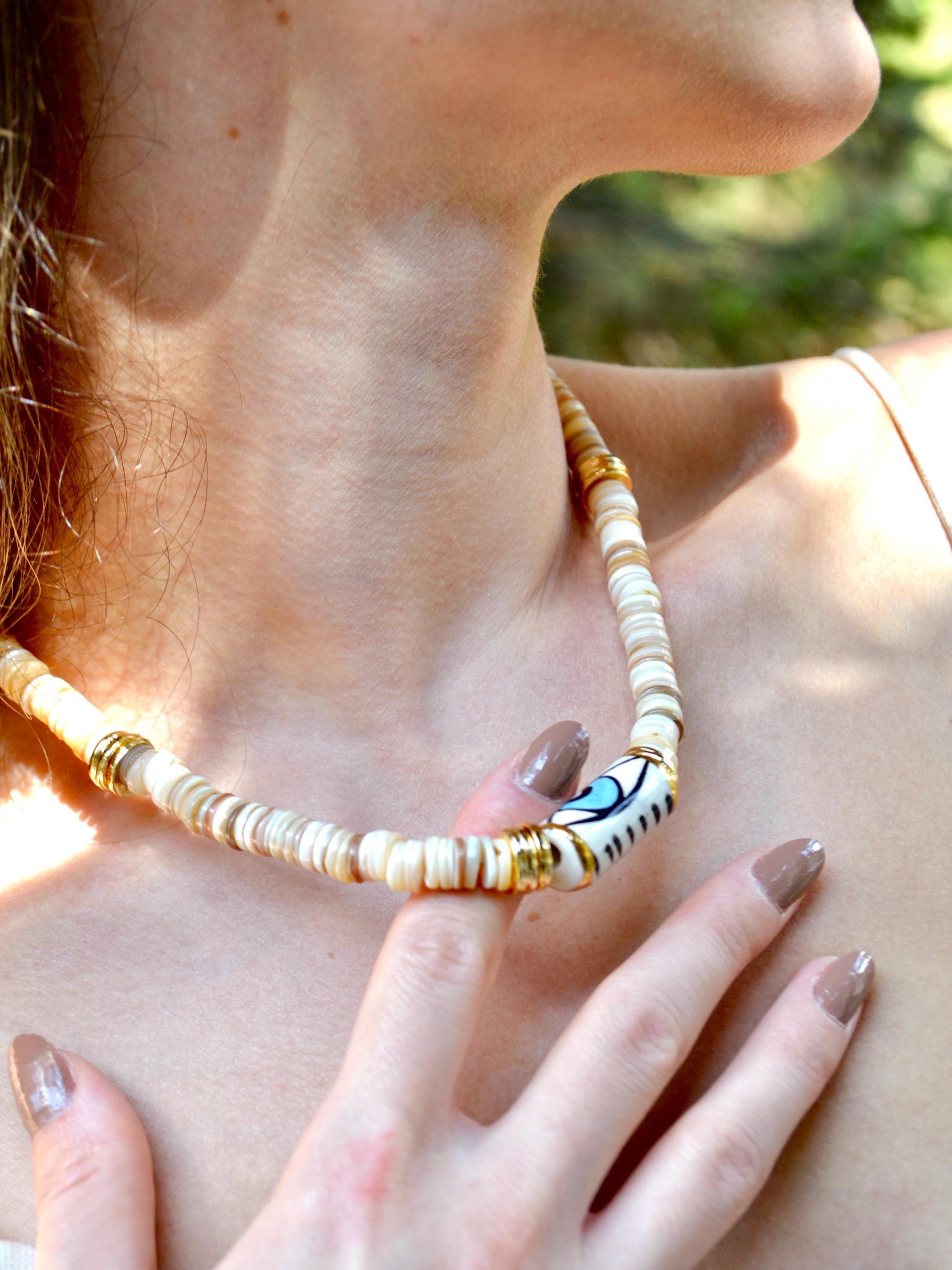 This handmade shell pearl beaded necklace features a clean and minimal boho design inspired by summer days and coastal living. Its soft, natural tones make it easy to wear every day or layer with other necklaces for a relaxed beach-style look.