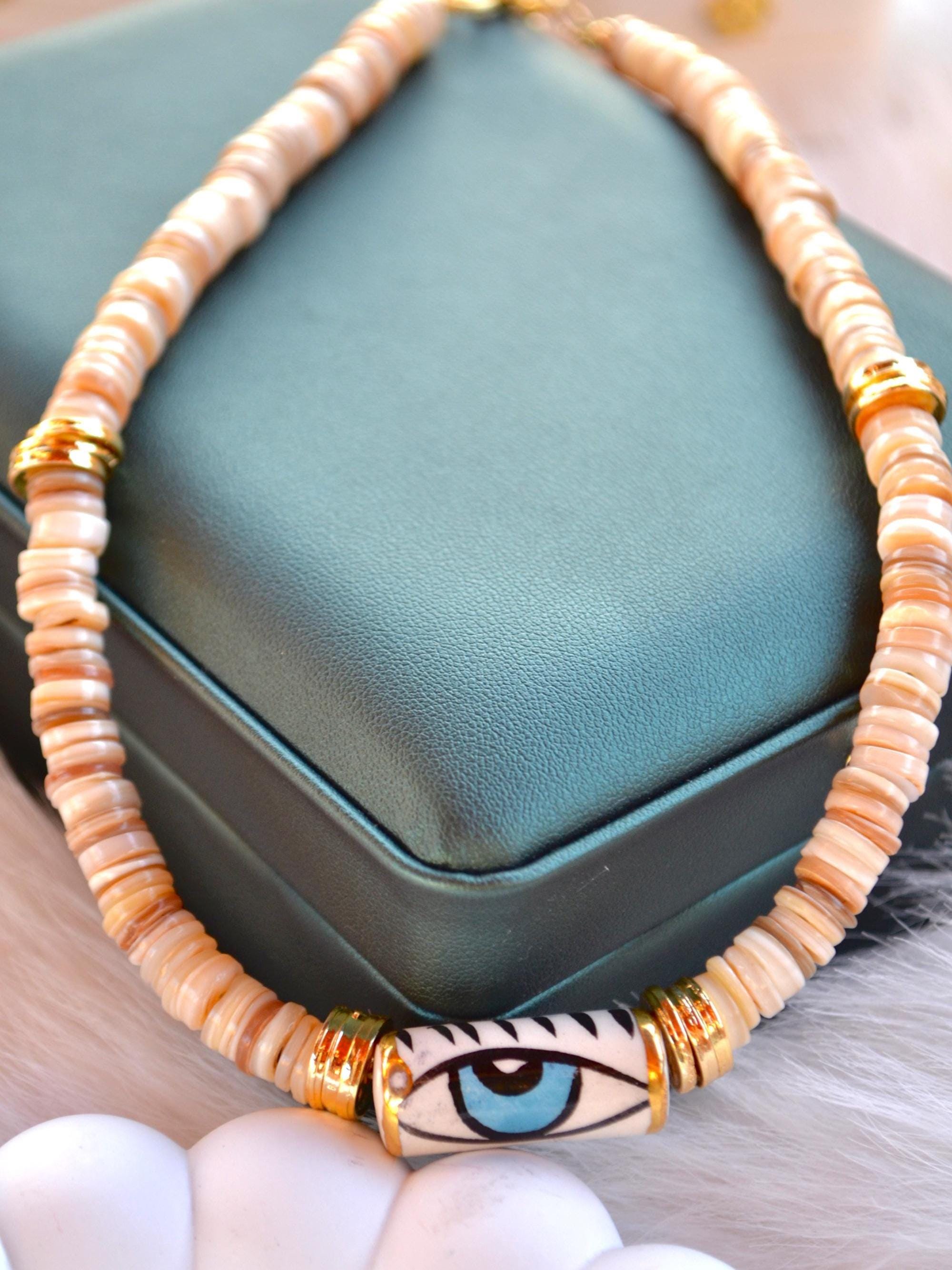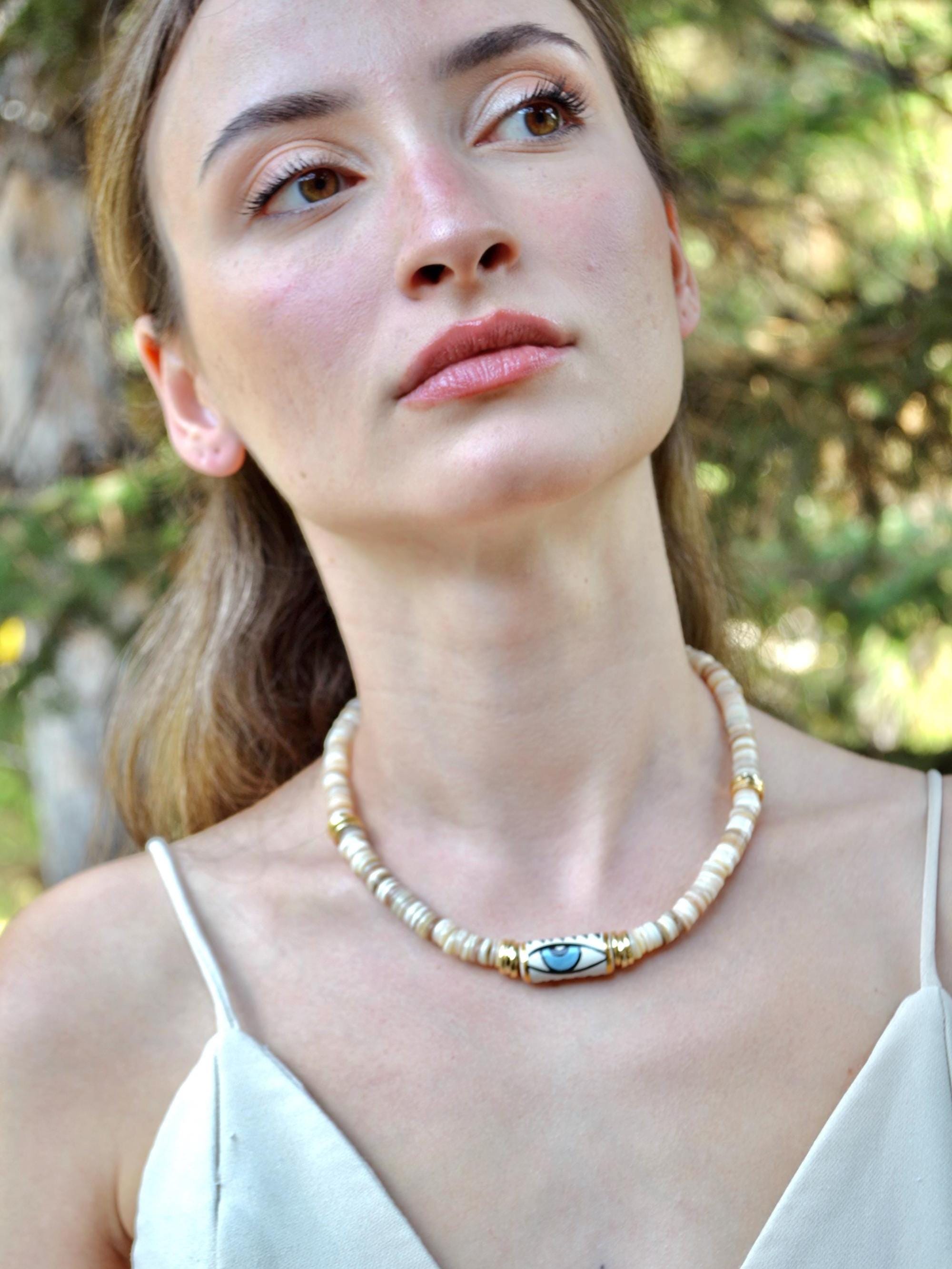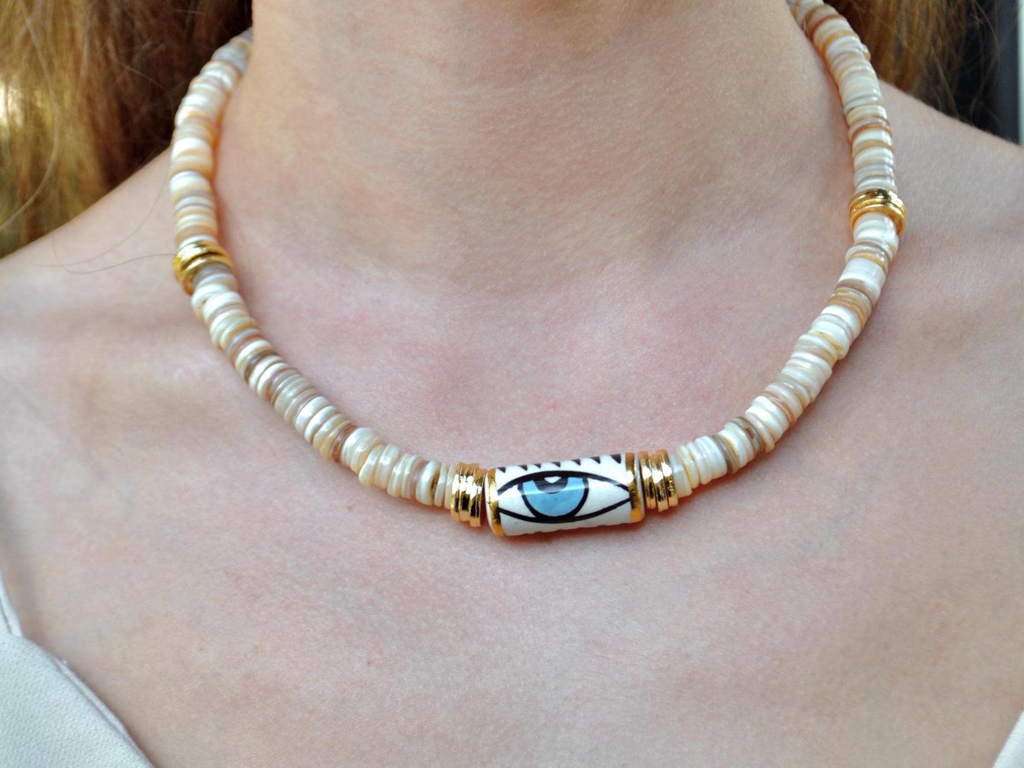 This handmade shell pearl beaded necklace features a clean and minimal boho design inspired by summer days and coastal living. Its soft, natural tones make it easy to wear every day or layer with other necklaces for a relaxed beach-style look.