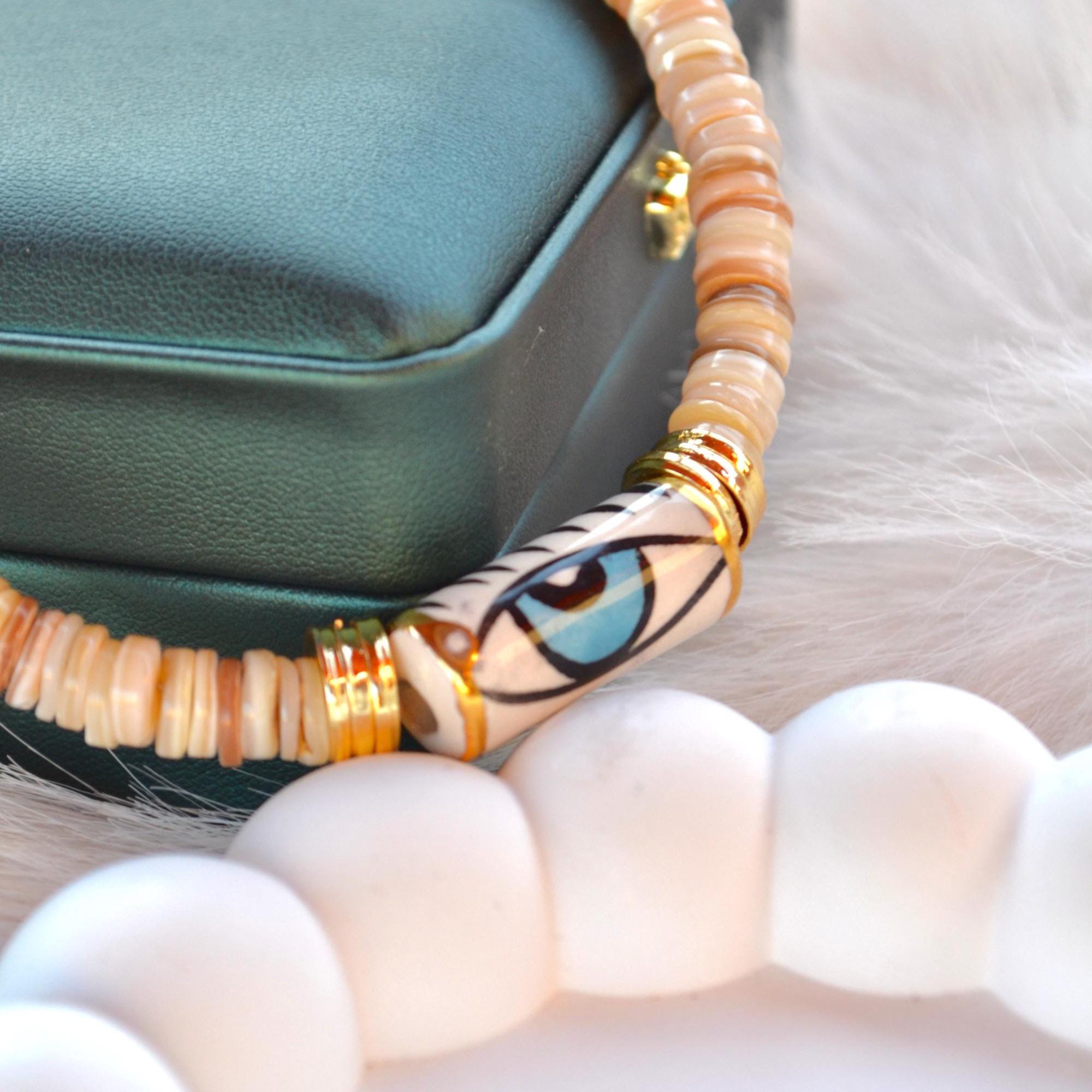 A small evil eye detail is added as a subtle accent, symbolizing protection while keeping the overall design elegant and understated.