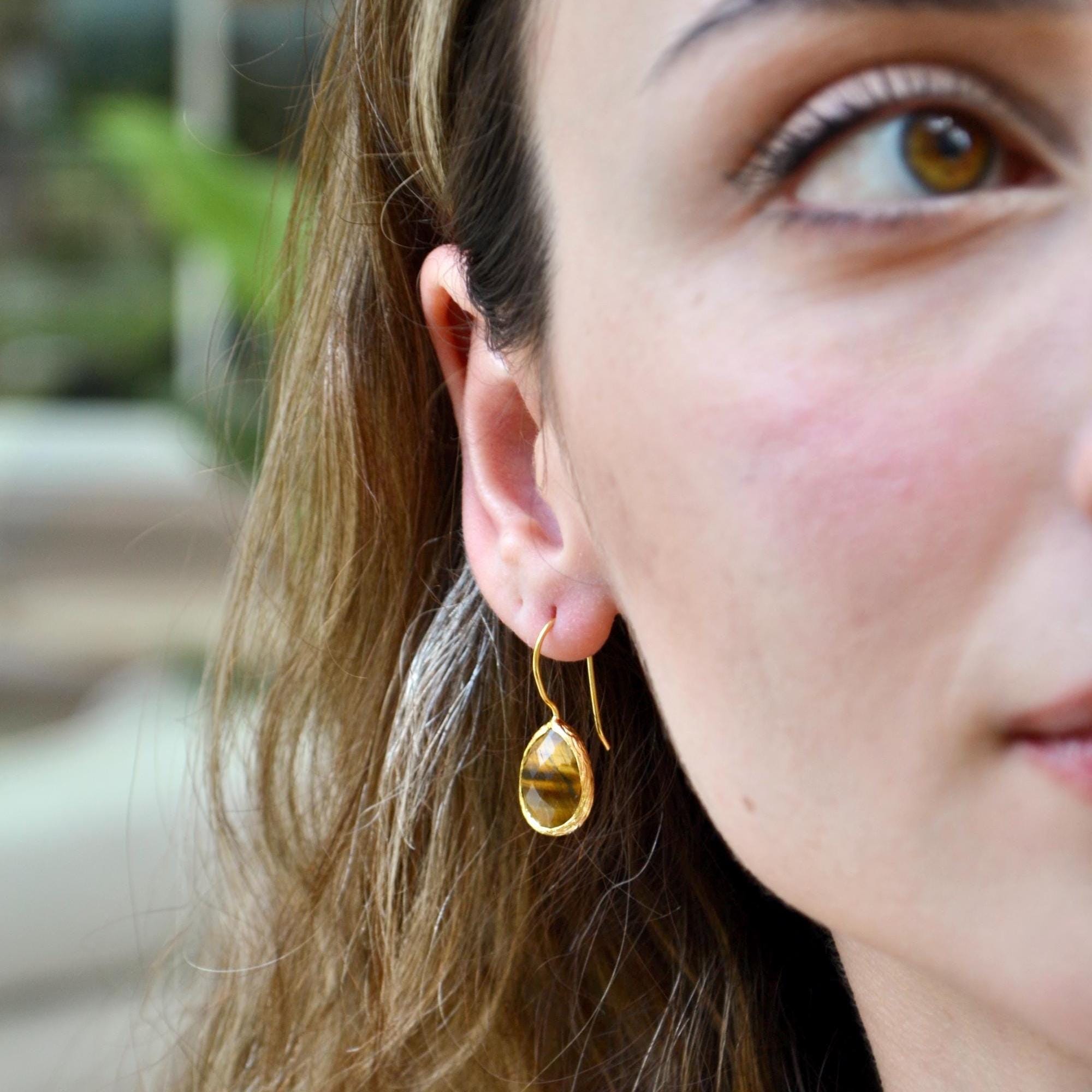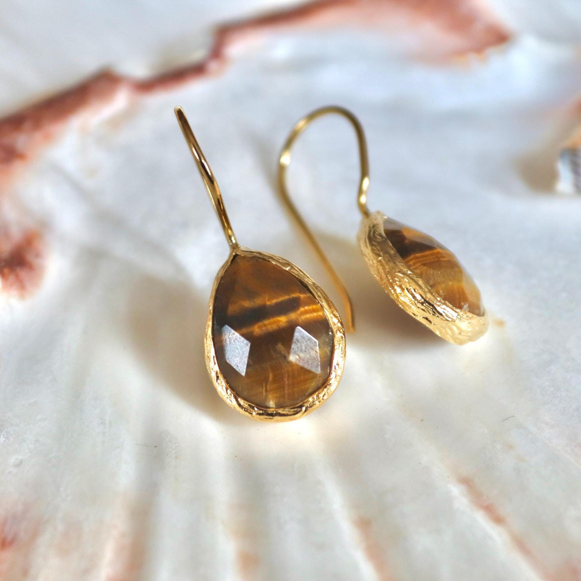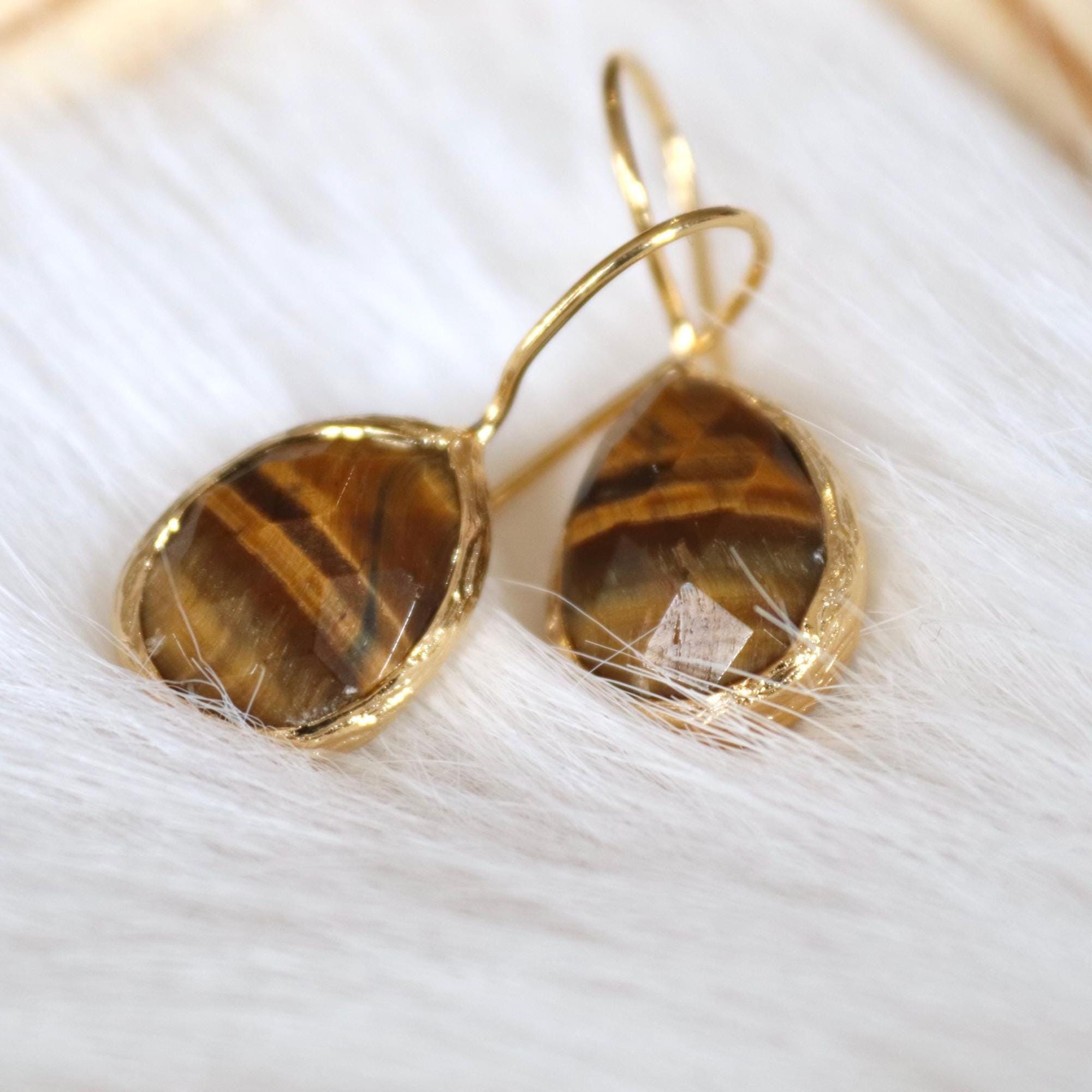 Tiger’s Eye Teardrop Earrings, 22K Gold Plated Gemstone Jewelry, Handmade Boho Dangle Design