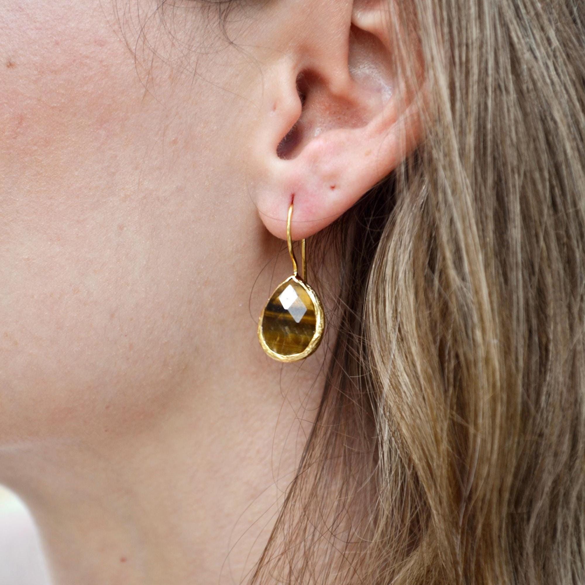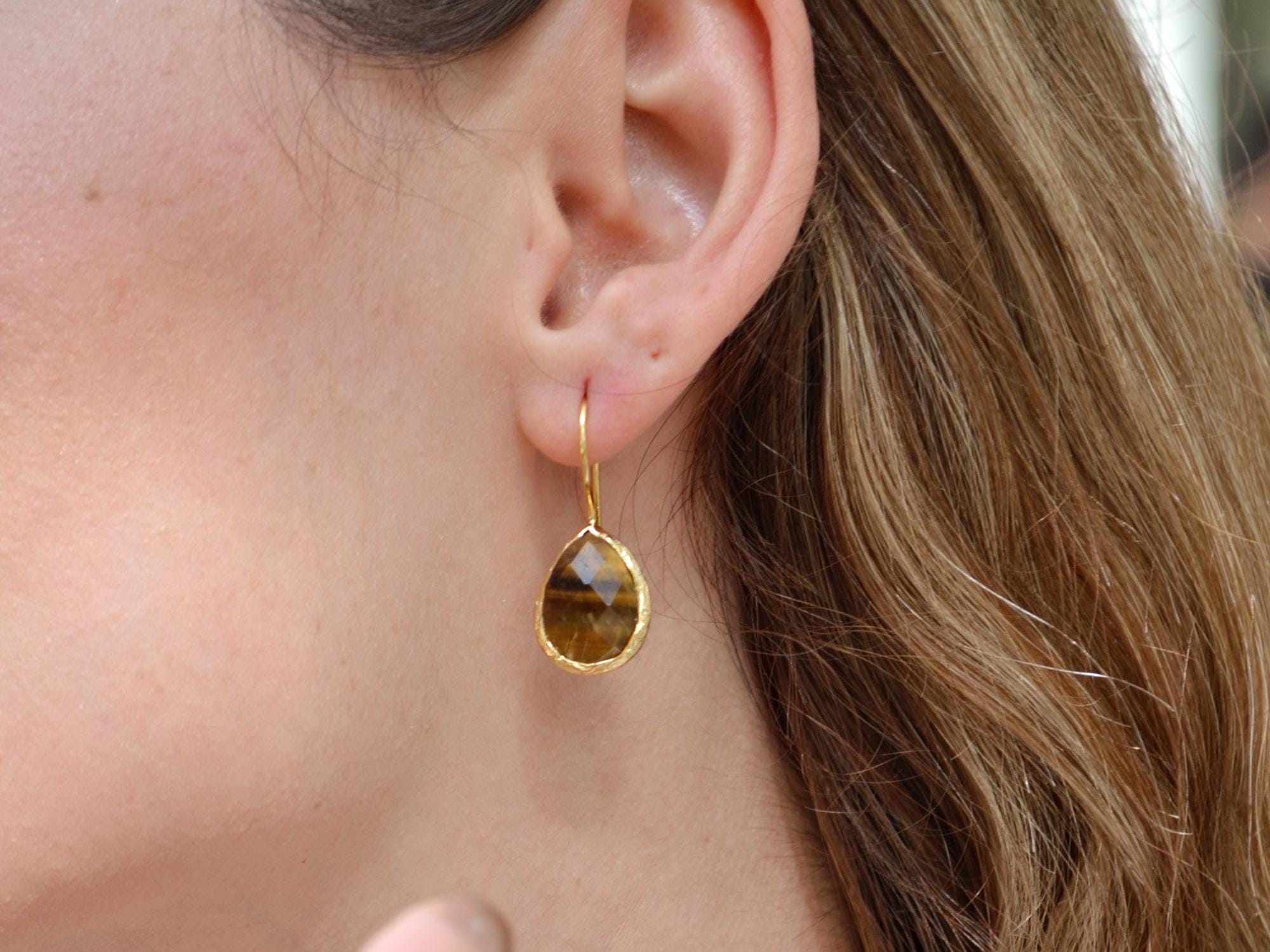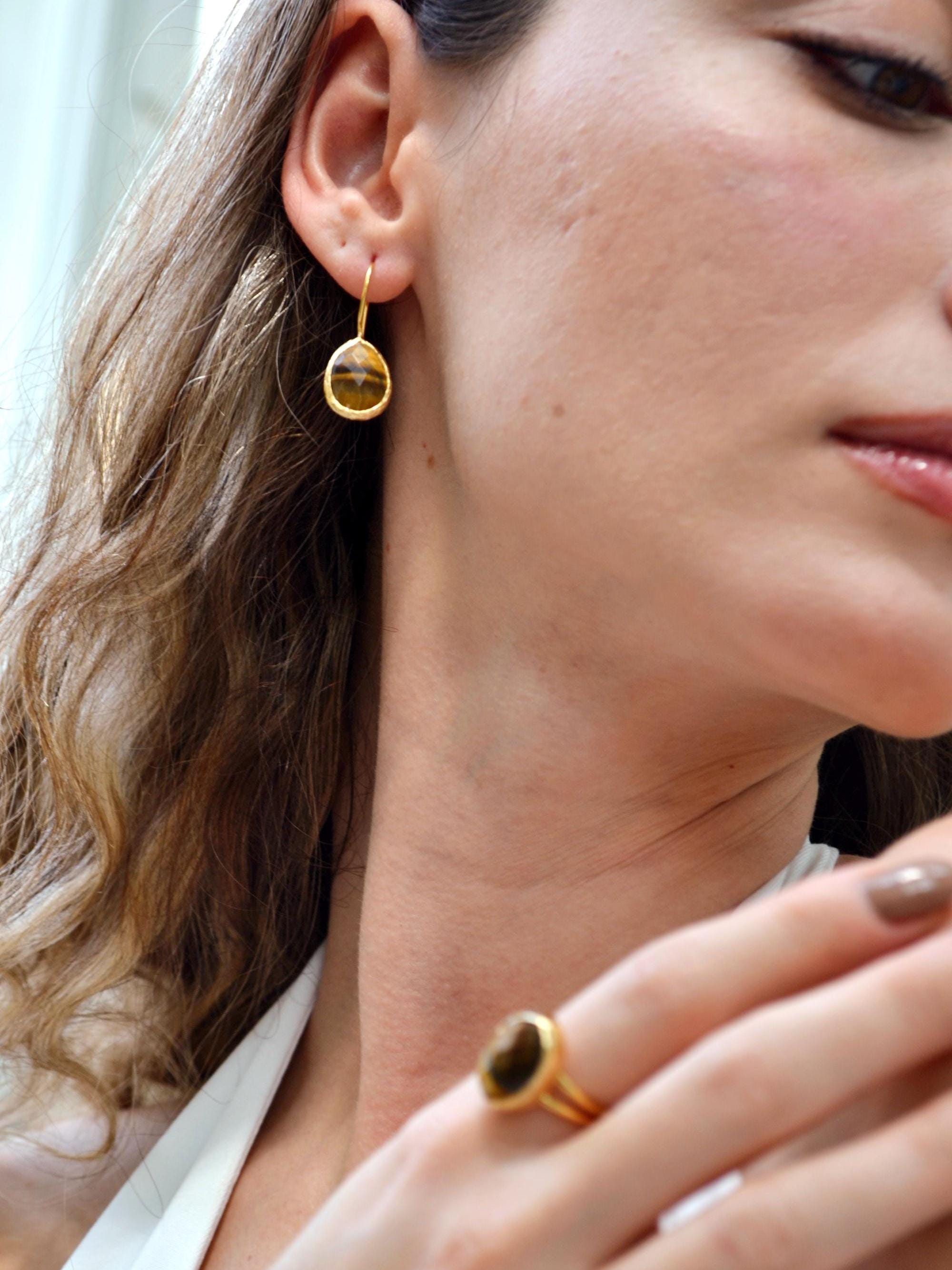 Tiger’s Eye Teardrop Earrings, 22K Gold Plated Gemstone Jewelry, Handmade Boho Dangle Design