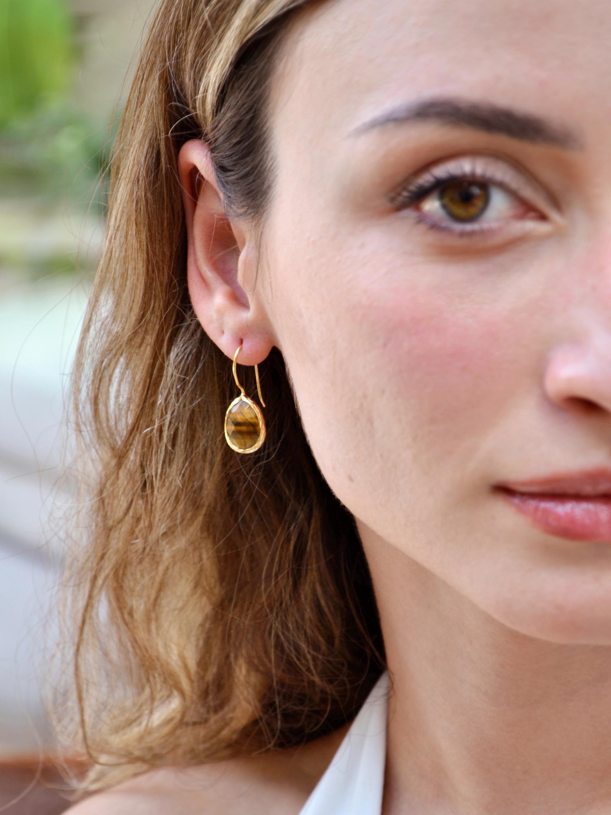 These handmade teardrop earrings feature genuine Tiger’s Eye gemstones, each showcasing unique bands of gold and brown that shimmer beautifully in the light.