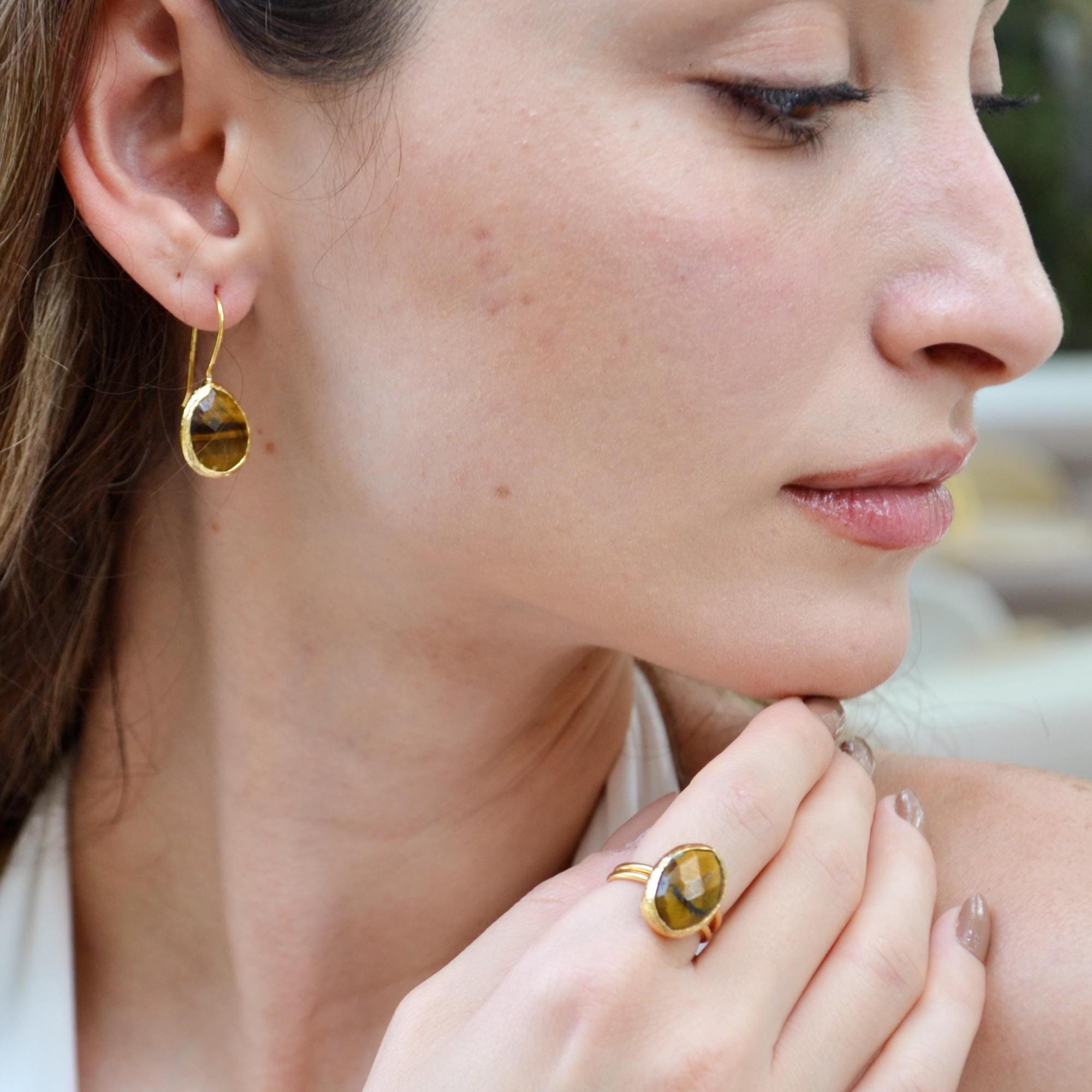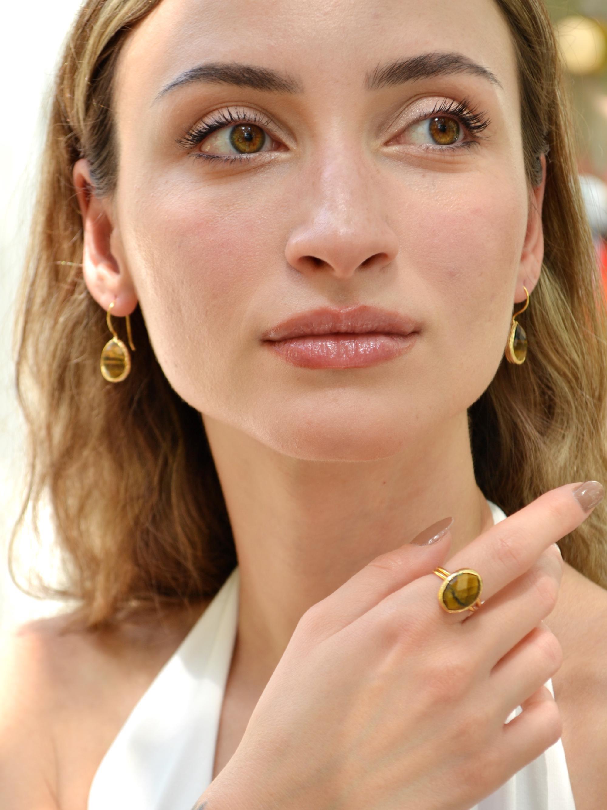 The stones are set in 22K gold-plated brass with a soft hammered texture, adding warmth and character to every piece.