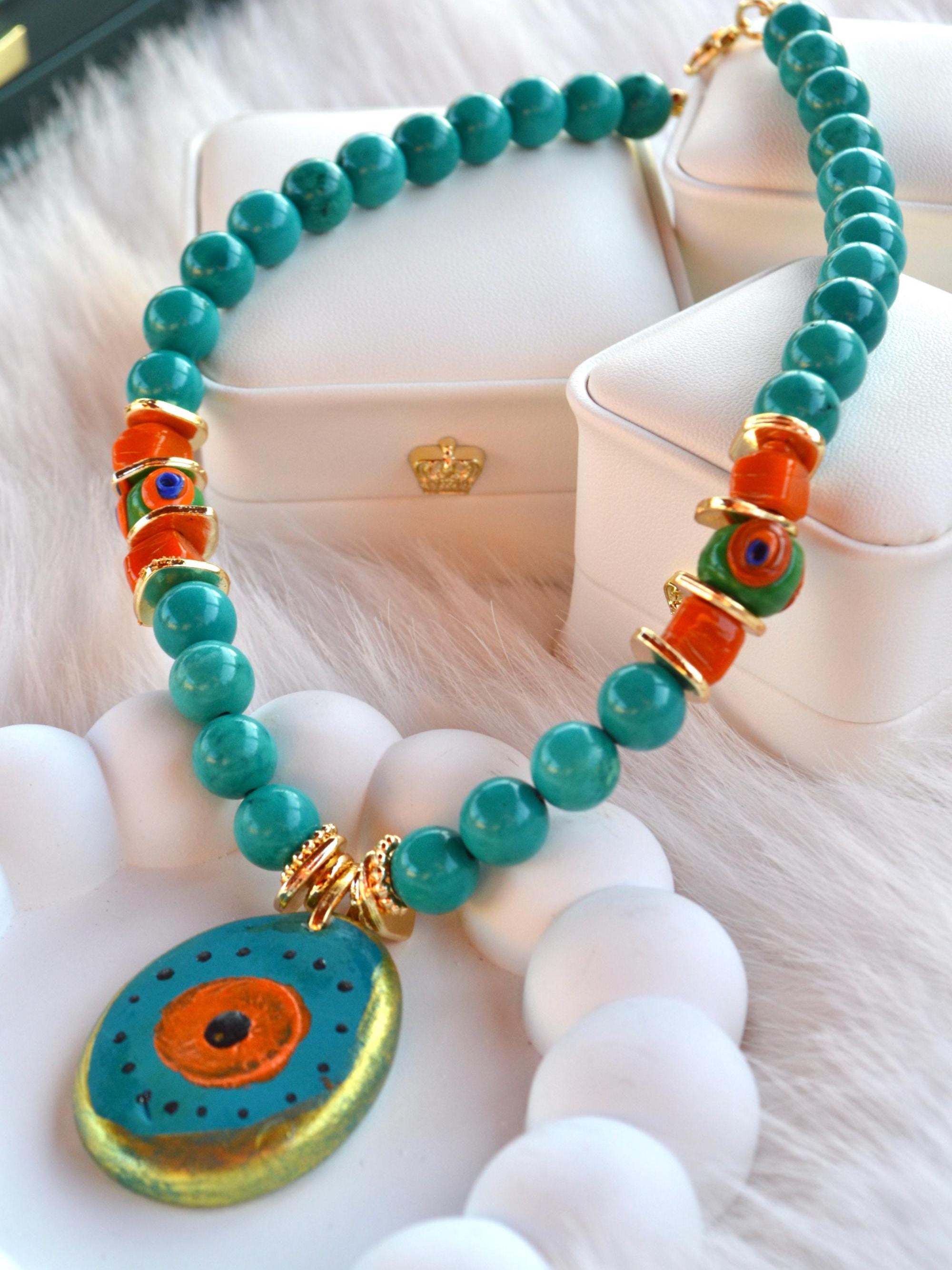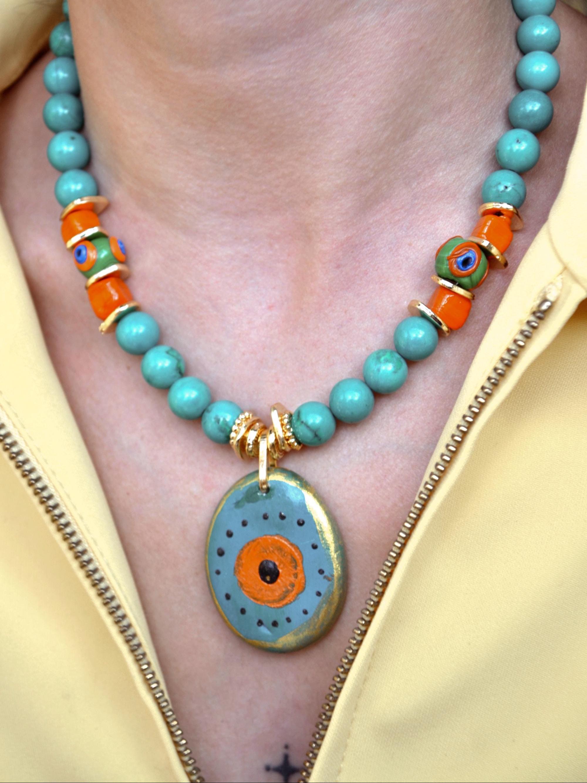 • Materials: Turquoise beads, hand-painted ceramic evil eye pendant, orange glass beads, 22K gold-plated brass spacers