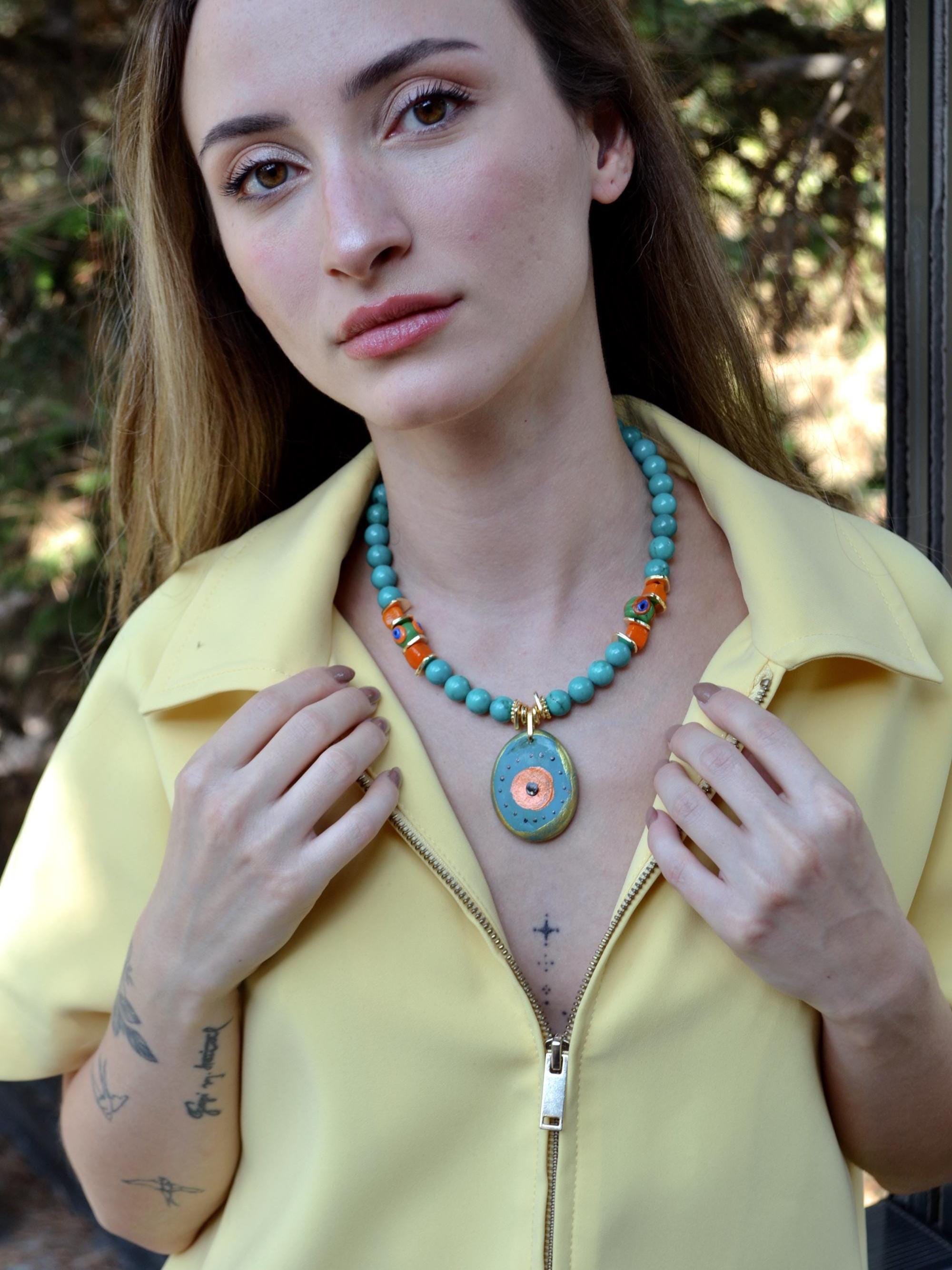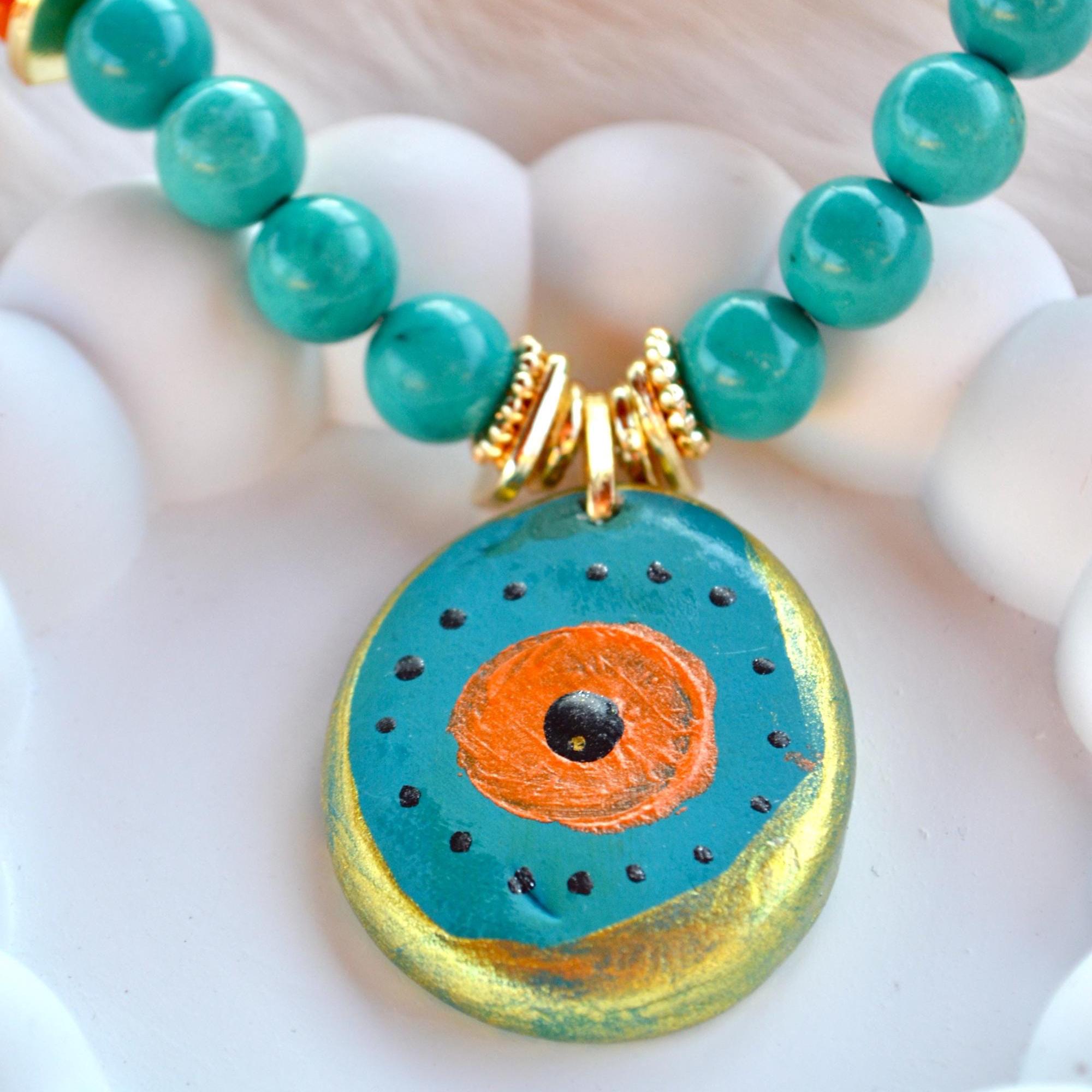 Turquoise Beaded Necklace with Ceramic Pendant, Boho Summer Statement Necklace