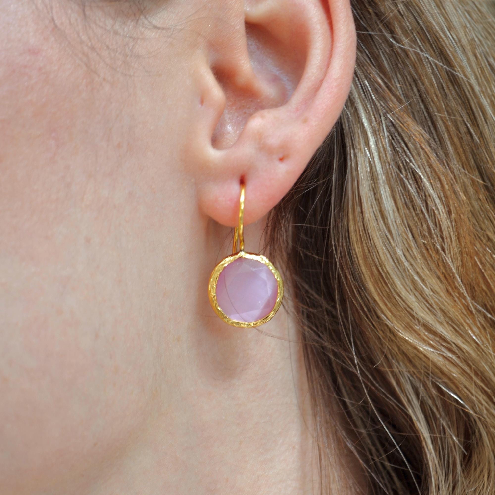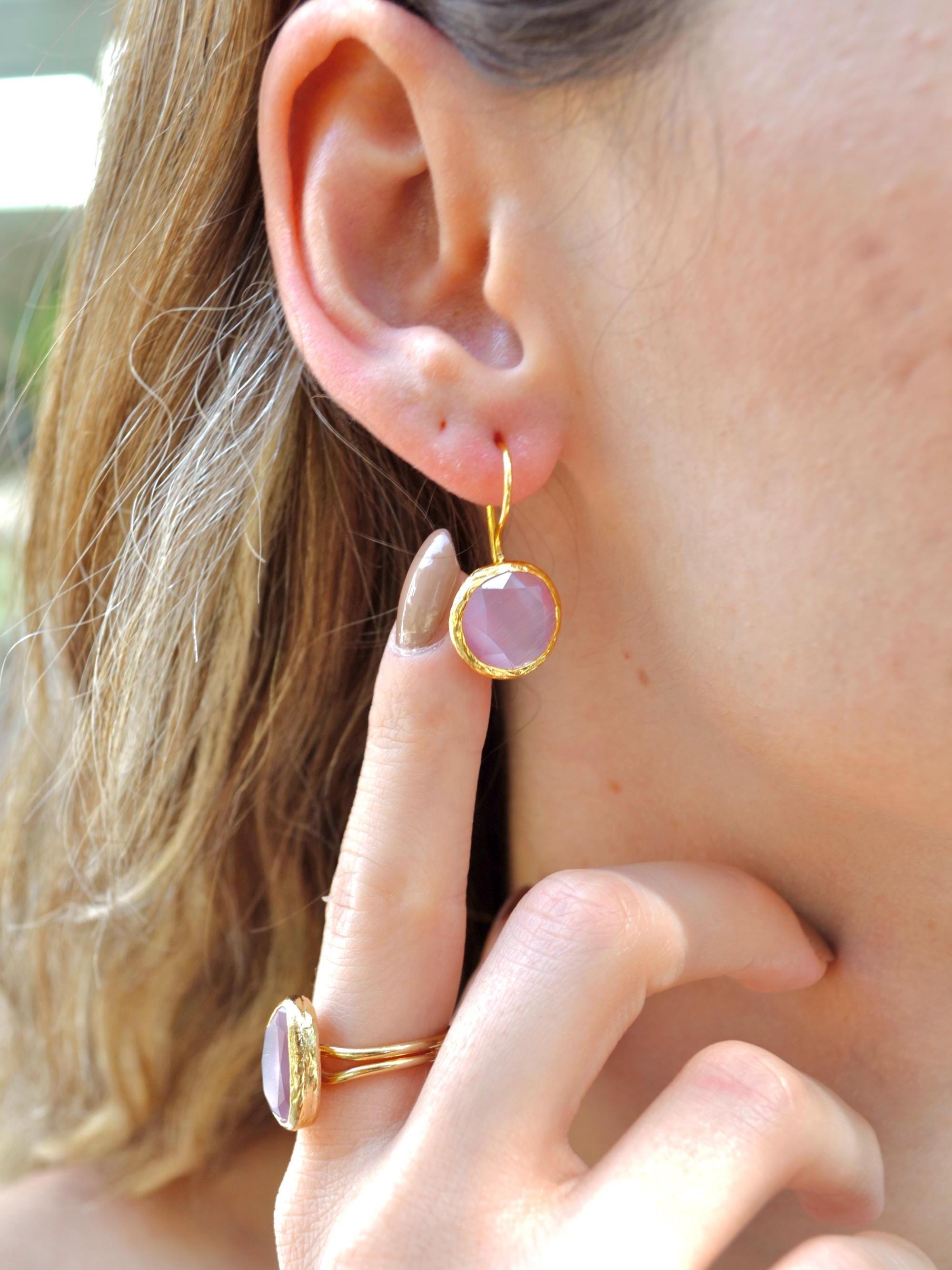 Featuring faceted rose quartz stones framed in 22K gold plated brass, each piece is handmade with care, giving it a warm artisanal touch.