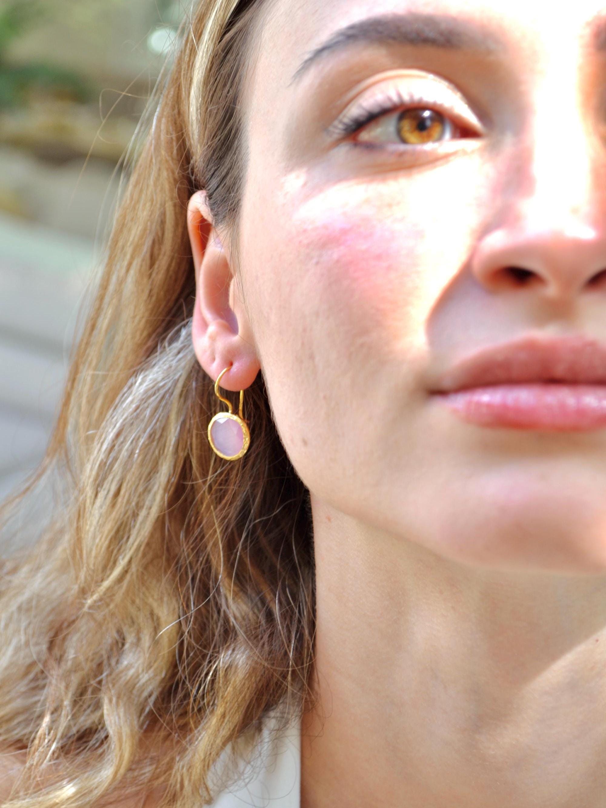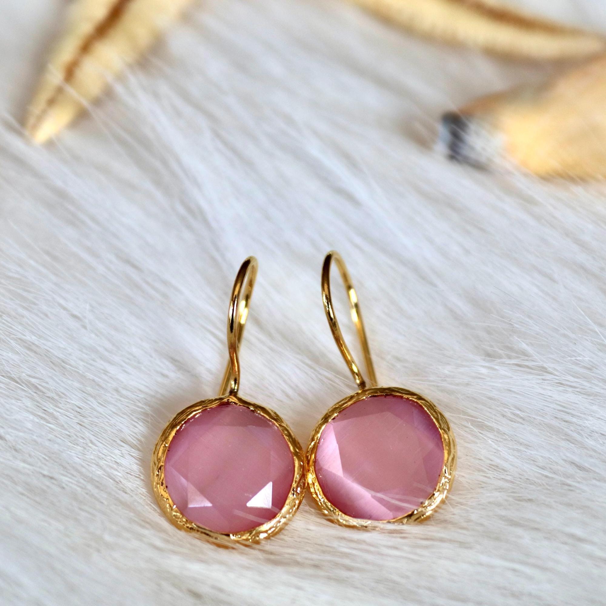 Rose Quartz Dangle Earrings, 22K Gold Plated Handmade Jewelry, Elegant Pink Gemstone Gift for Her