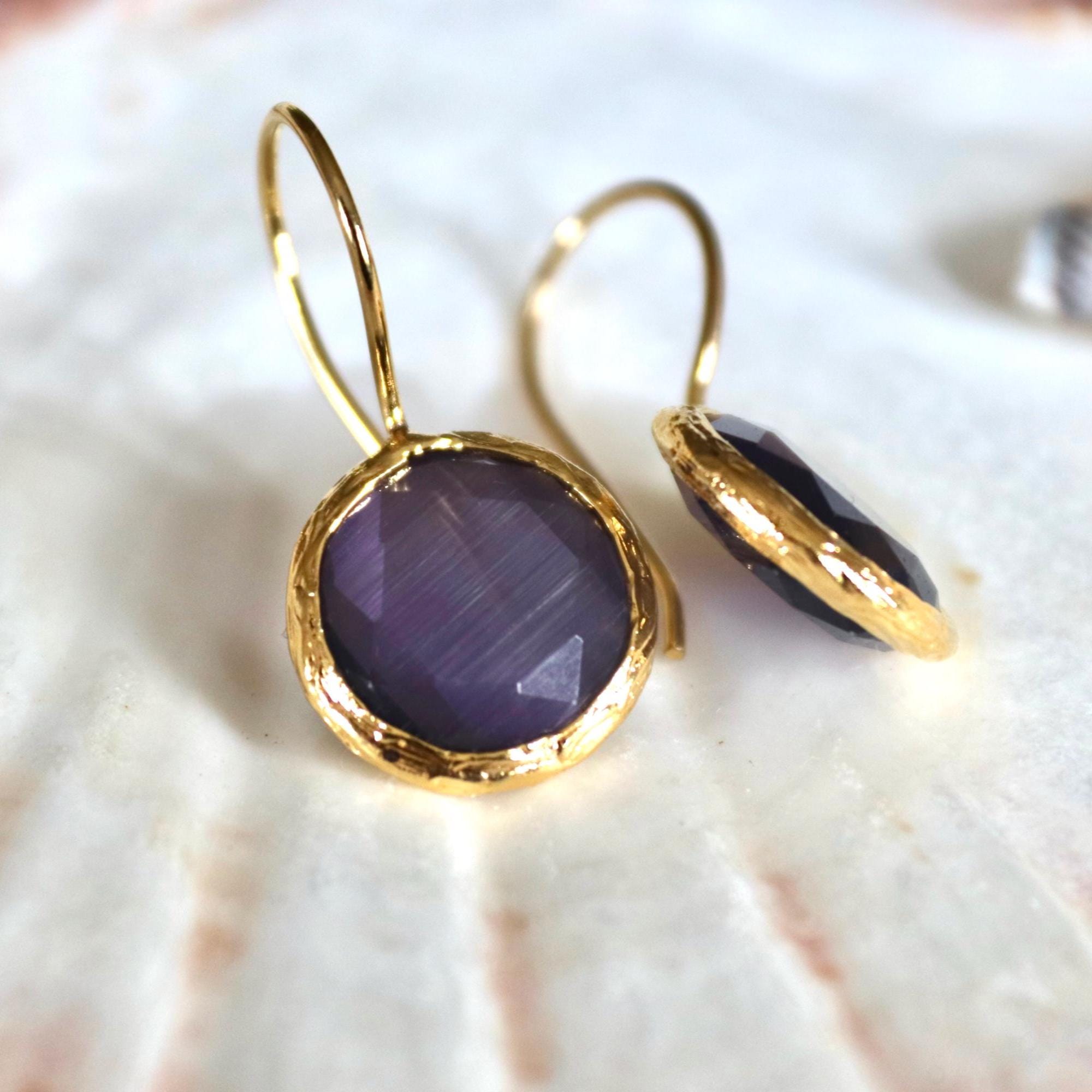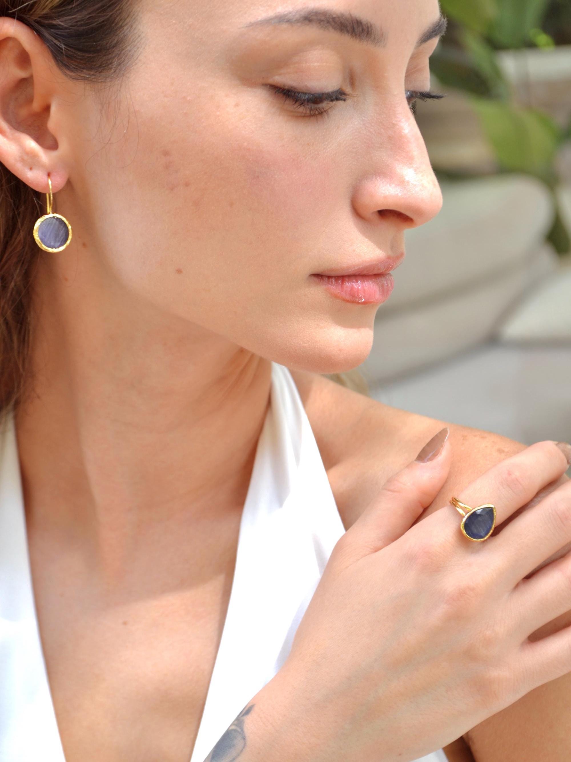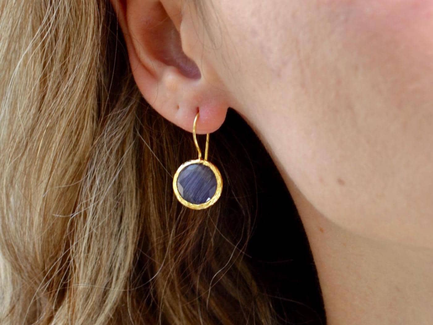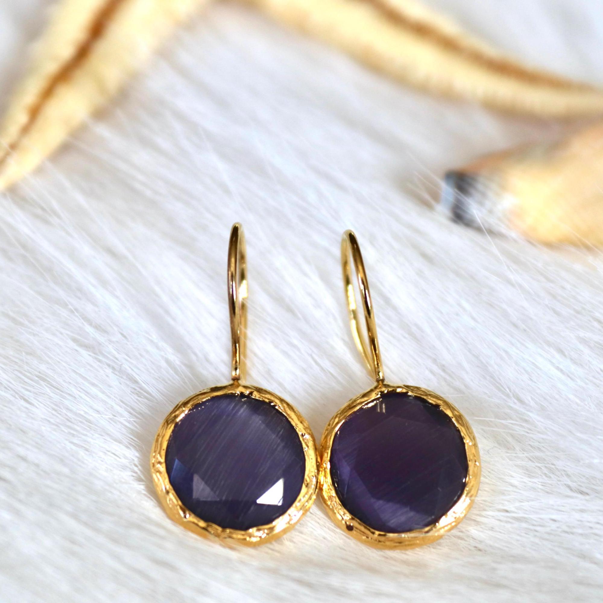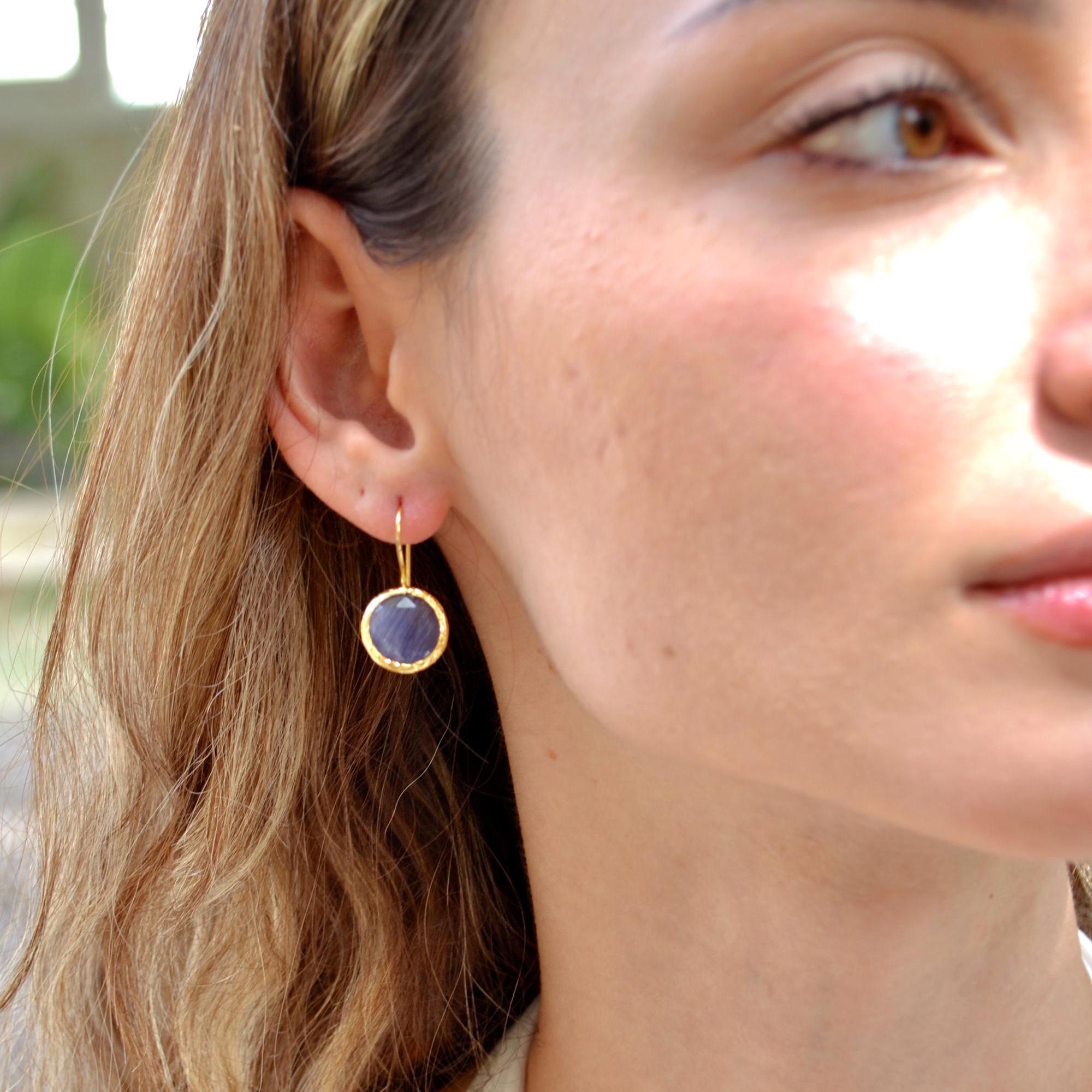 Blue Gemstone Drop Earrings, 22K Gold Plated Round Faceted Dangle Jewelry, Elegant Boho Gift for Her