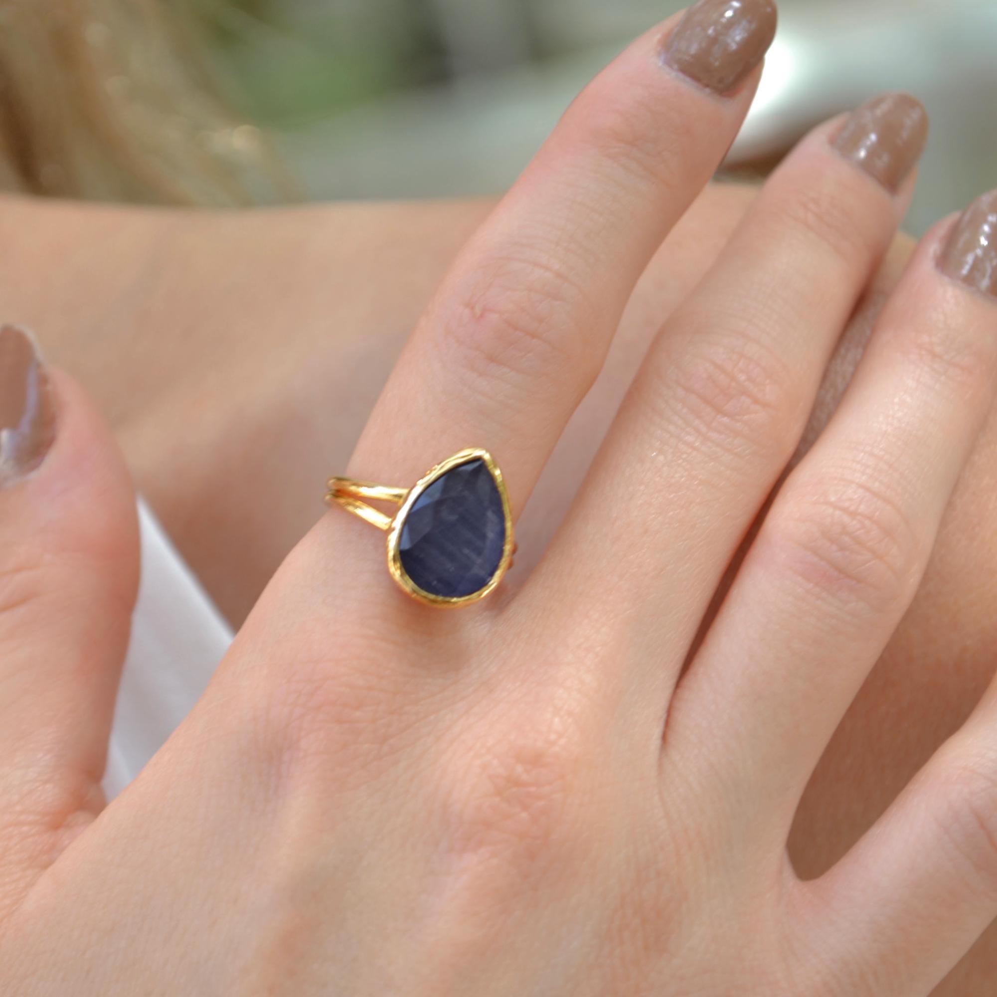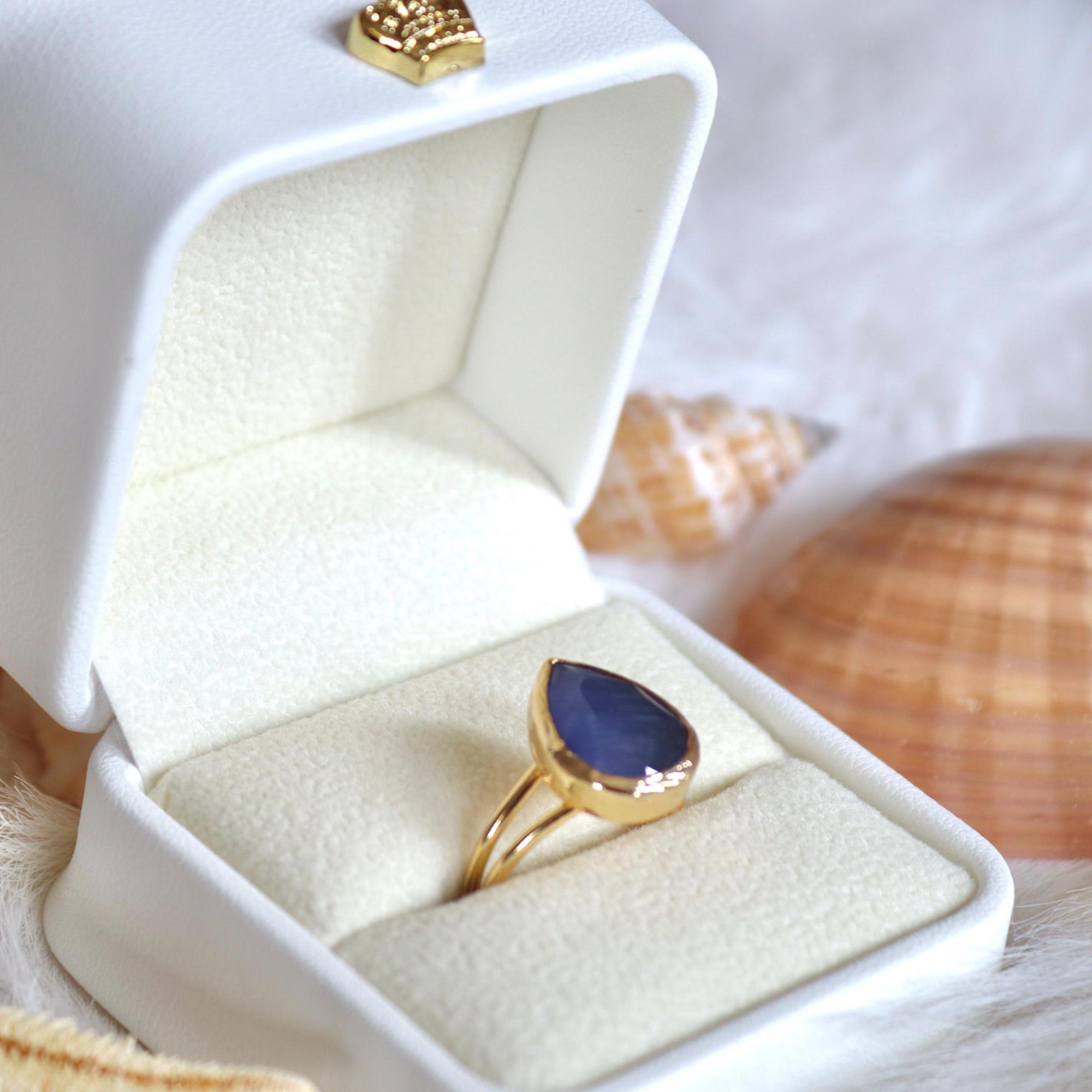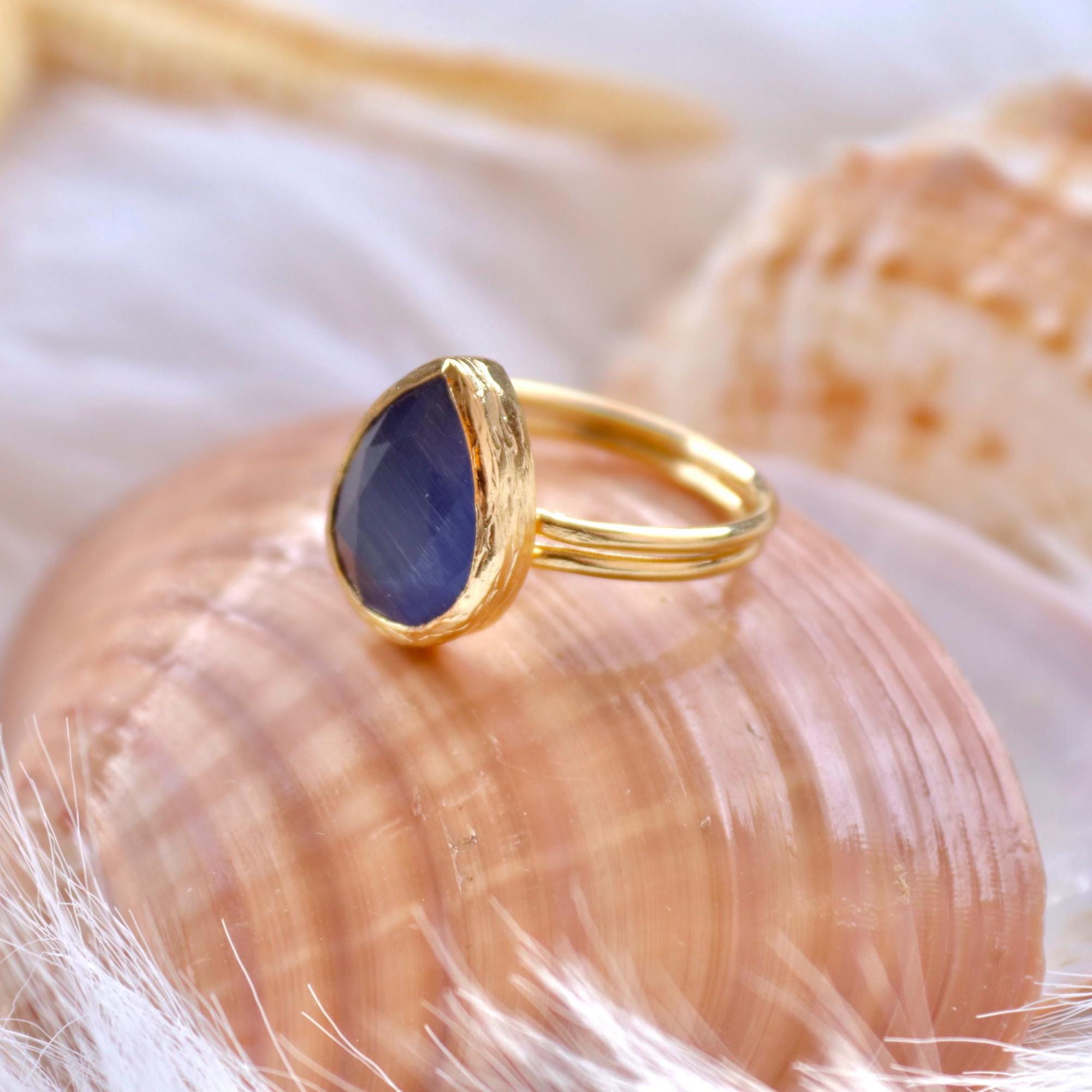 Blue Chalcedony Teardrop Ring, 22K Gold Plated Adjustable Gemstone Jewelry, Elegant Boho Gift for Her