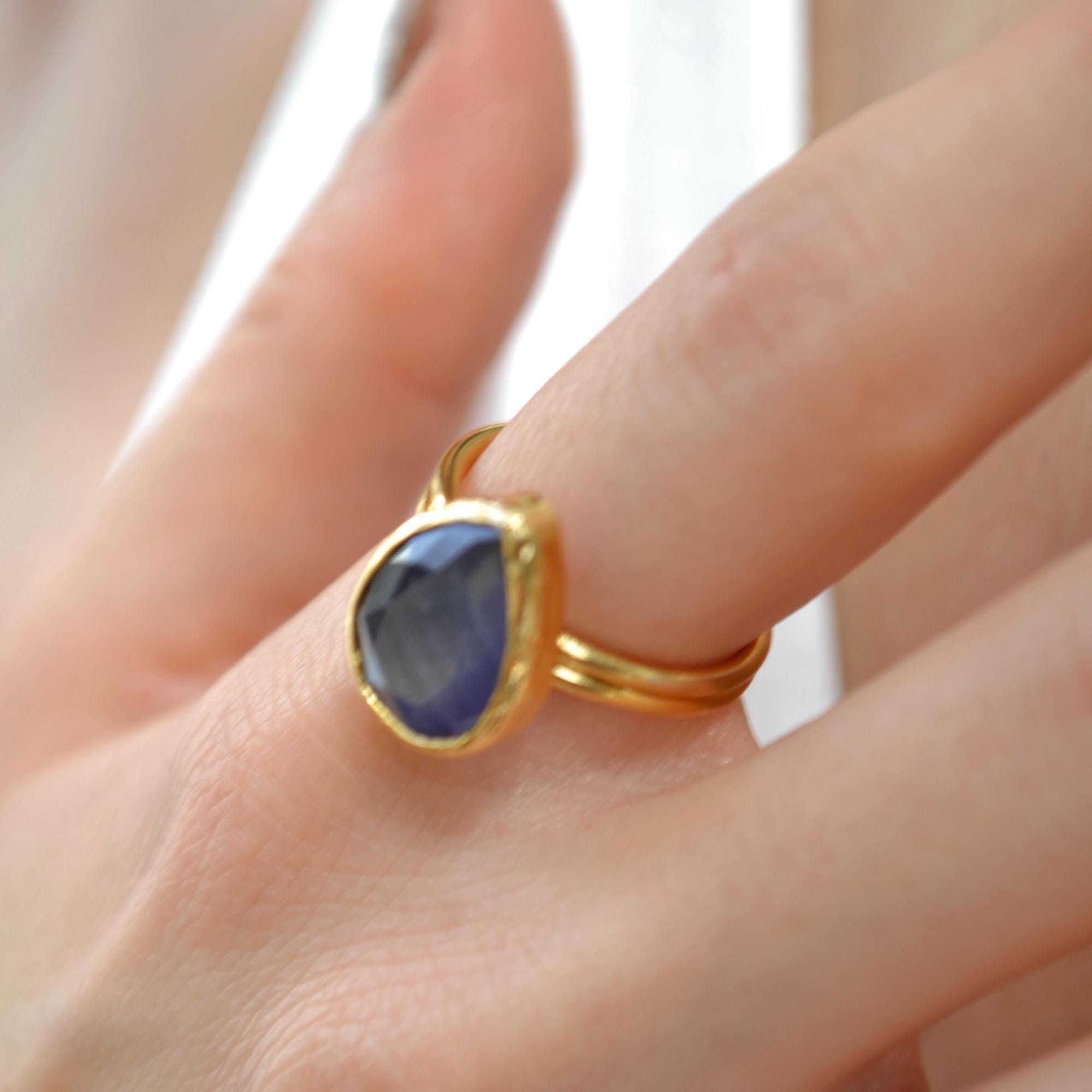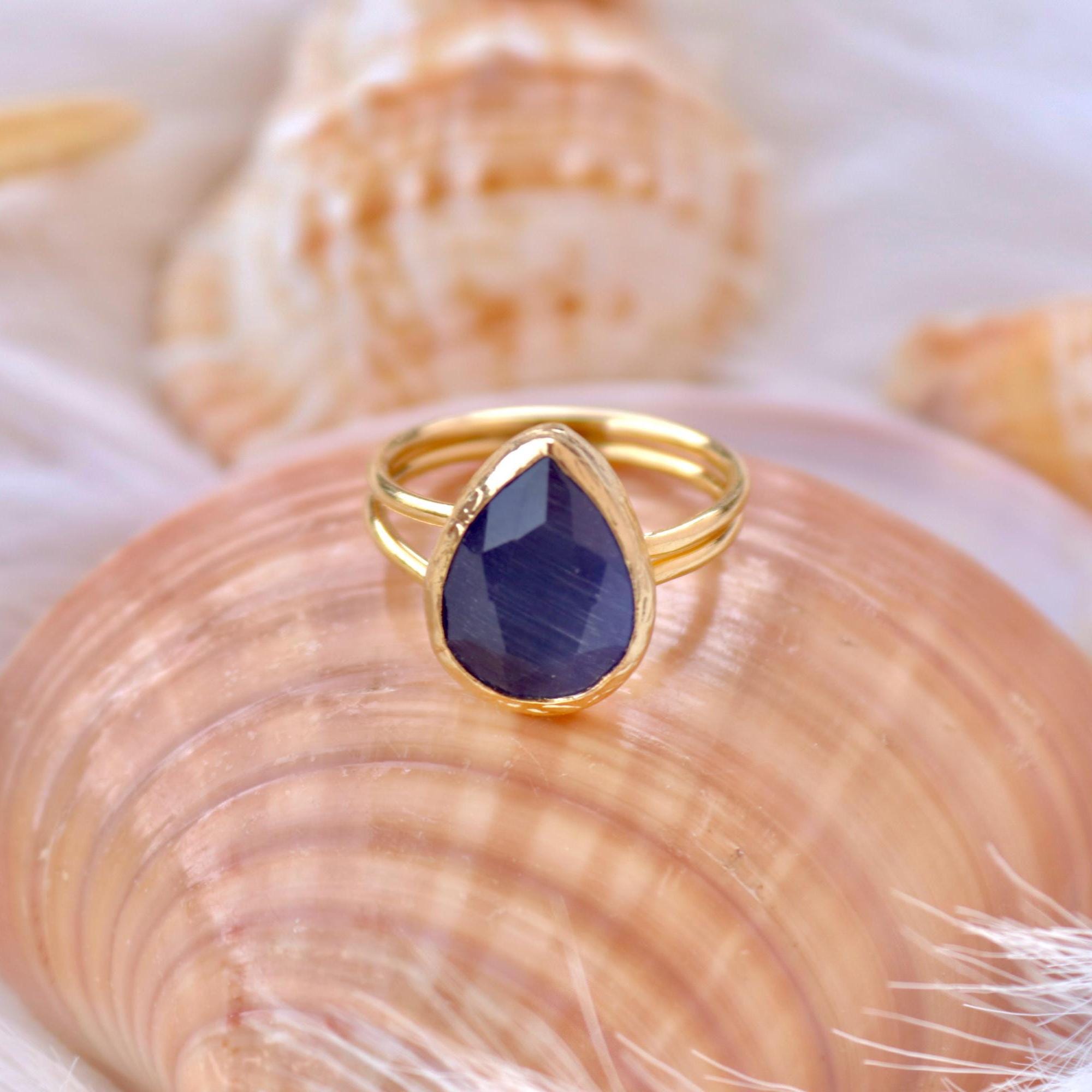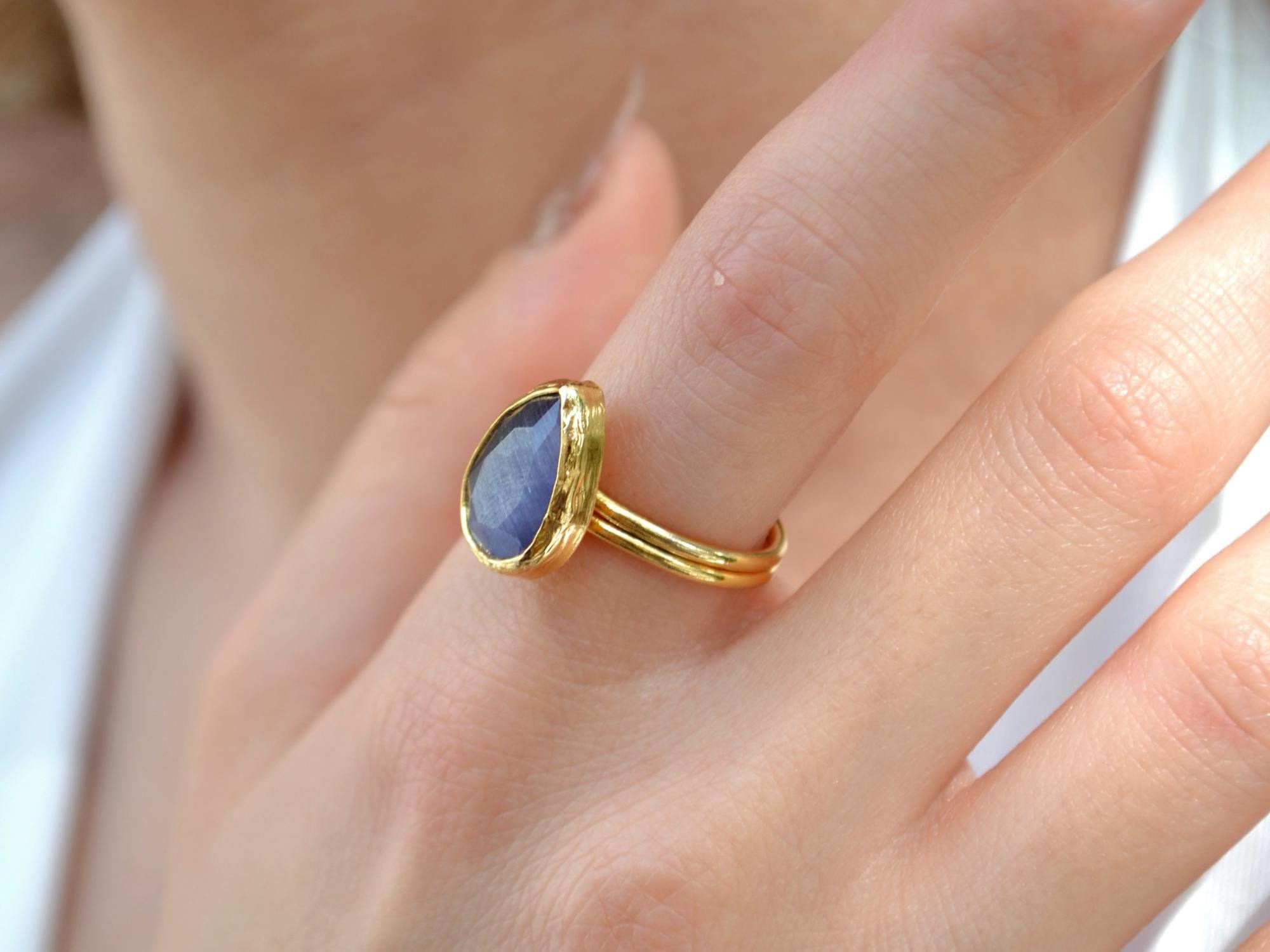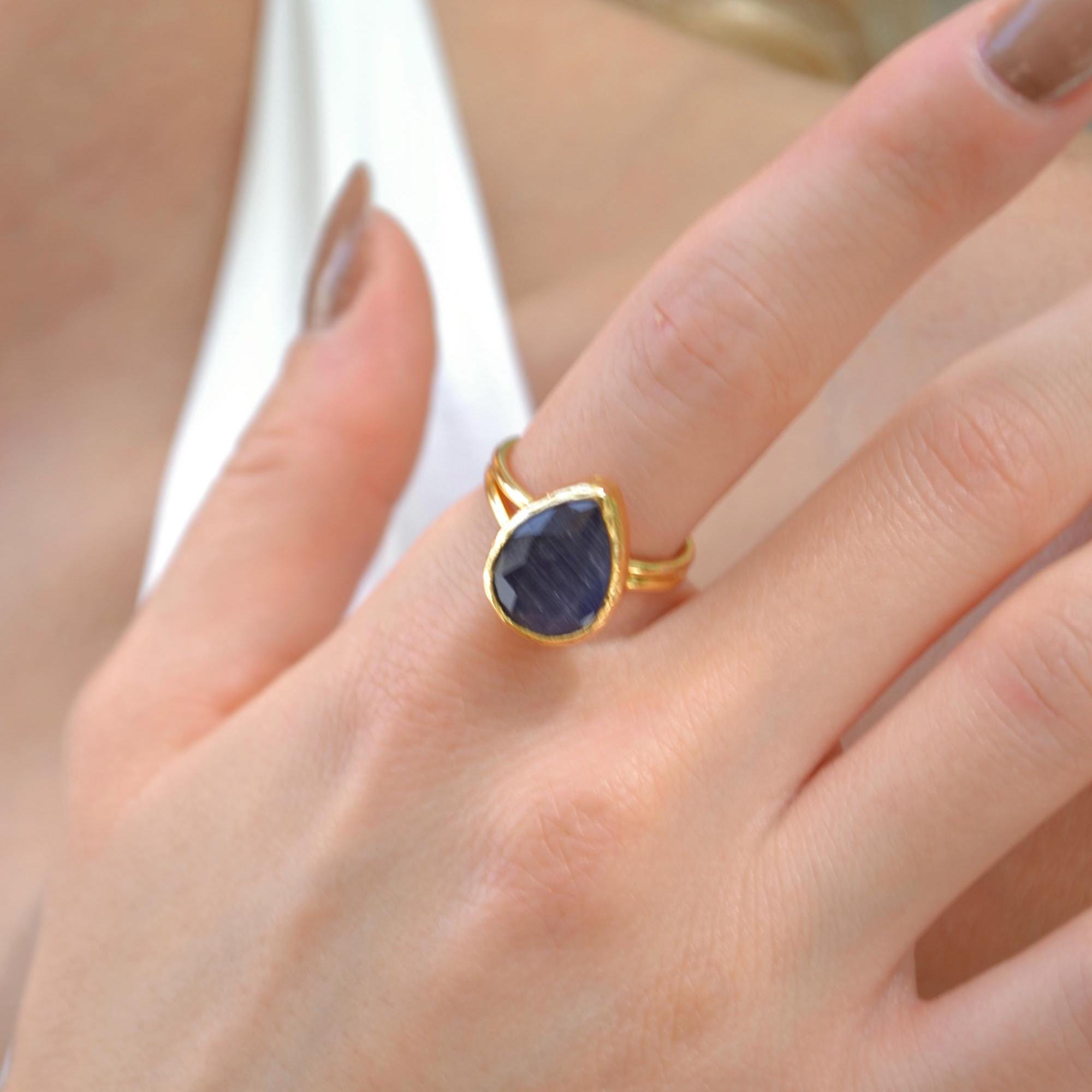 Blue Chalcedony Teardrop Ring, 22K Gold Plated Adjustable Gemstone Jewelry, Elegant Boho Gift for Her