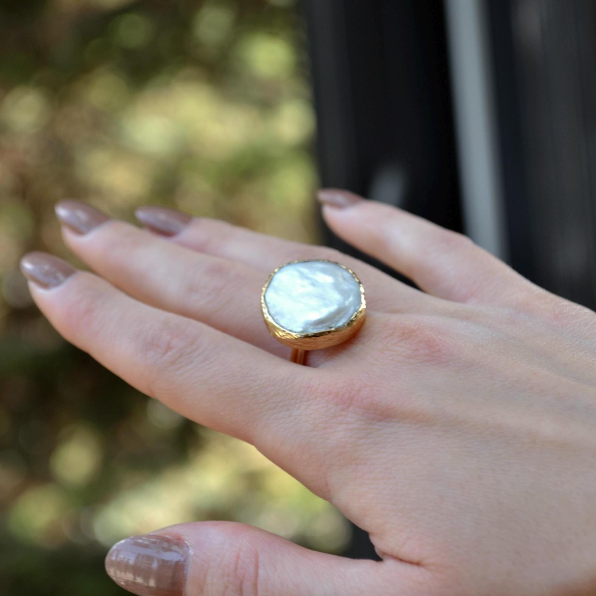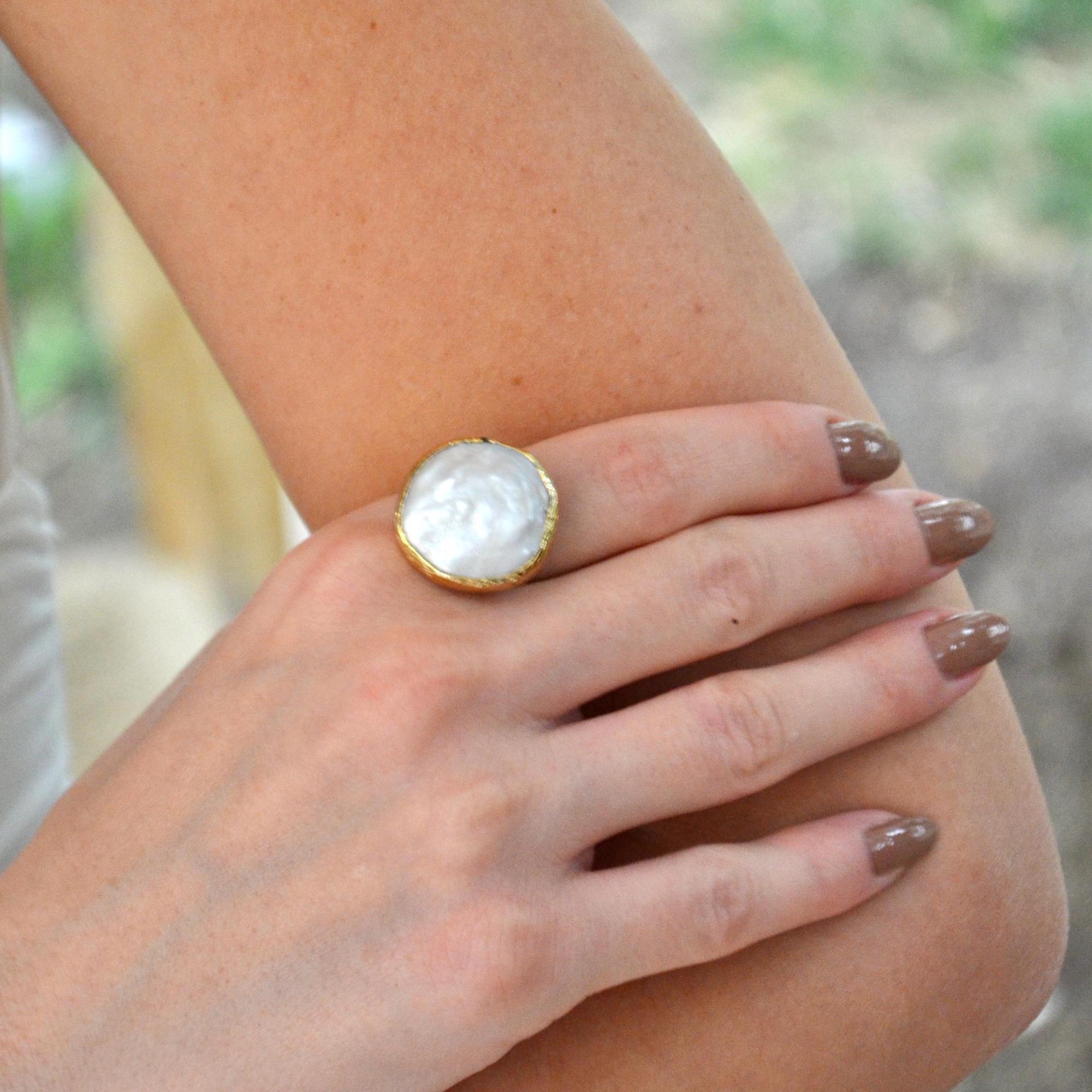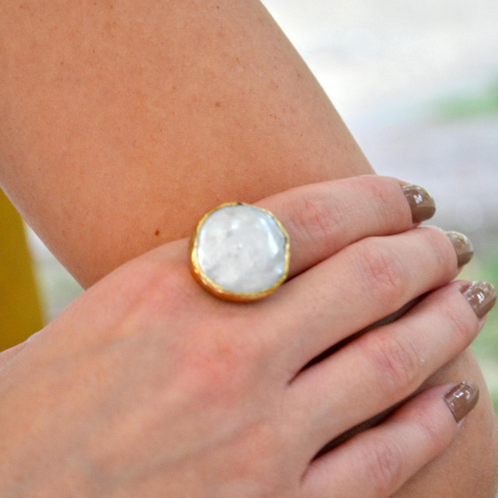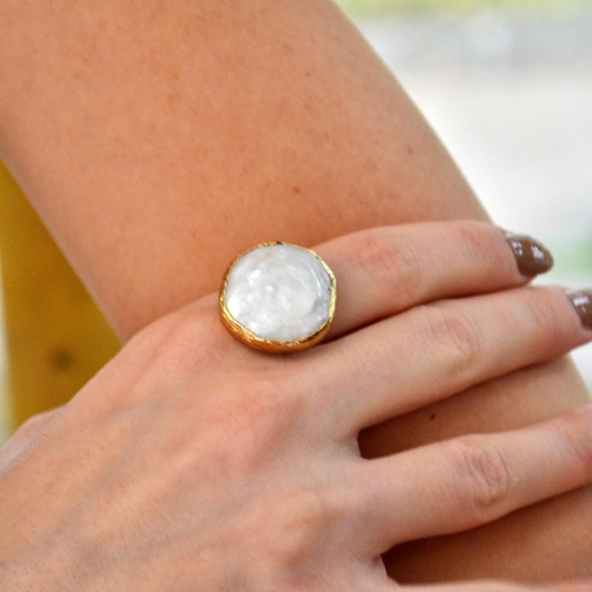Adjustable Pearl Statement Ring, 22K Gold Plated Brass, Handmade Coin Pearl Jewelry, Elegant Gift for Her