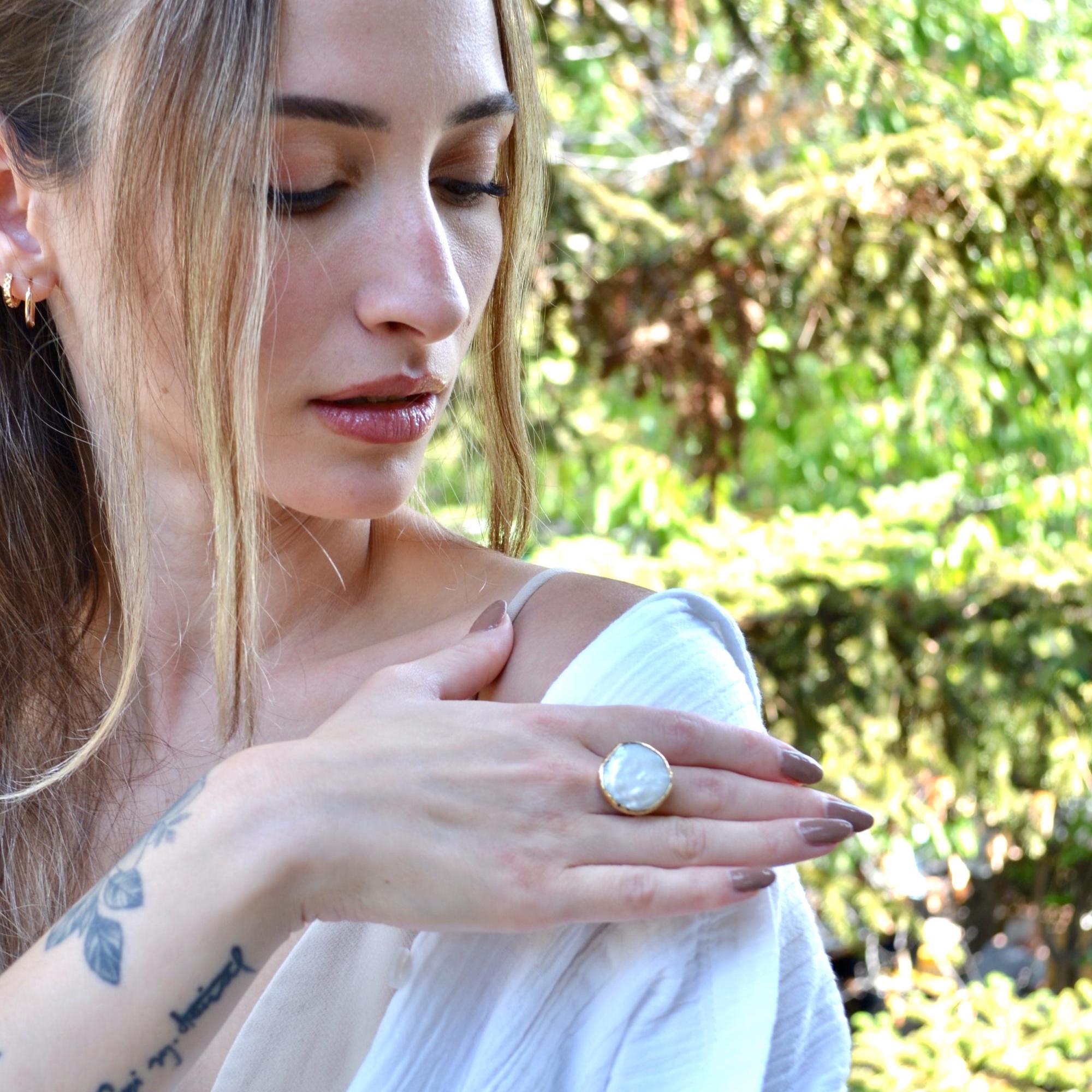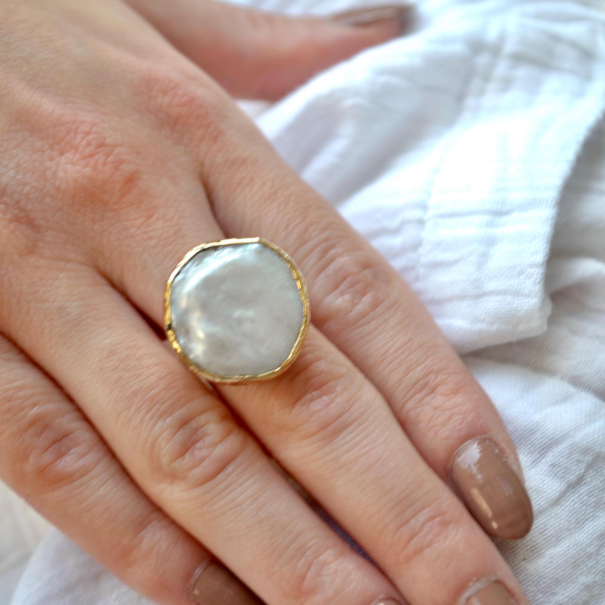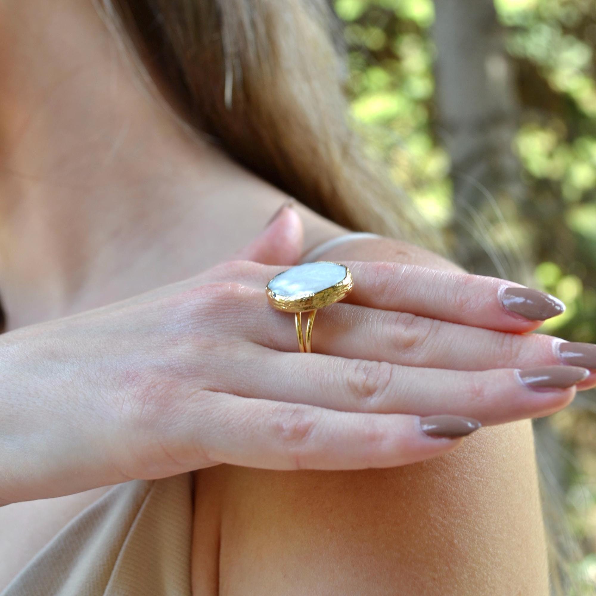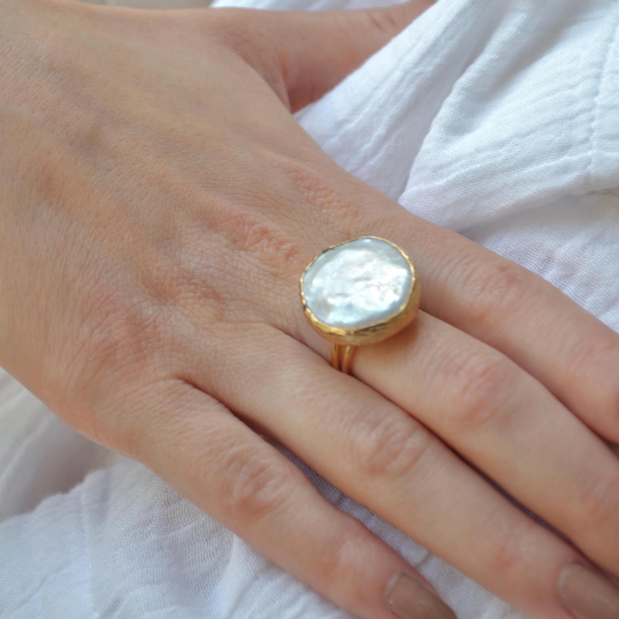Adjustable Pearl Statement Ring, 22K Gold Plated Brass, Handmade Coin Pearl Jewelry, Elegant Gift for Her