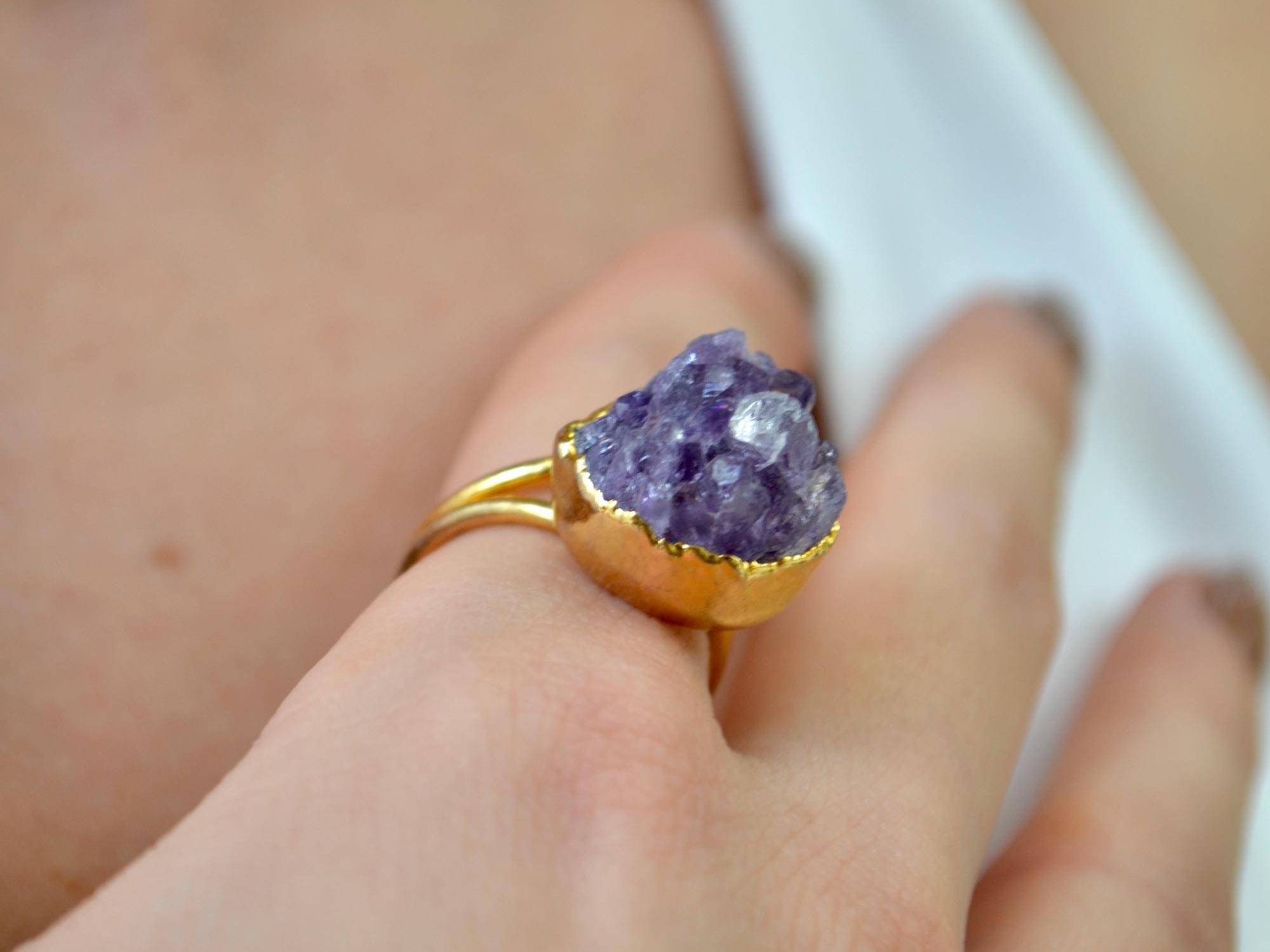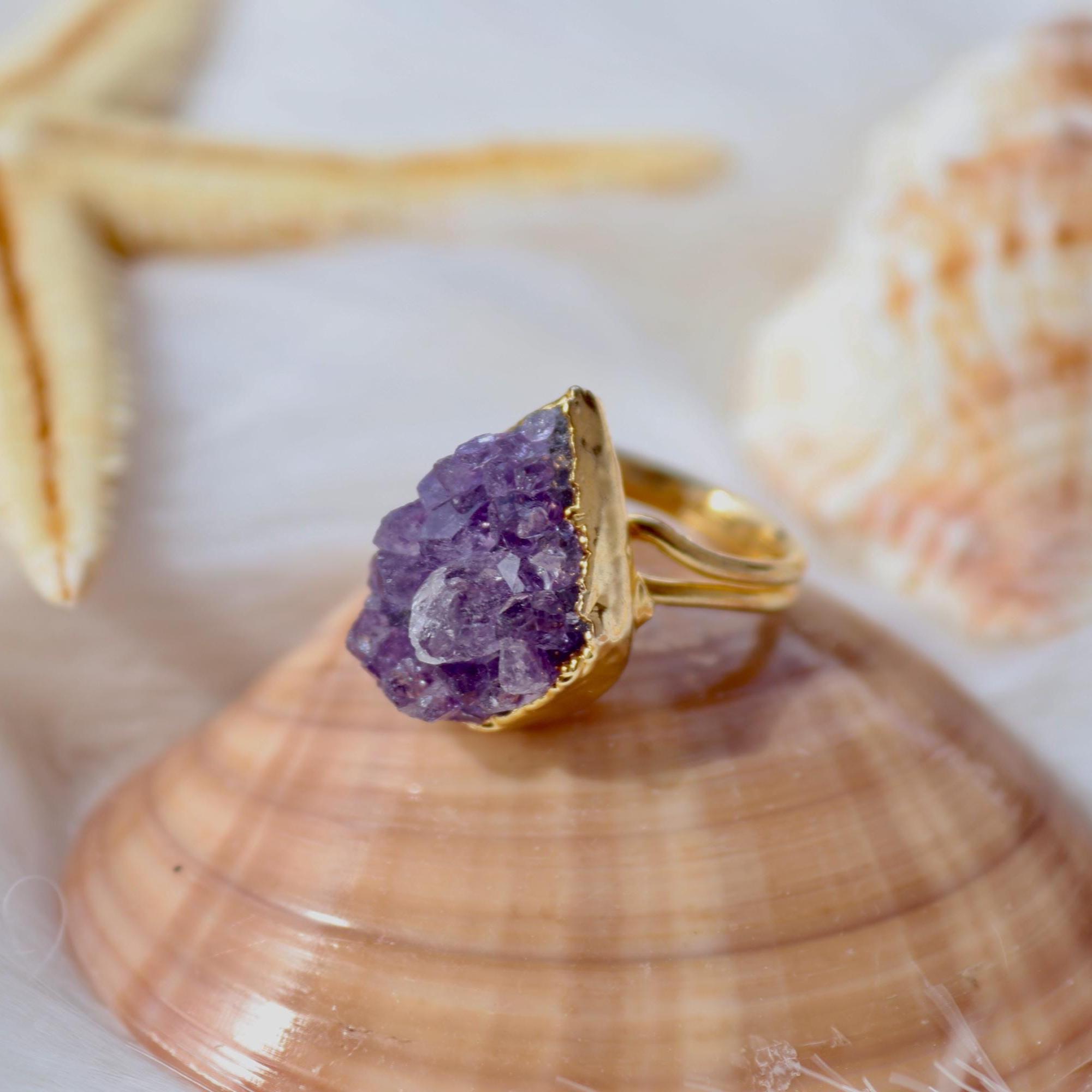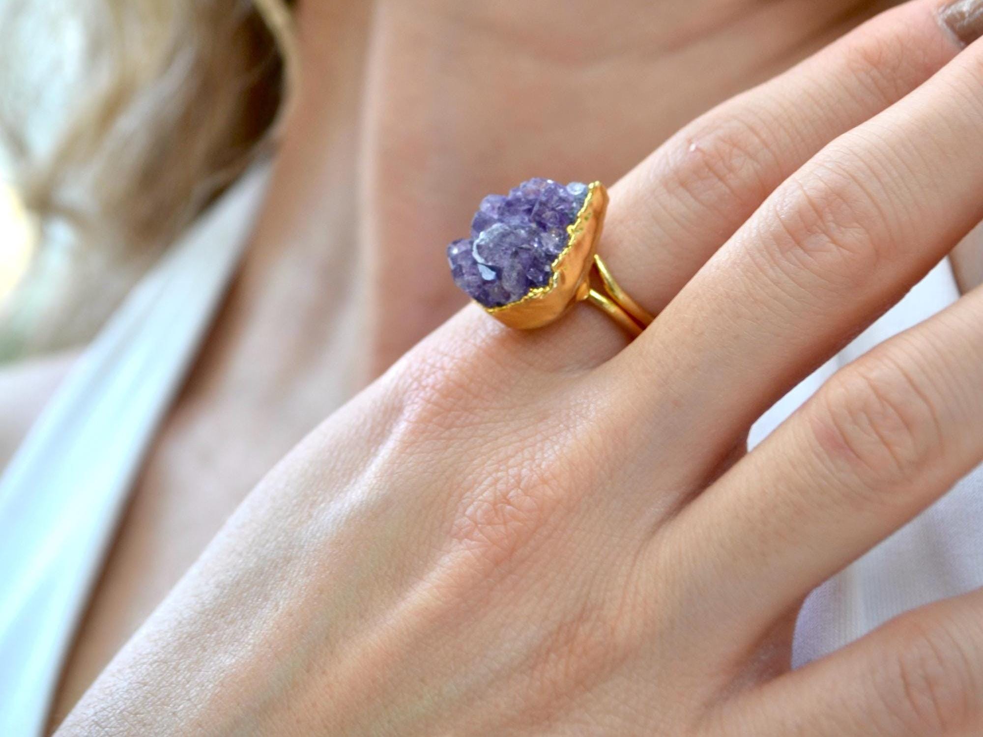 Raw Amethyst Adjustable Ring, Handmade Natural Crystal Gold Plated Statement Jewelry, Boho Gemstone Gift for Her
