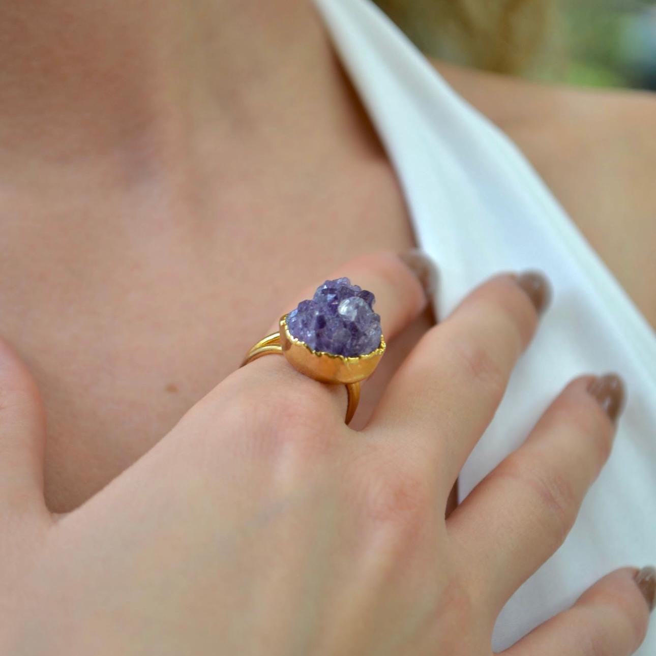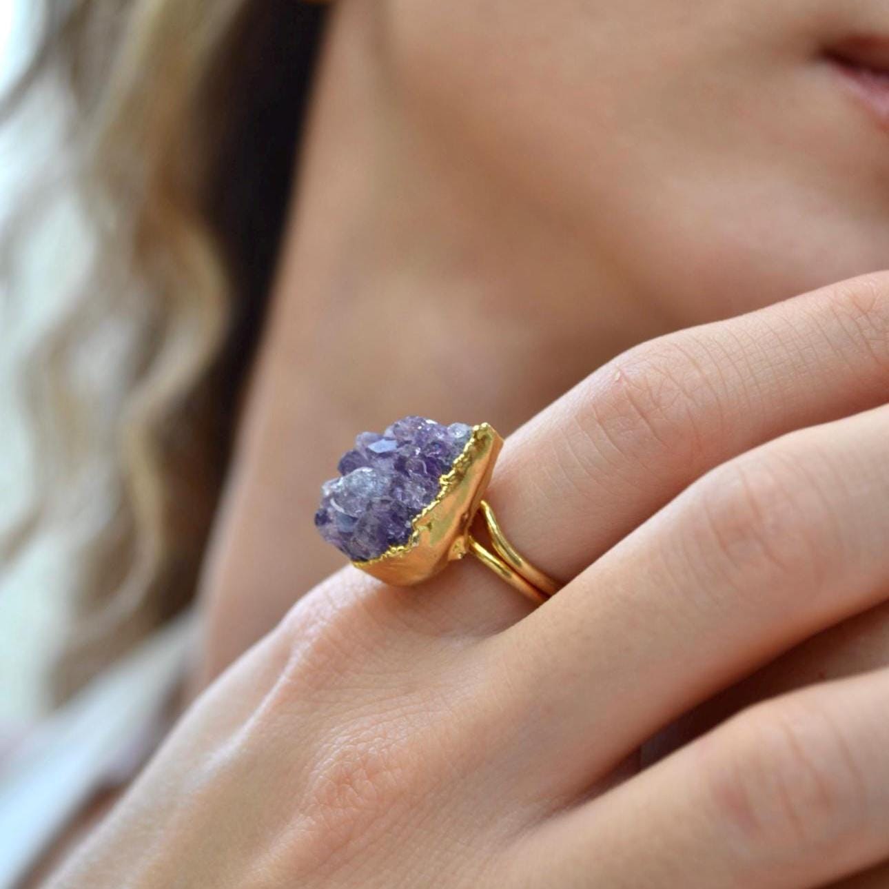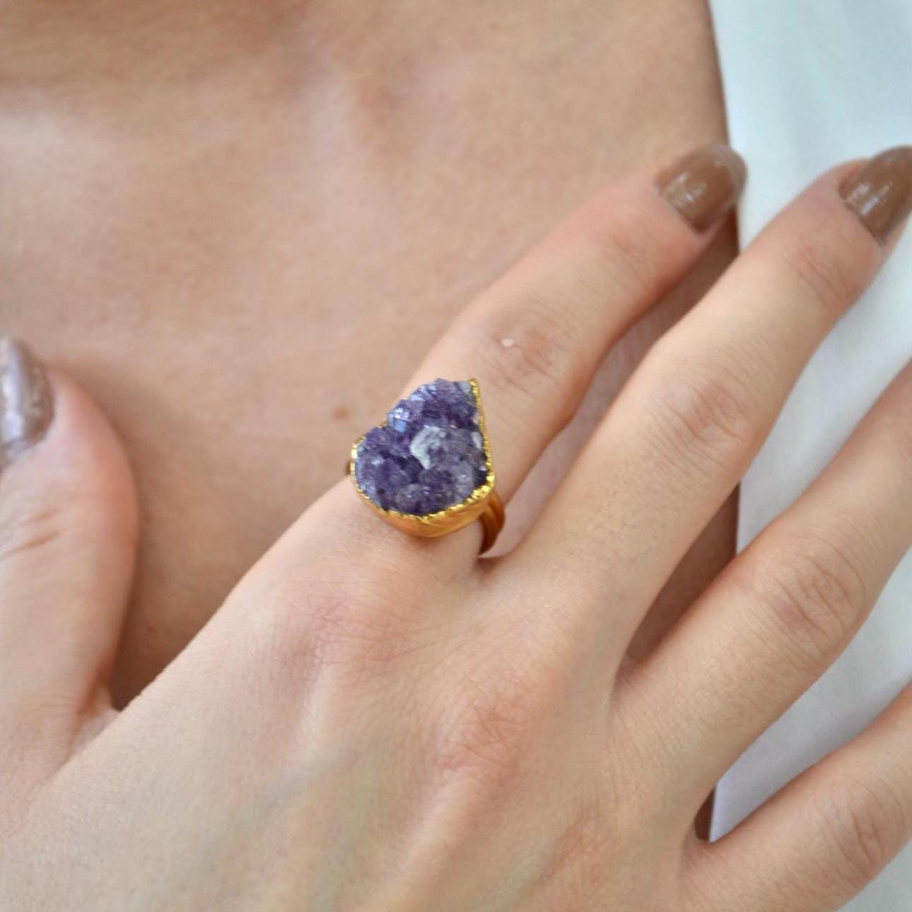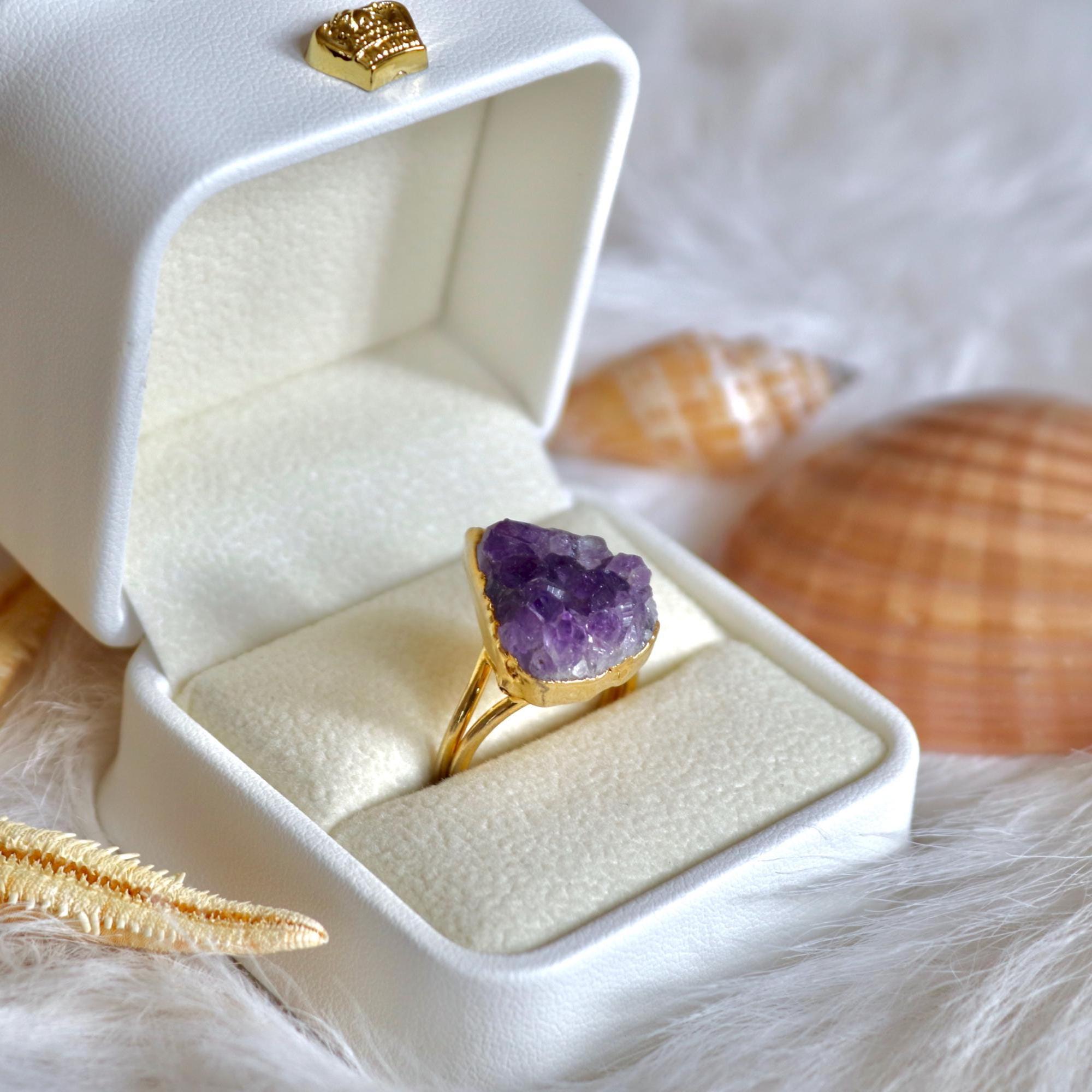 Raw Amethyst Adjustable Ring, Handmade Natural Crystal Gold Plated Statement Jewelry, Boho Gemstone Gift for Her