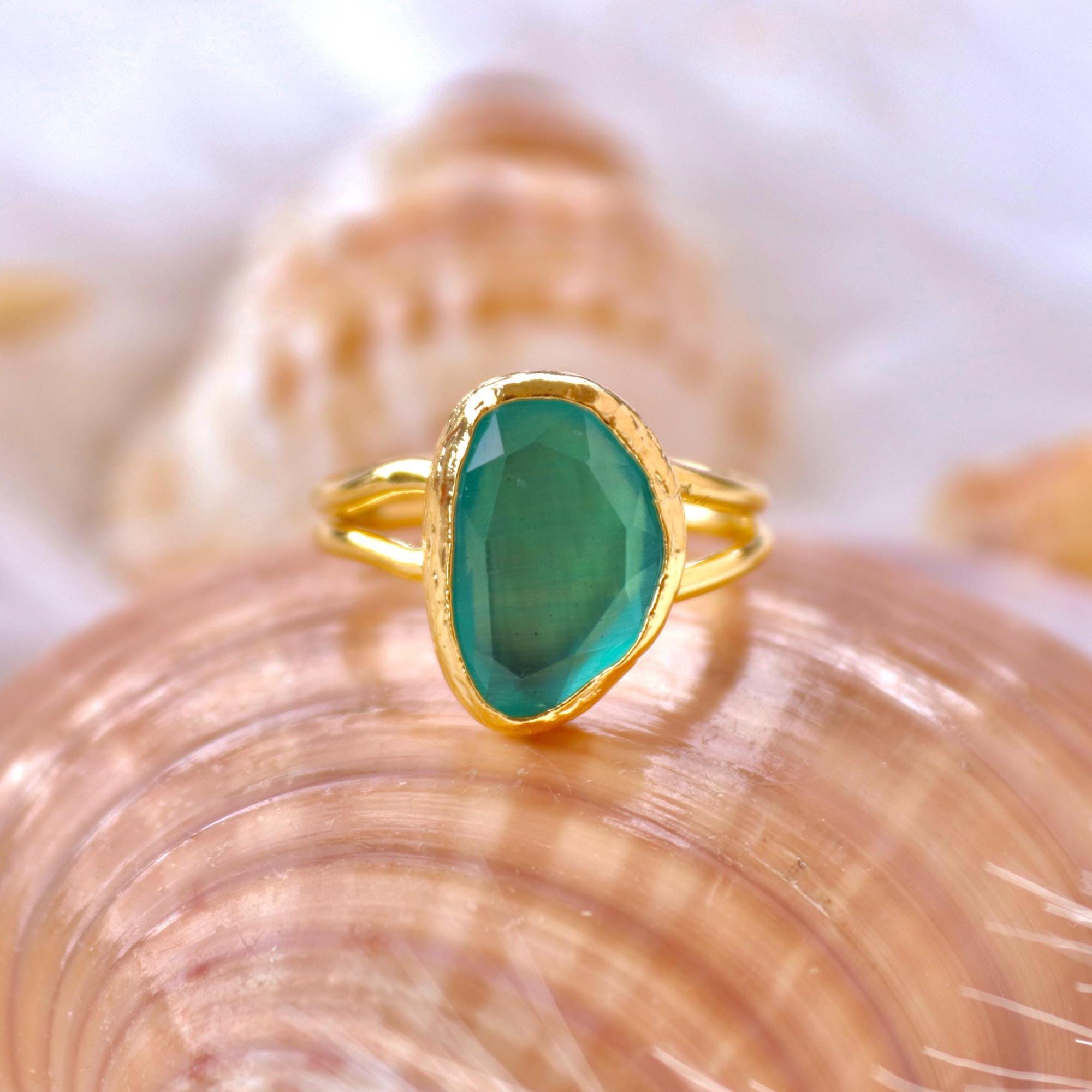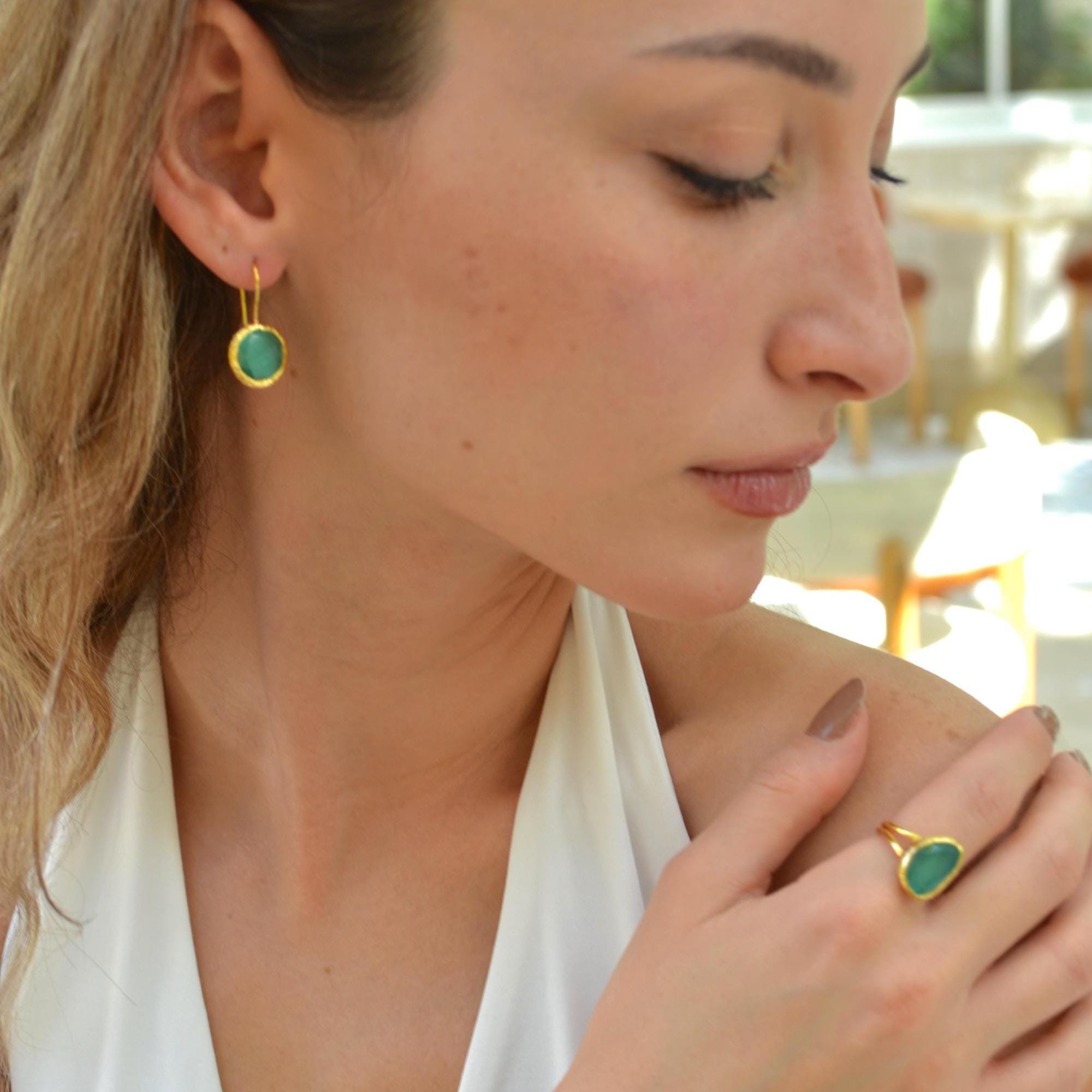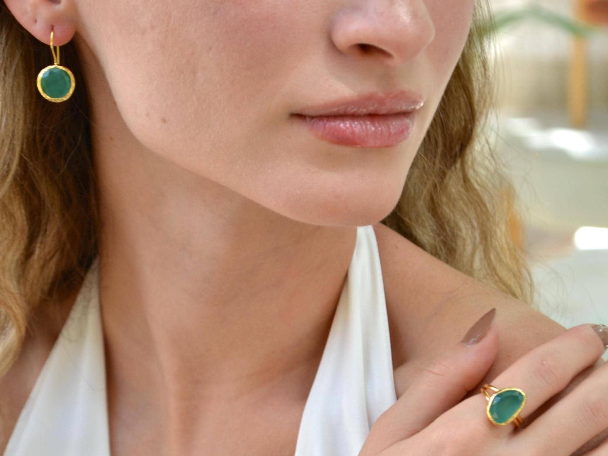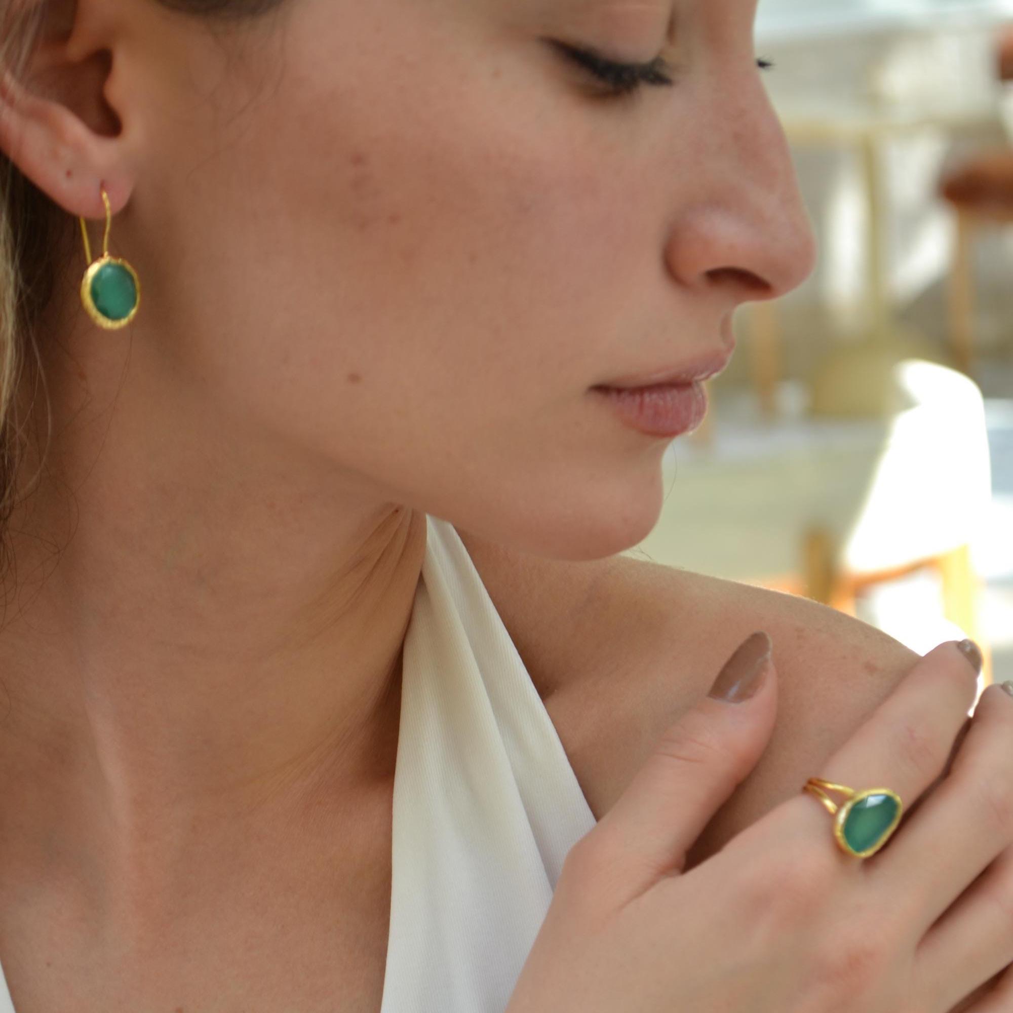Green Onyx Earrings and Adjustable Ring, Gold Plated Minimalist Jewelry , Gift for Her