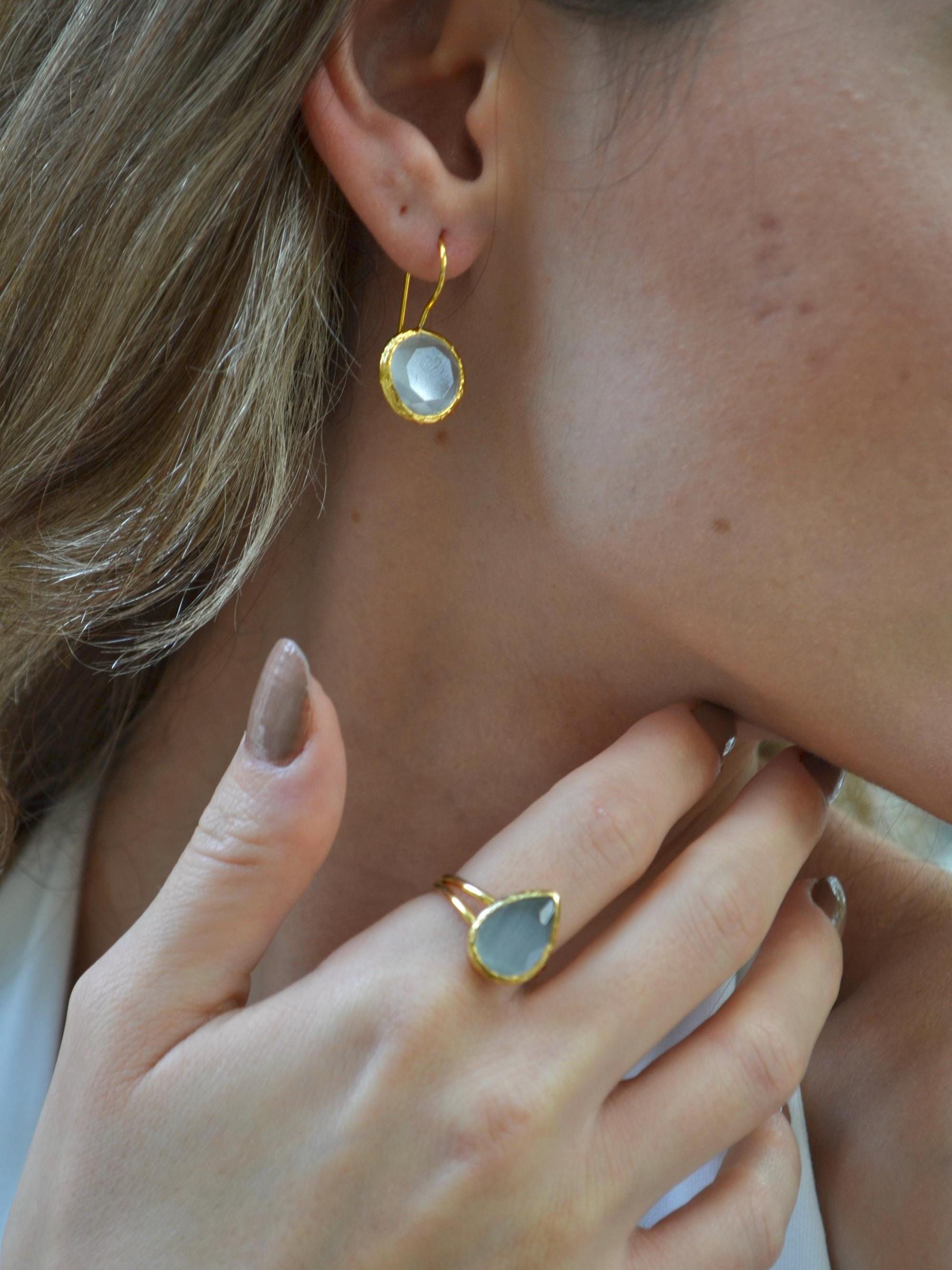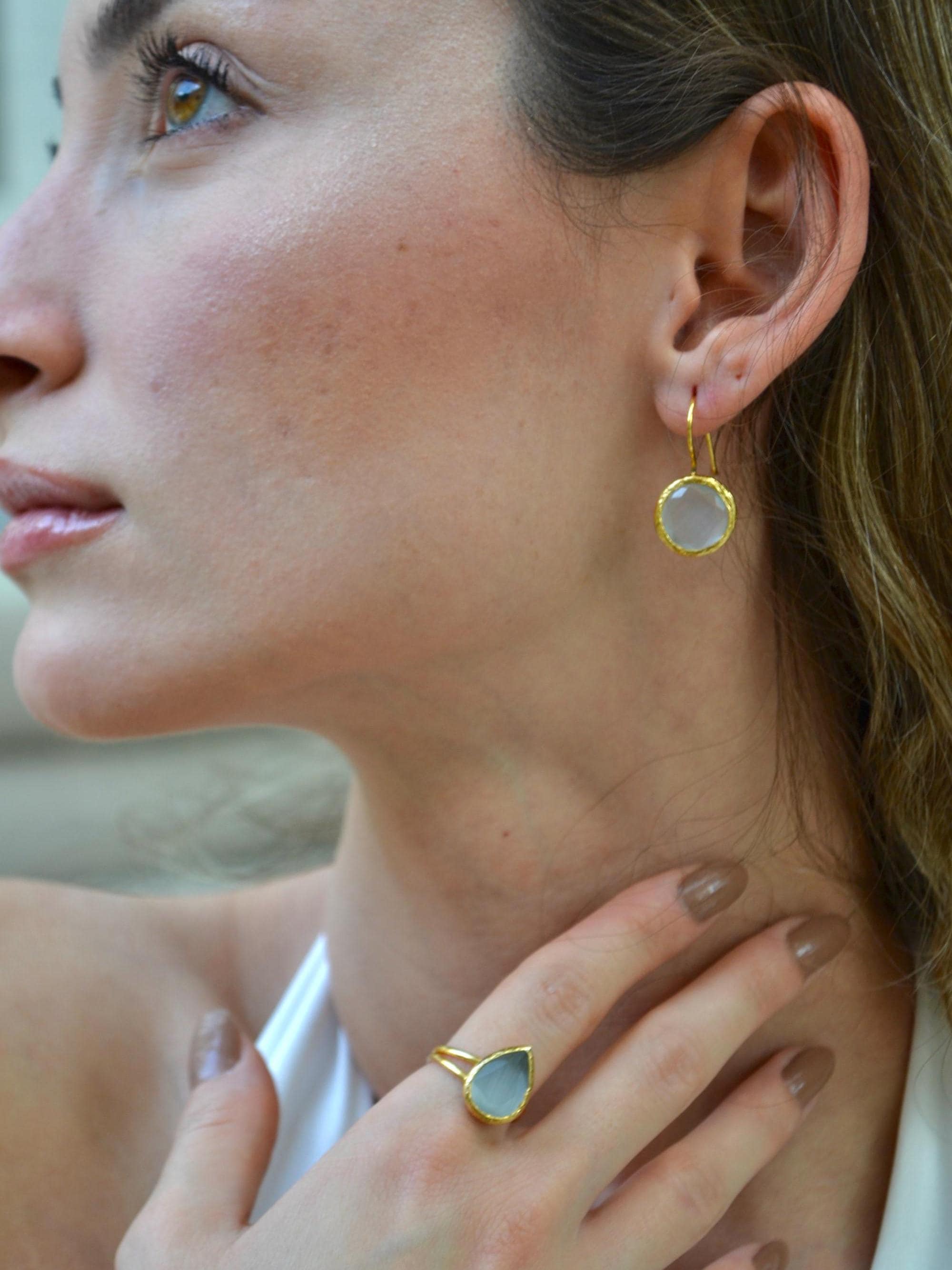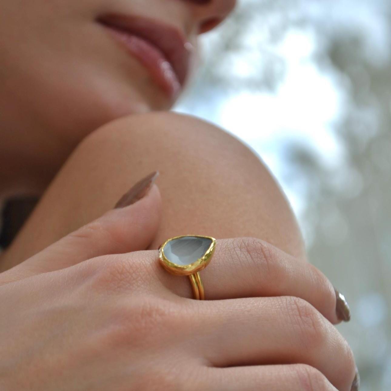 This refined teardrop ring features a gray moonstone that glows softly as it catches the light.