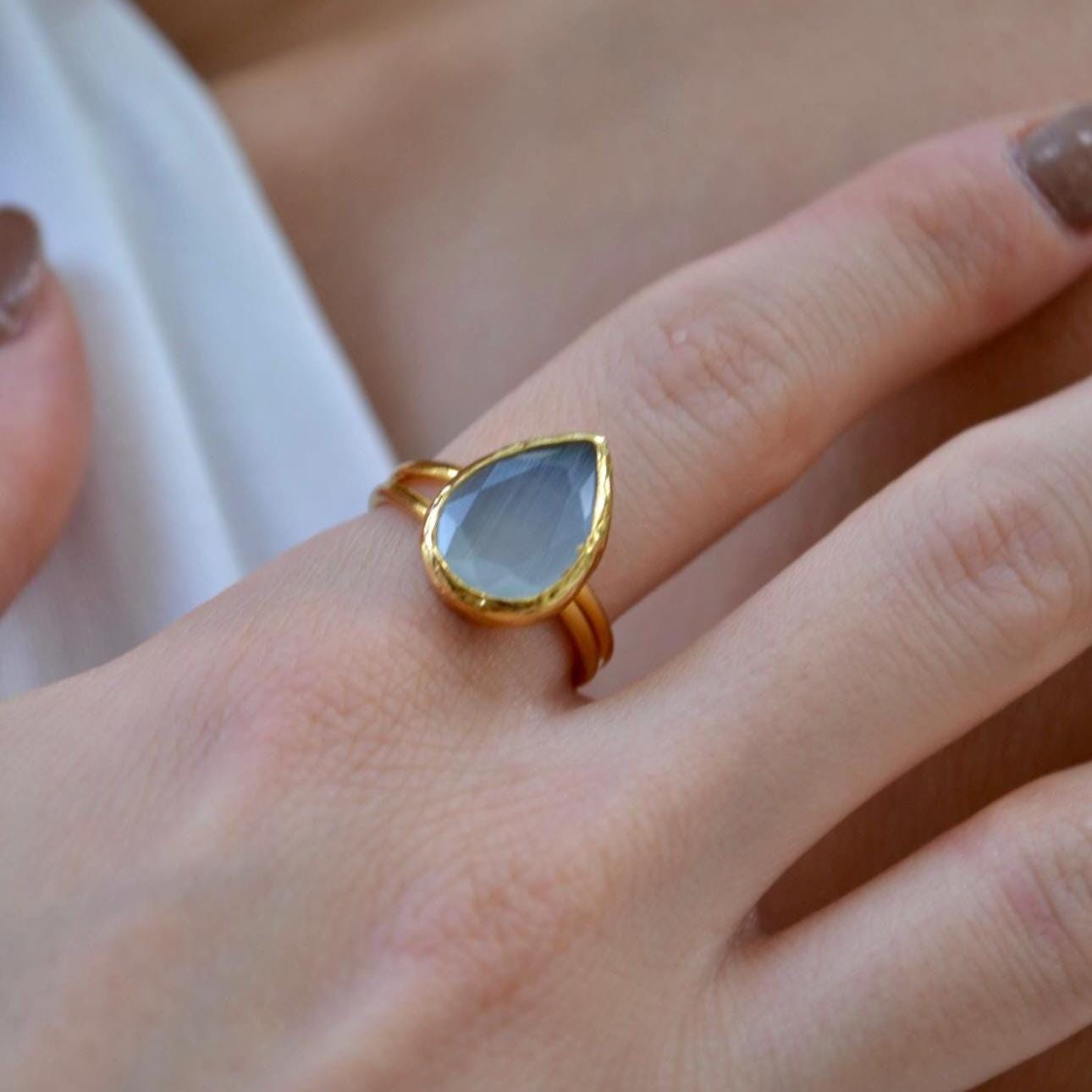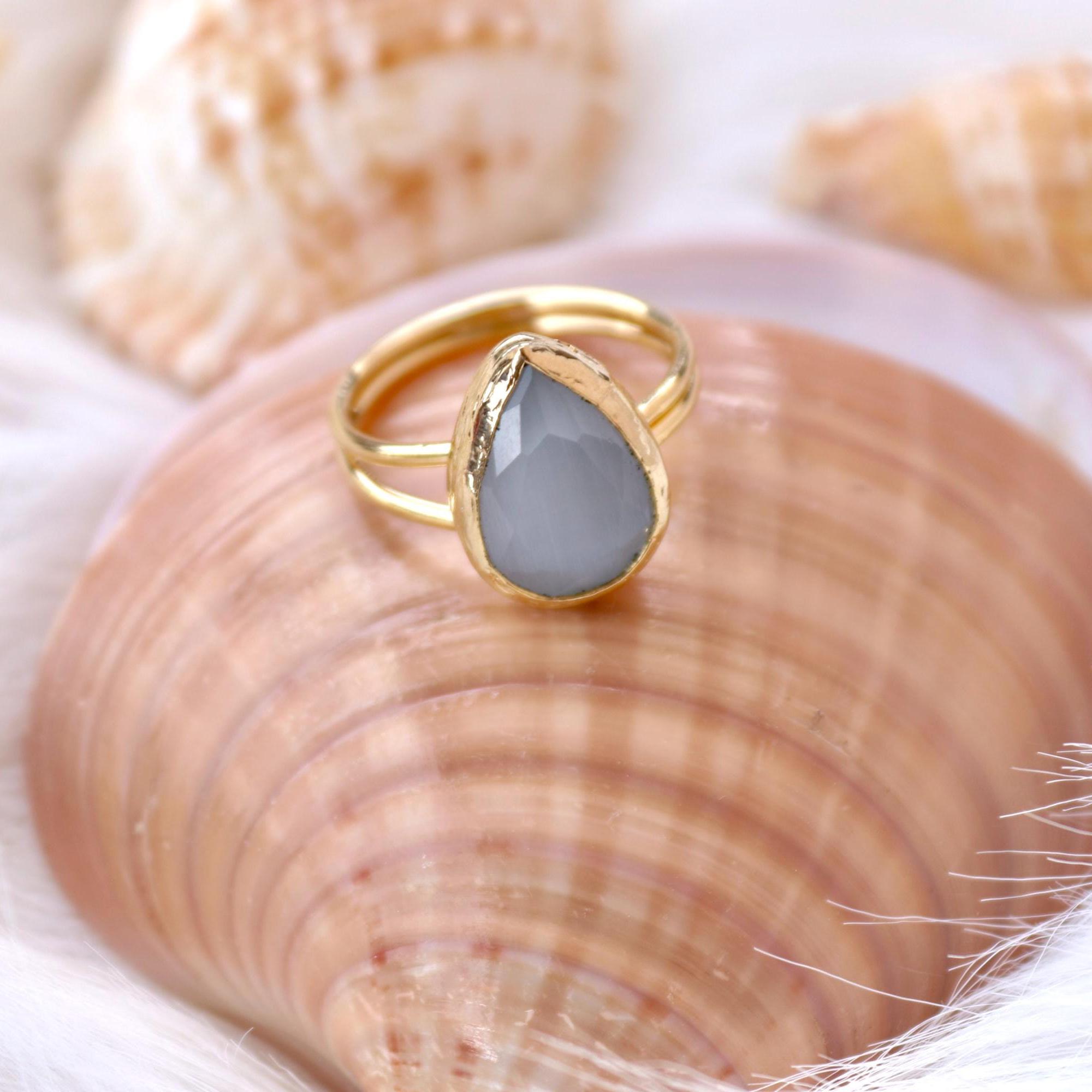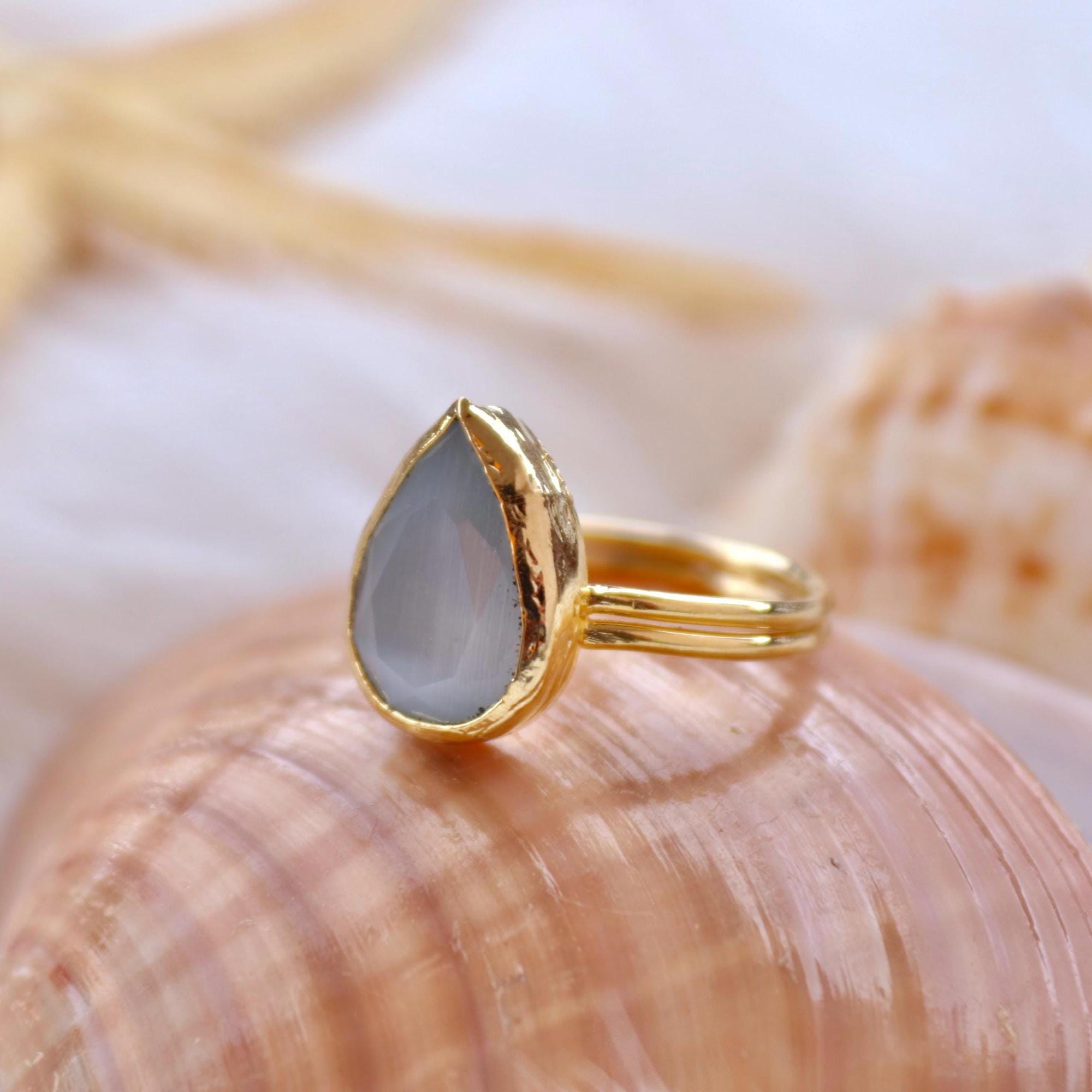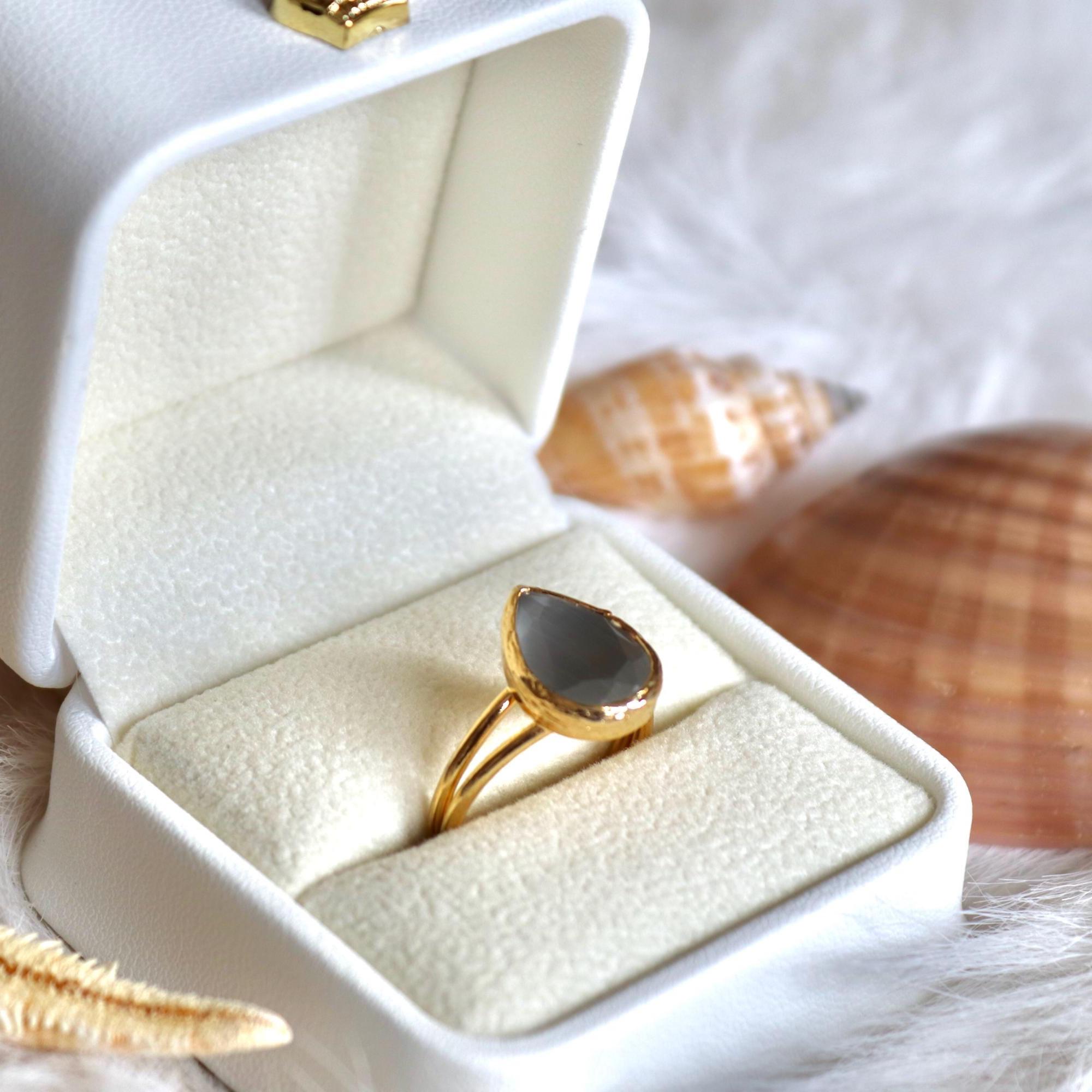 Moonstone Teardrop Ring, Adjustable Gold Plated Band, Natural Gemstone Jewelry Gift for Her