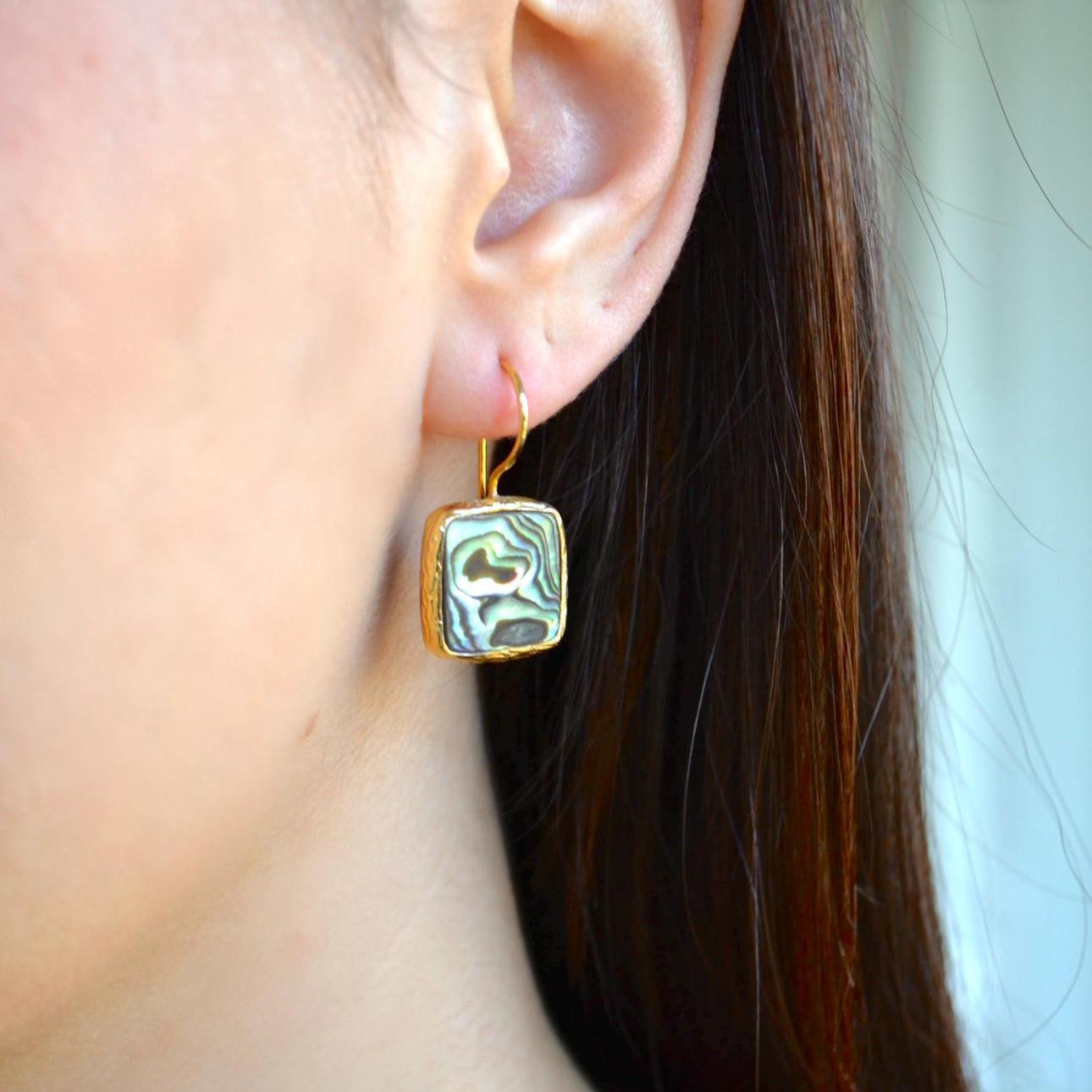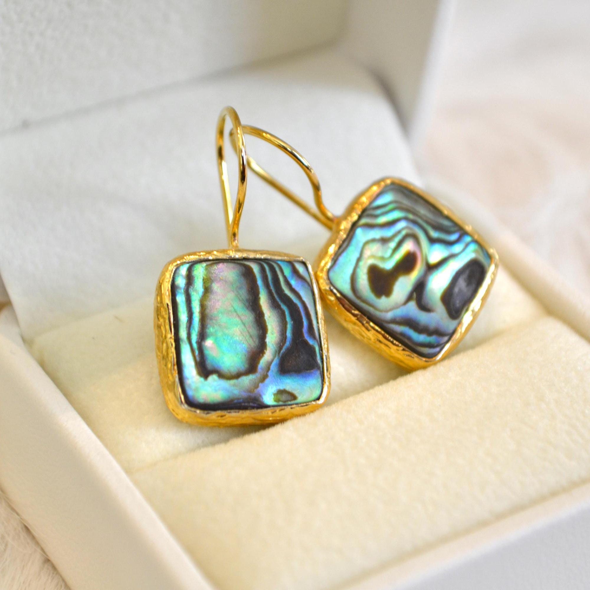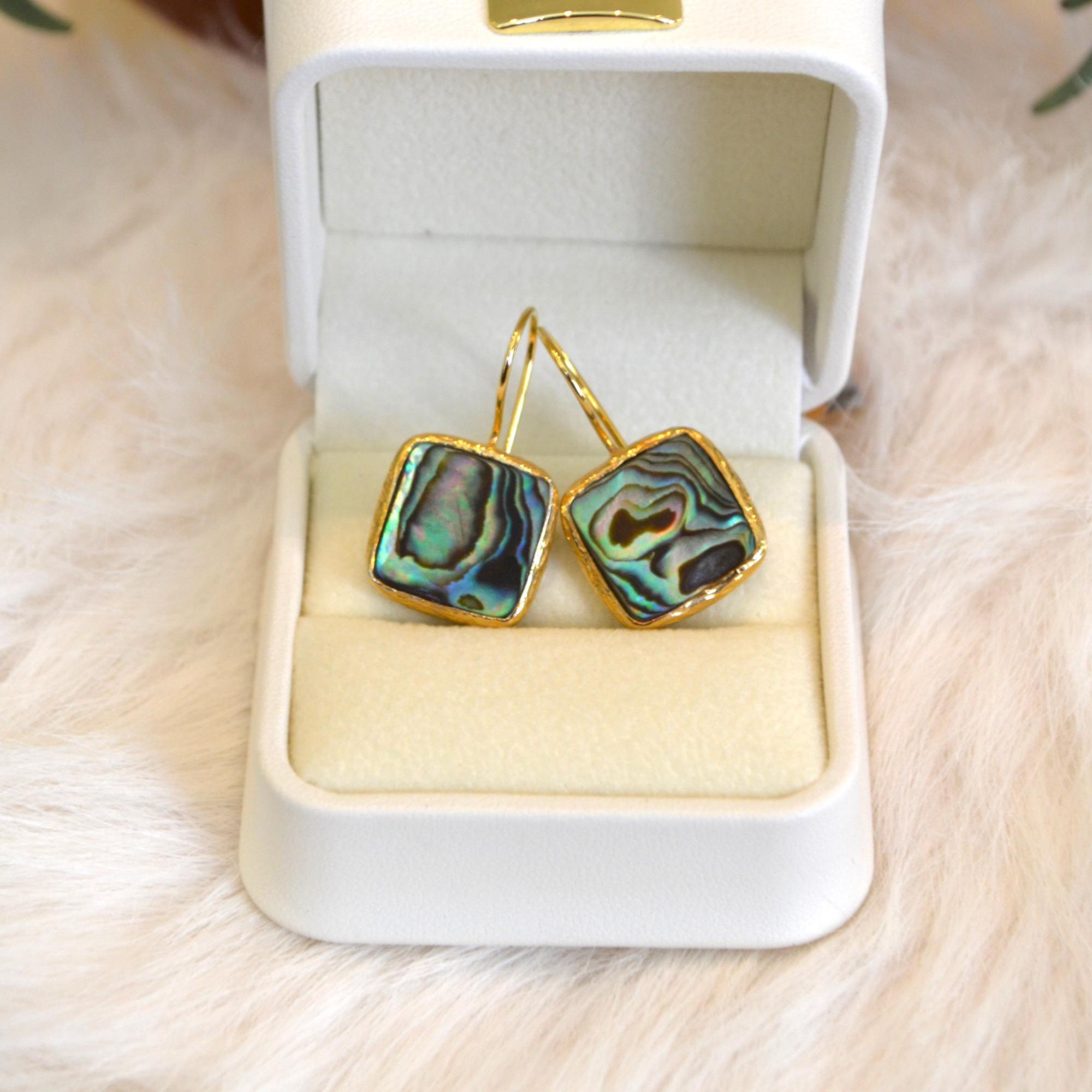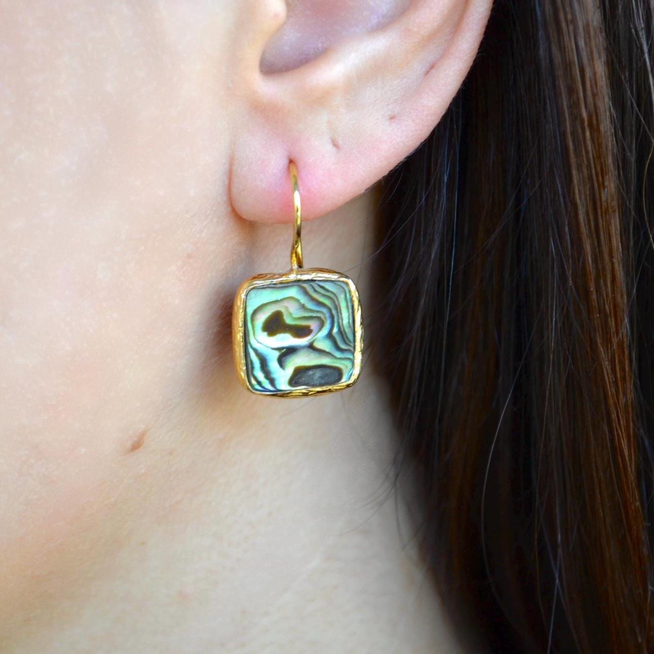 Add a touch of ocean-inspired elegance to your look with these square abalone shell dangle earrings.