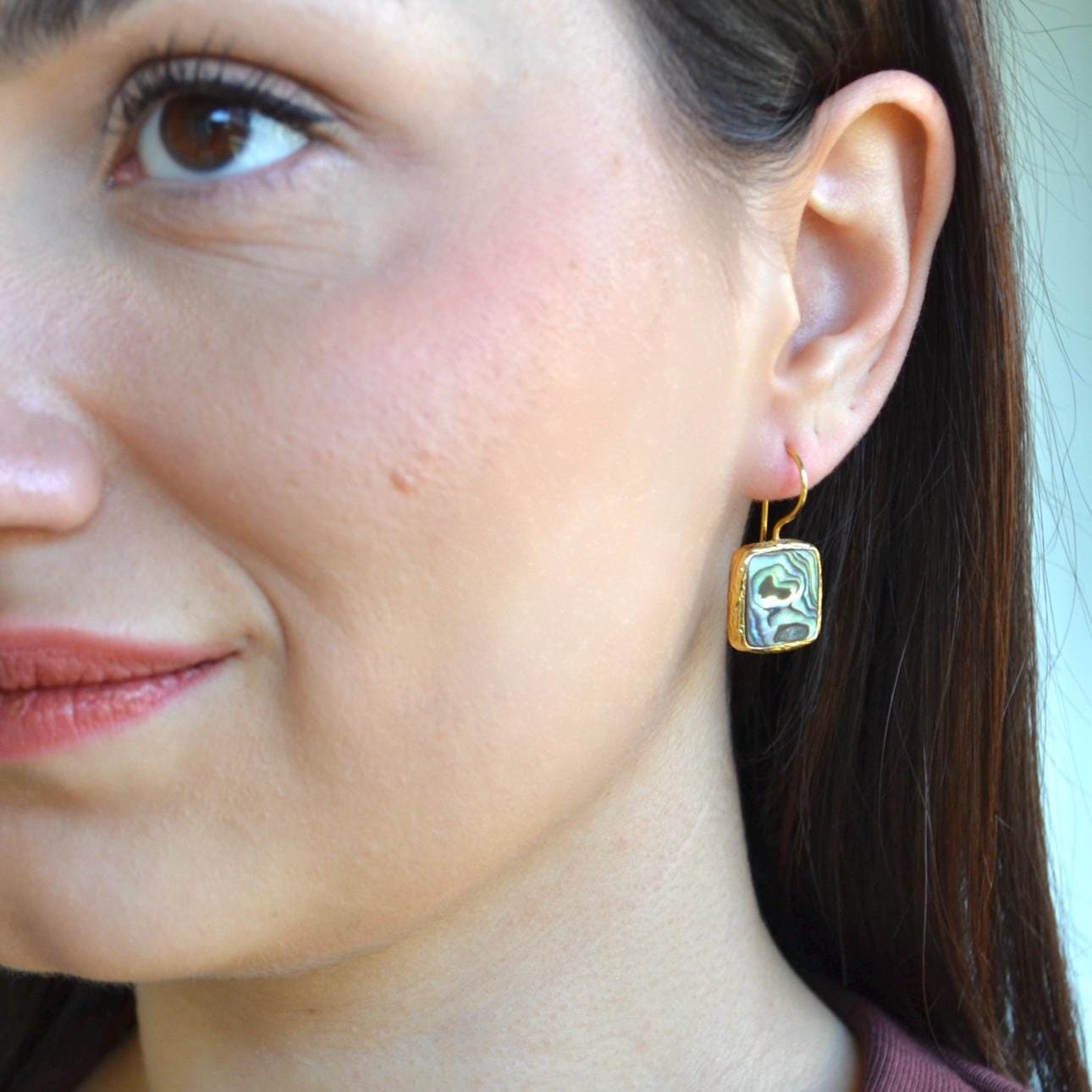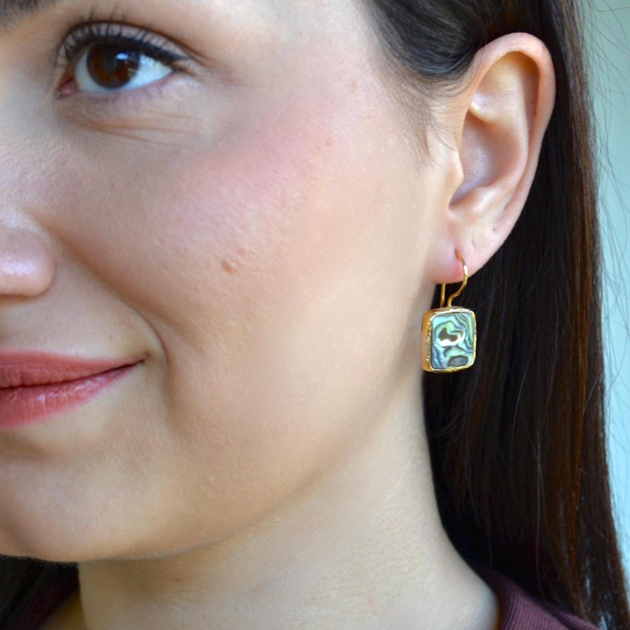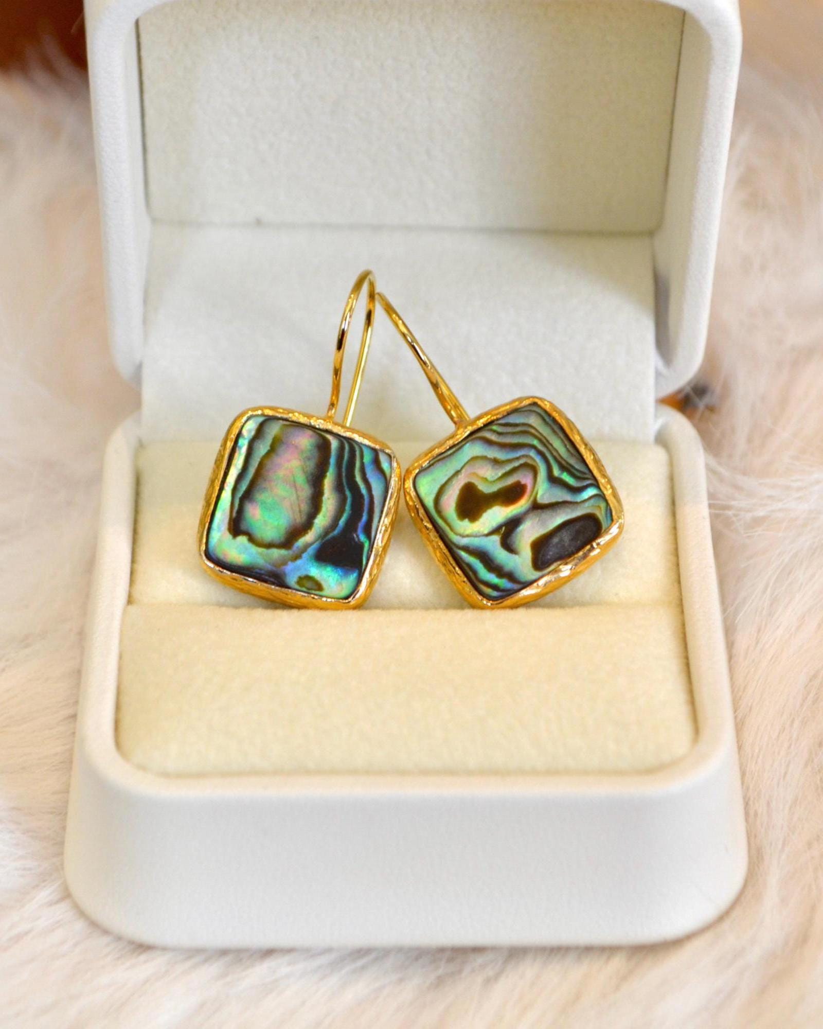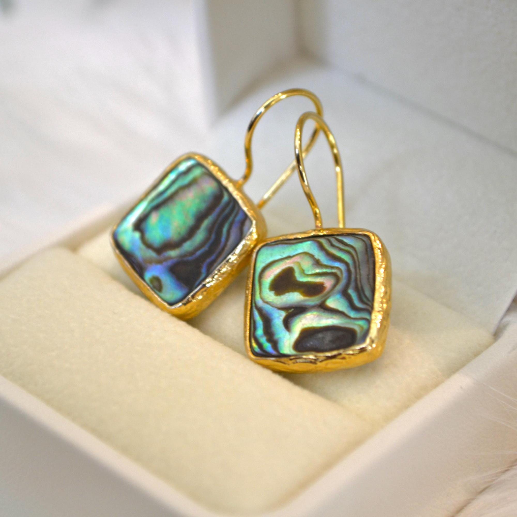 Add a touch of ocean-inspired elegance to your look with these square abalone shell dangle earrings.