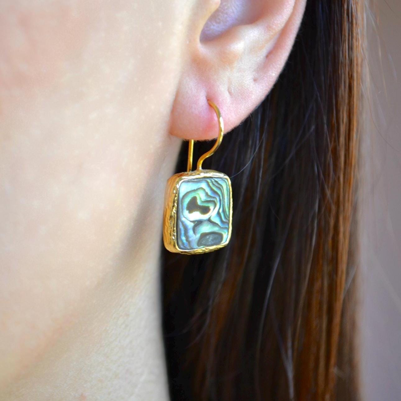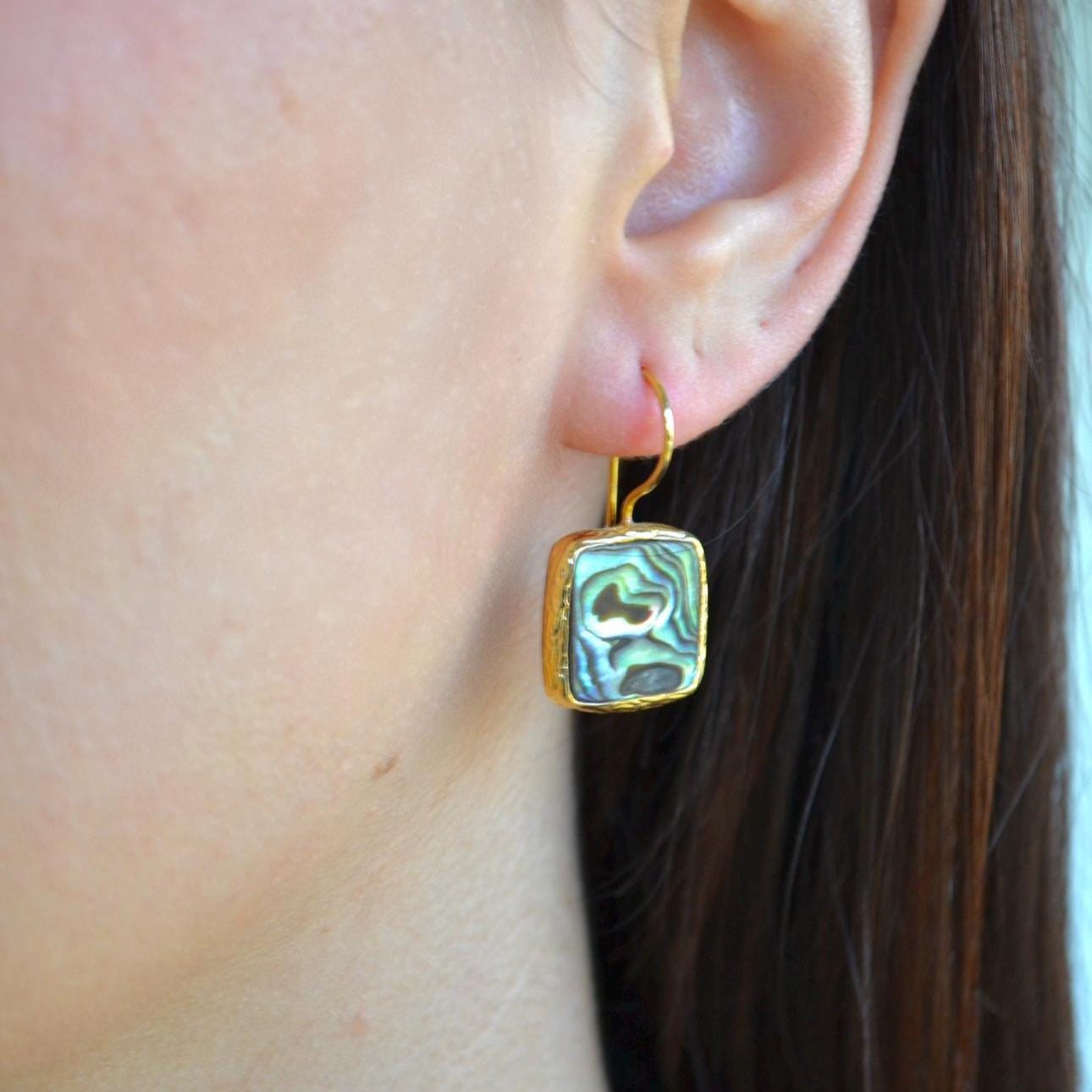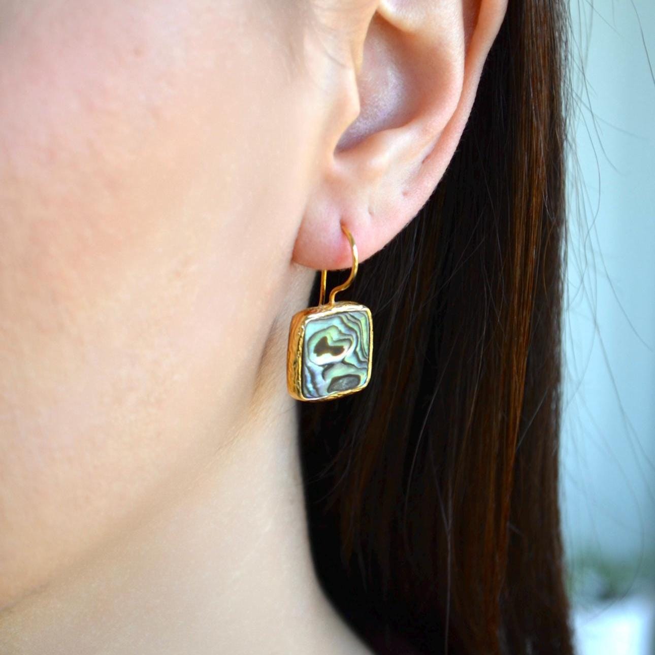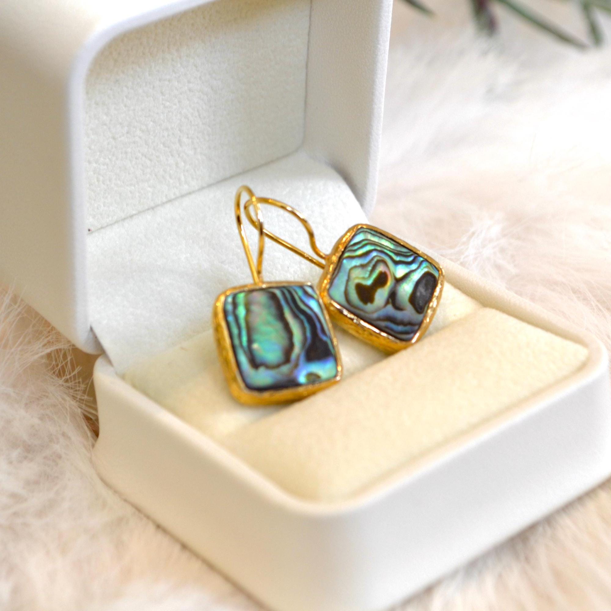 Add a touch of ocean-inspired elegance to your look with these square abalone shell dangle earrings.