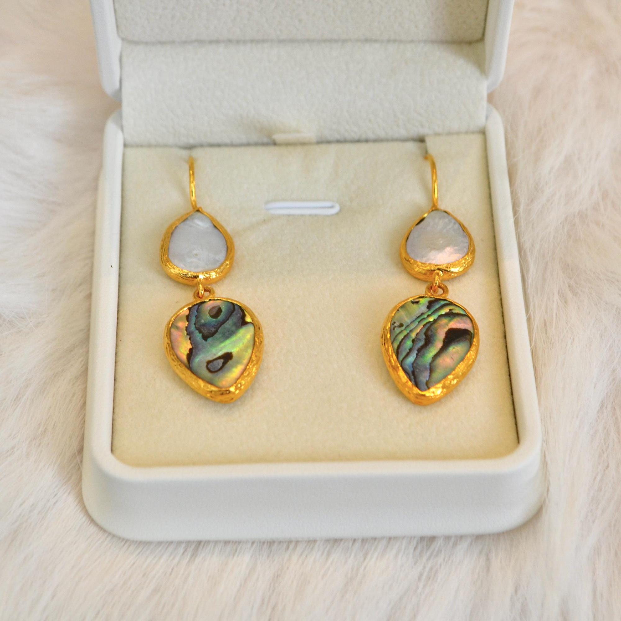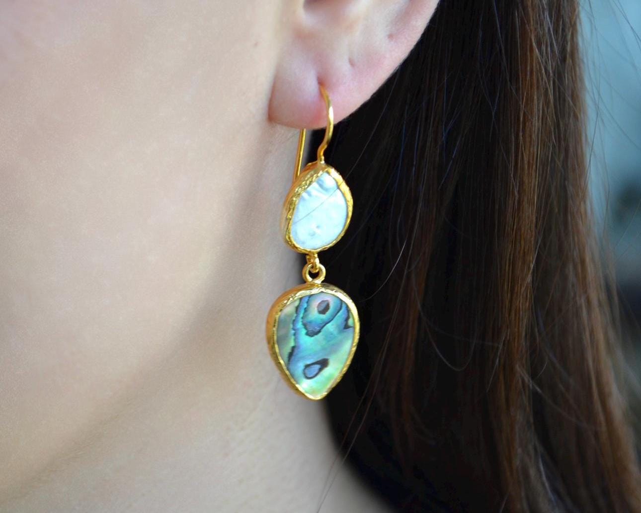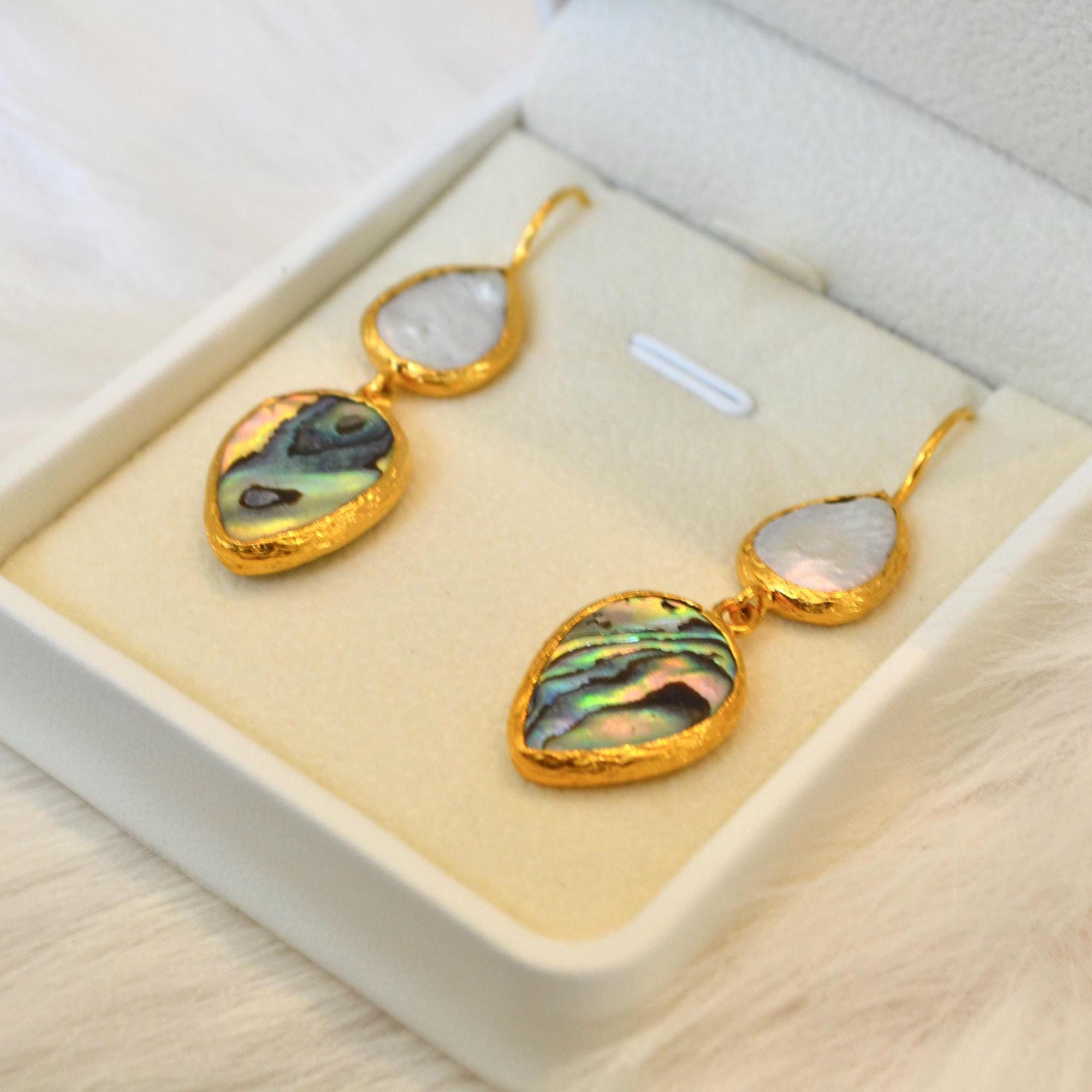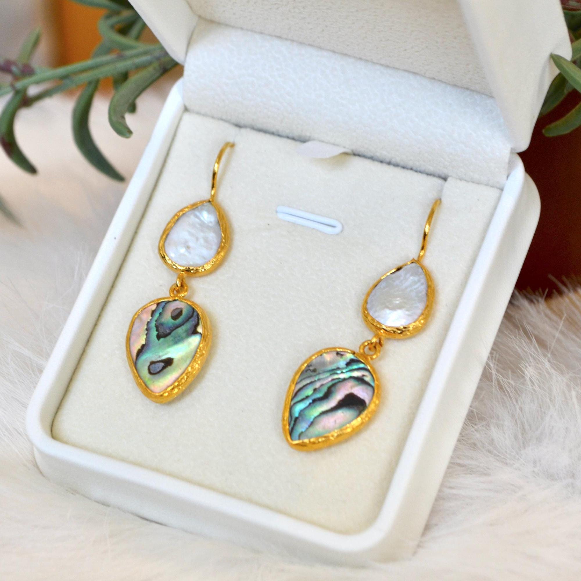 Abalone Shell & Pearl Teardrop Earrings, Ocean Inspired Gold Jewelry, Handmade Gift for Her, Beach Wedding Style