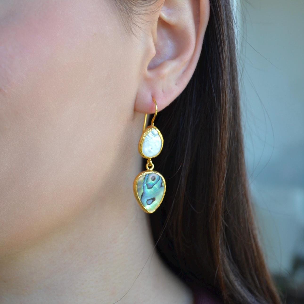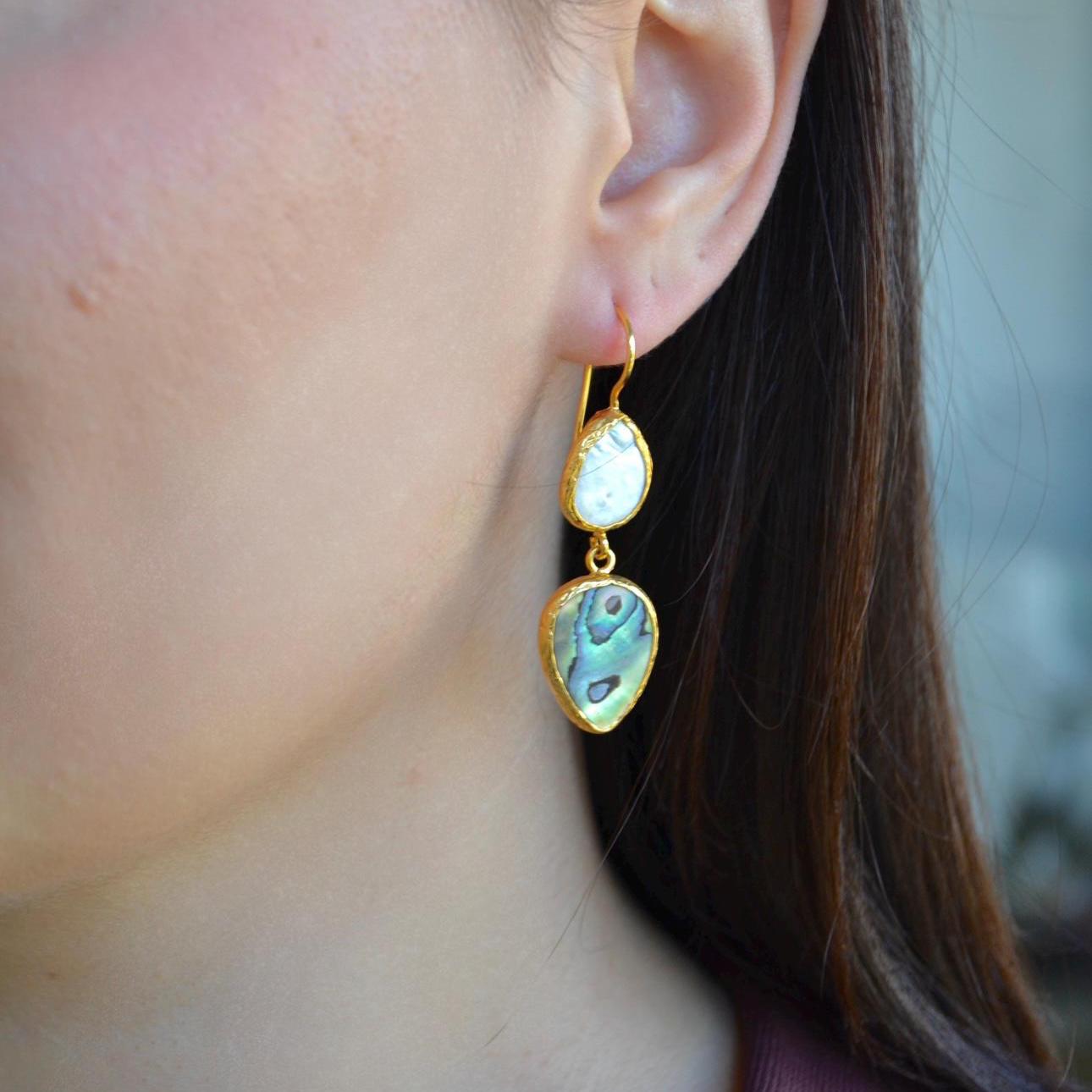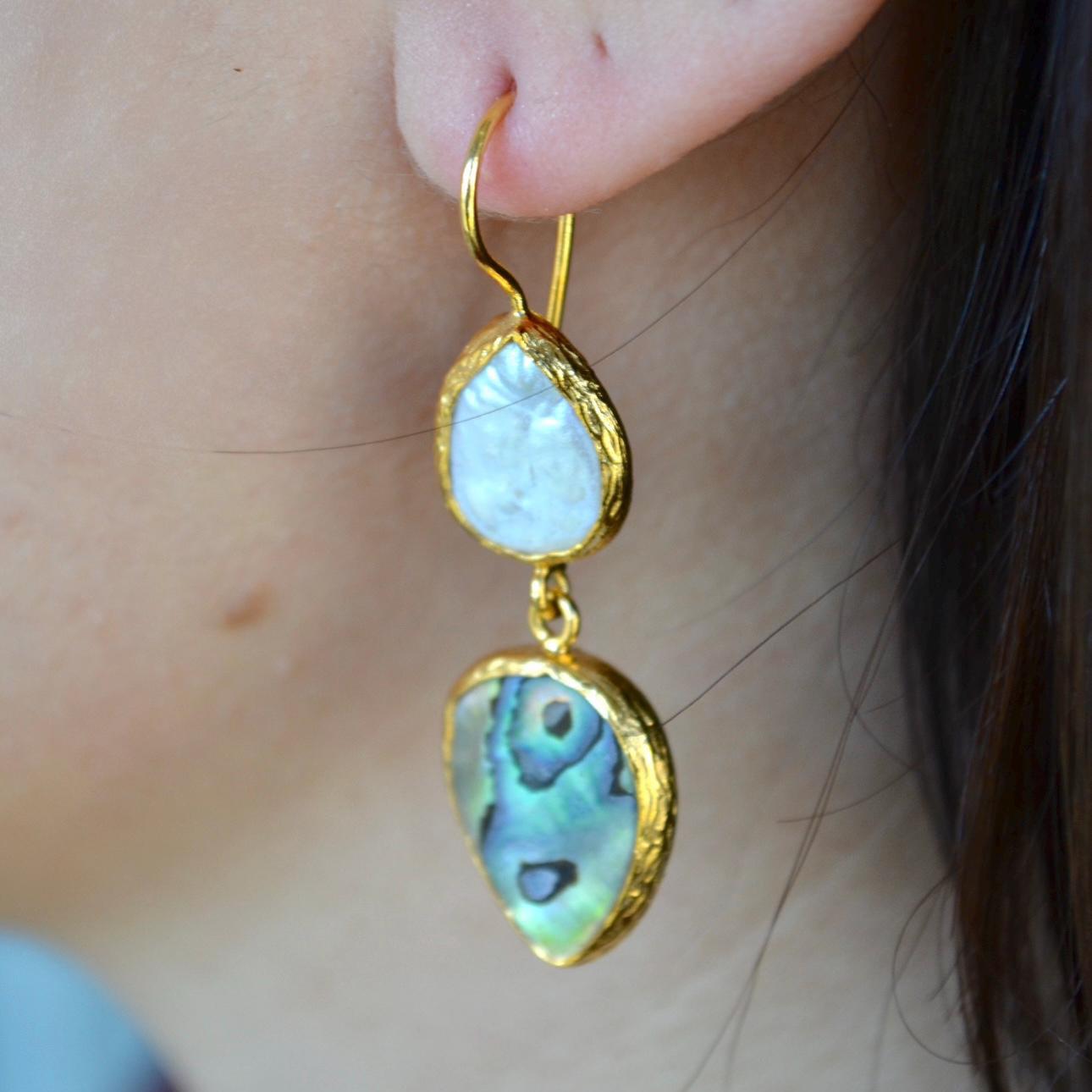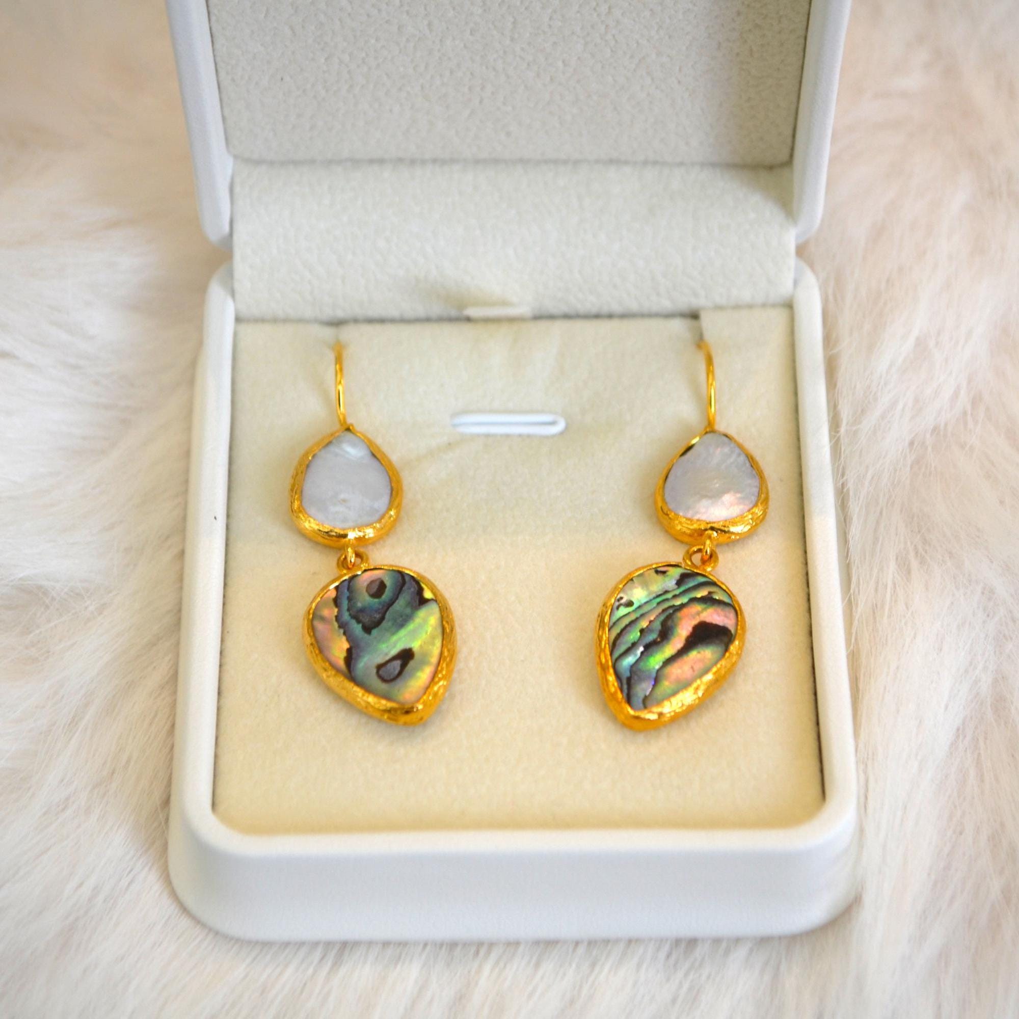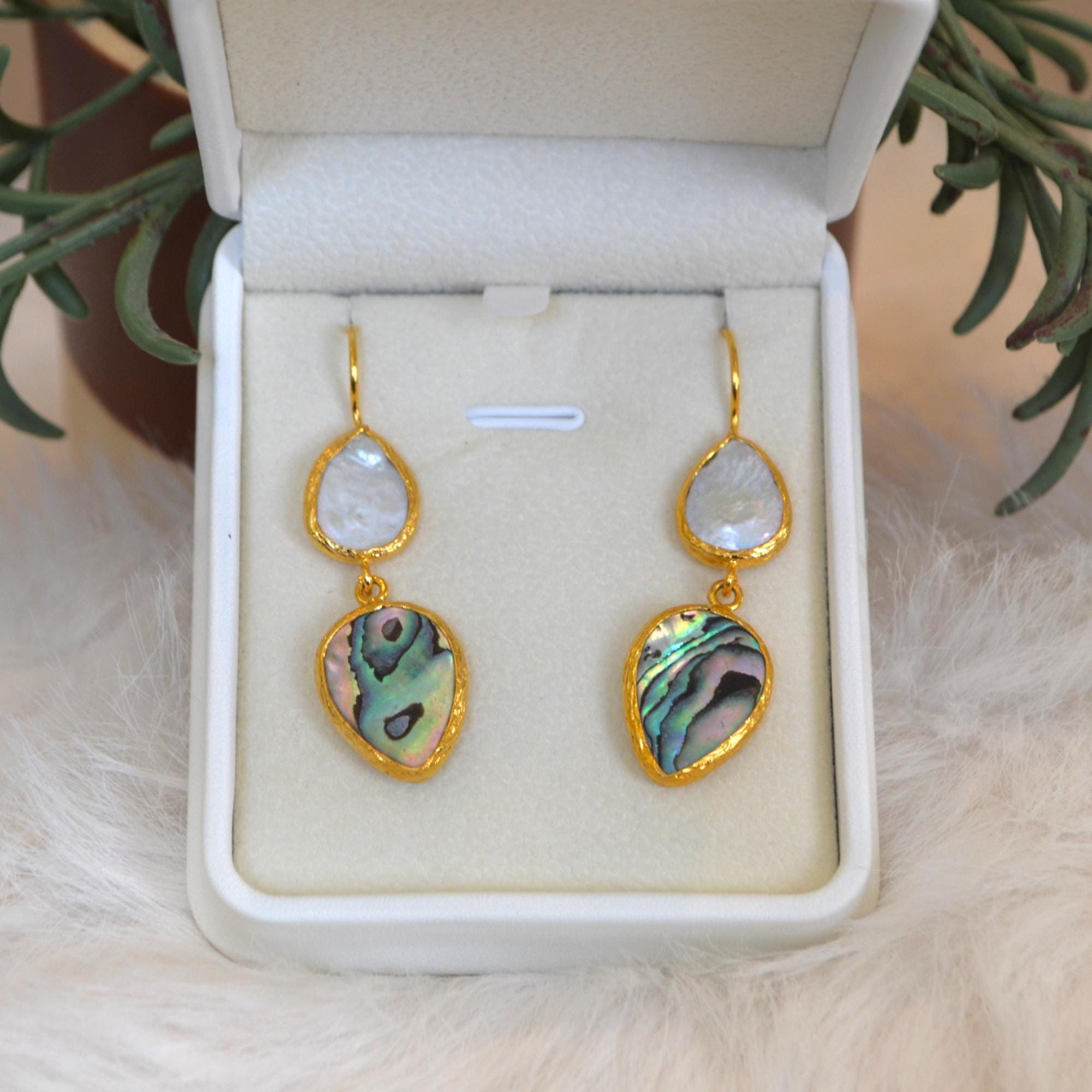 These handmade teardrop earrings feature a stunning combination of iridescent abalone shell and a delicate pearl drop. Abalone naturally reflects ocean tones greens, blues, and subtle rainbow shimmer while the pearl adds a timeless, elegant touch.