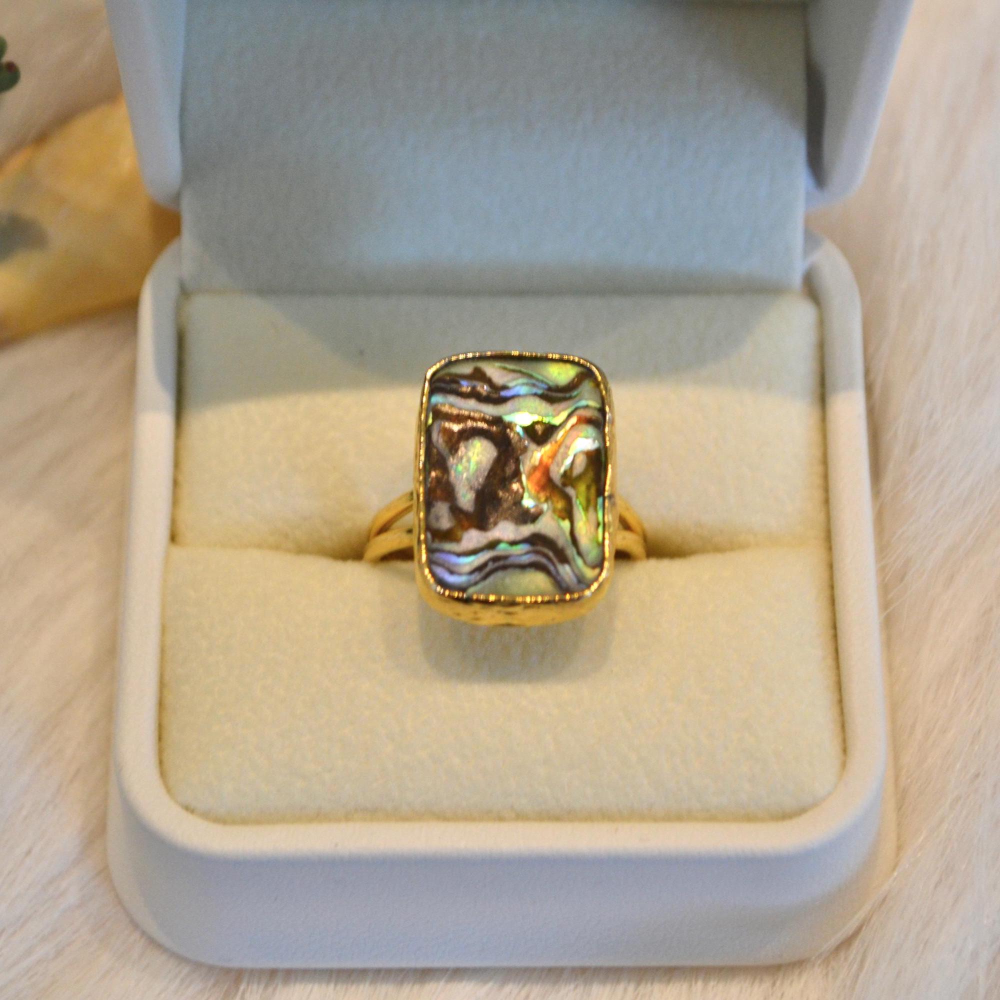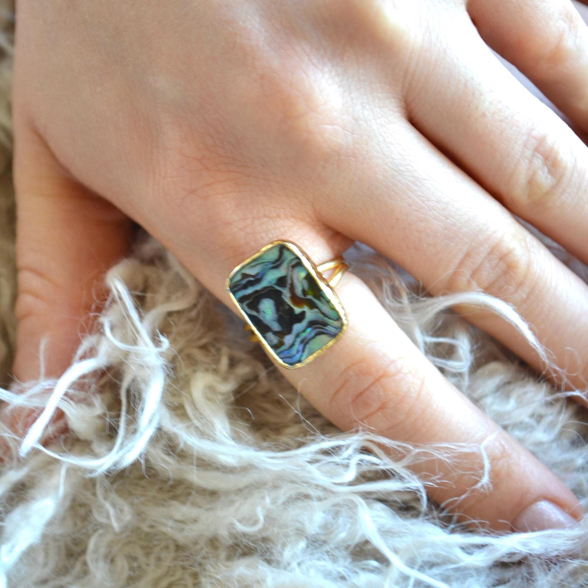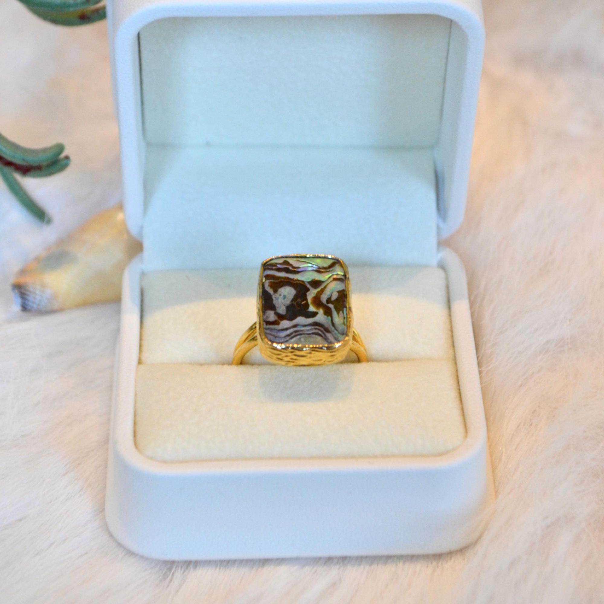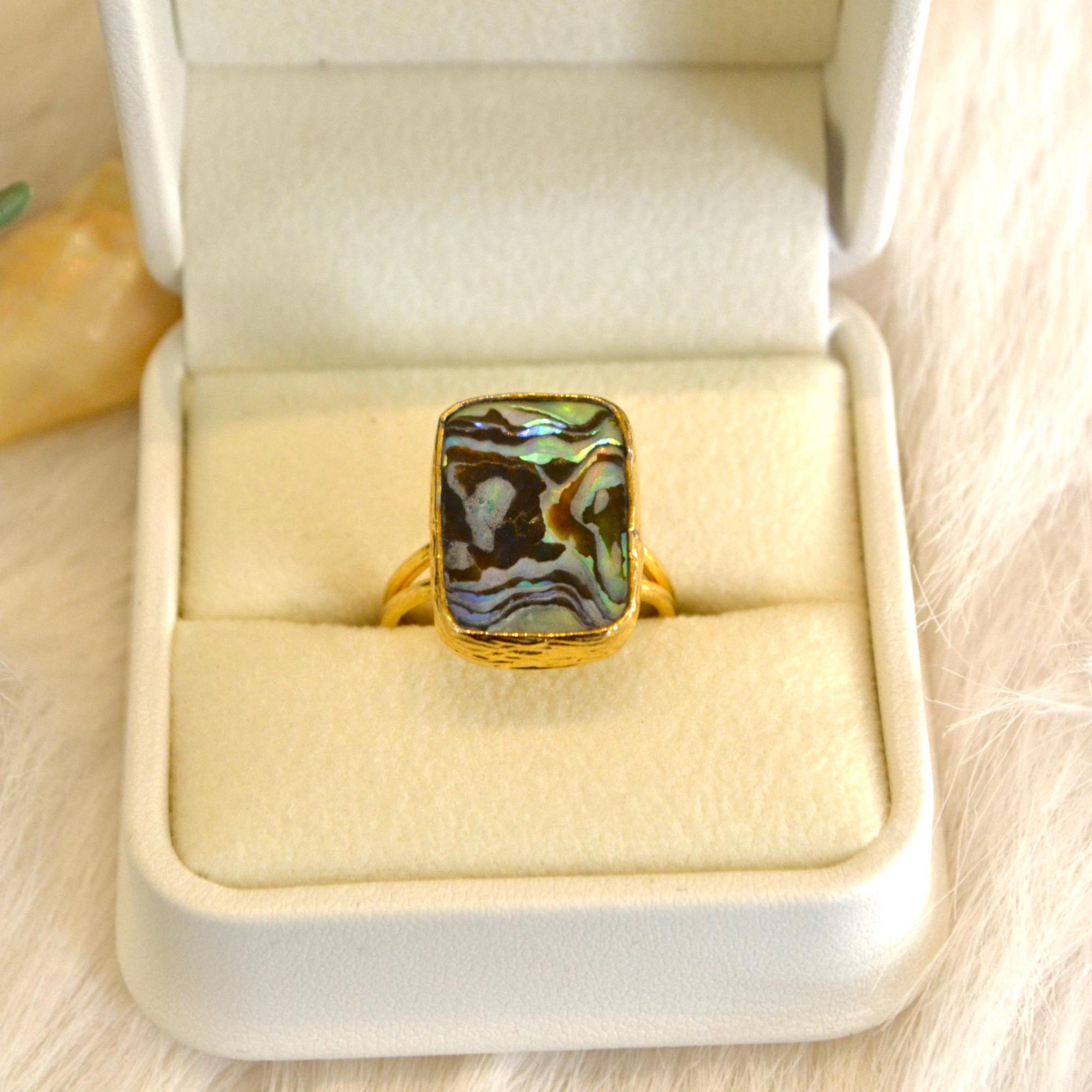 A bold rectangle abalone shell ring with natural iridescent glow minimal, modern, and effortlessly elegant.