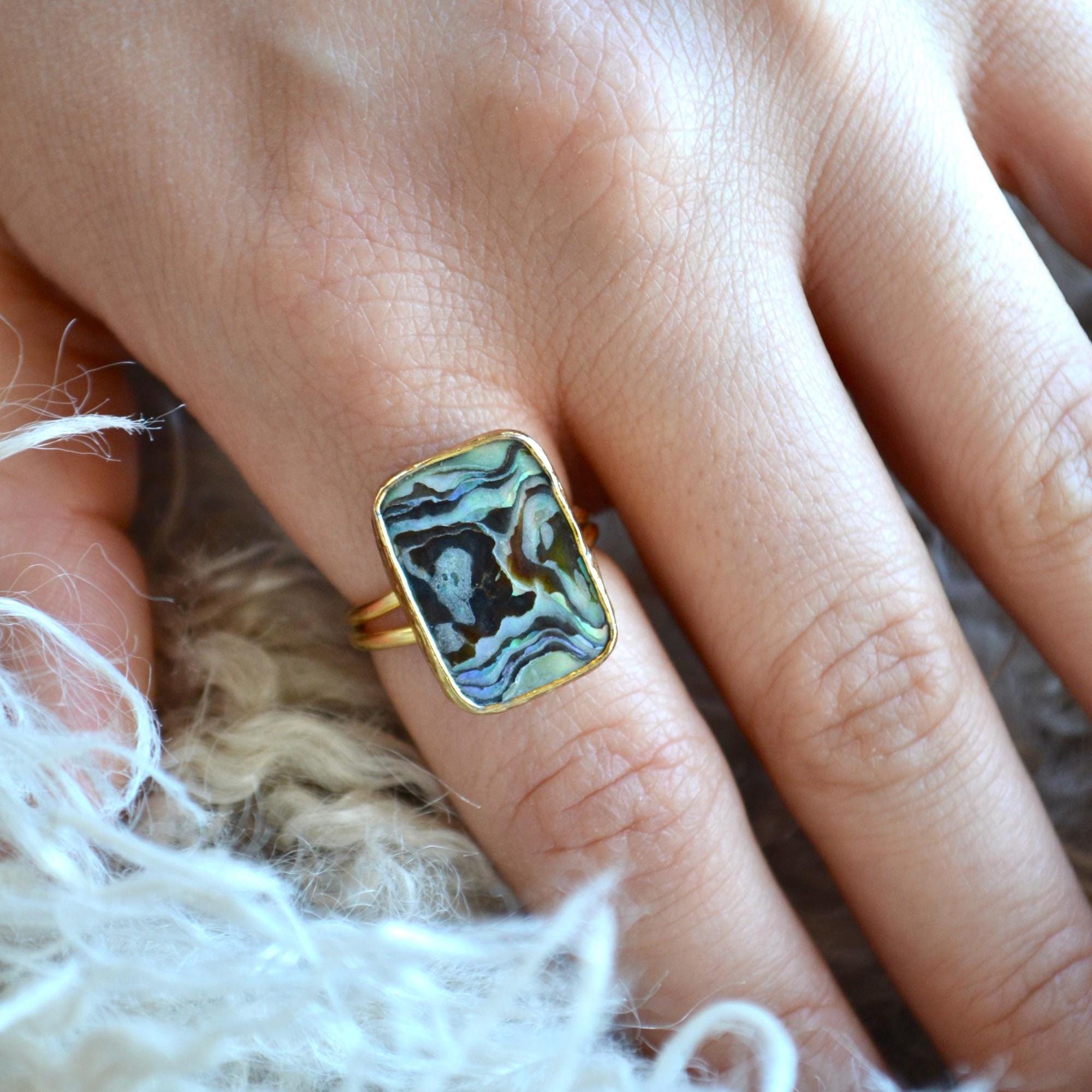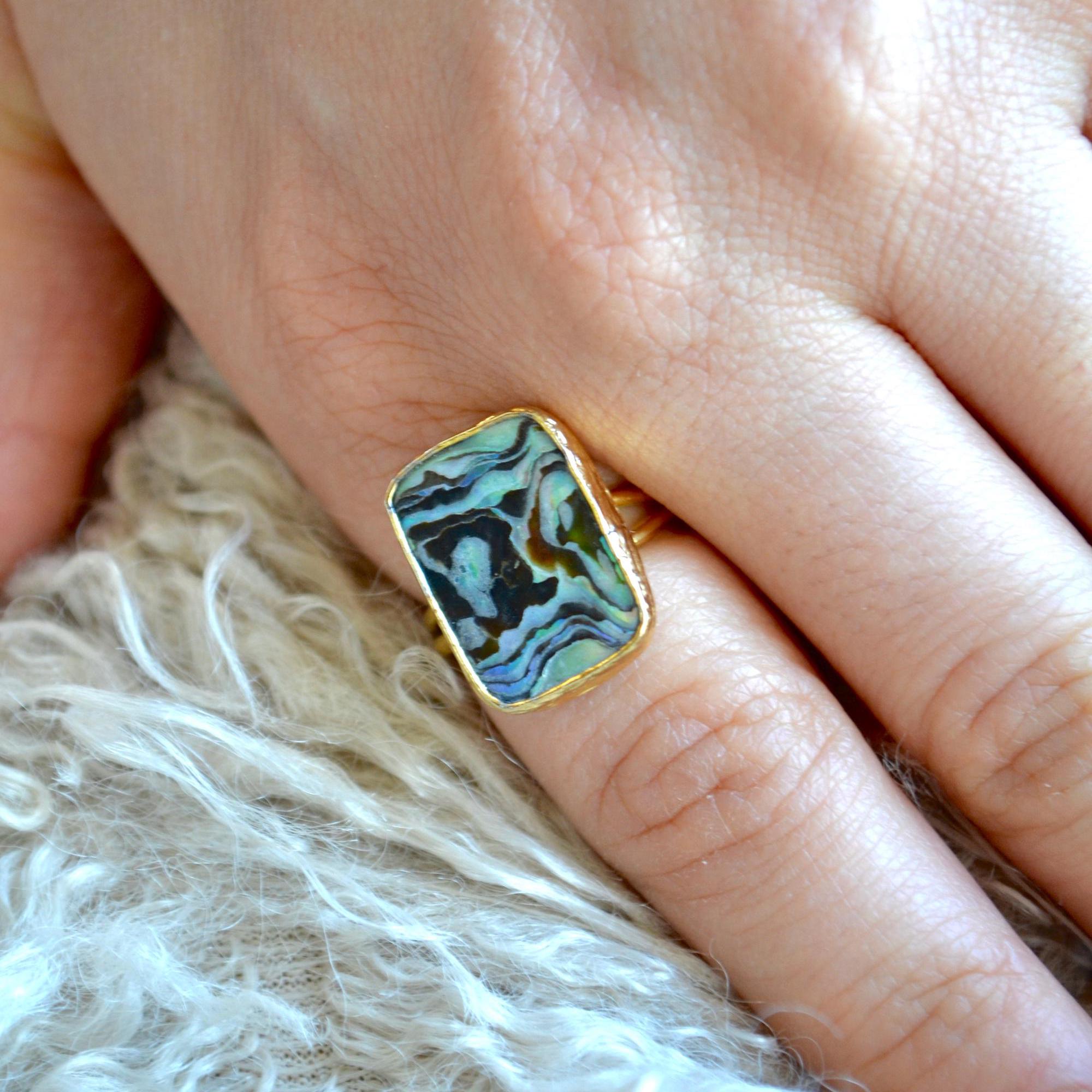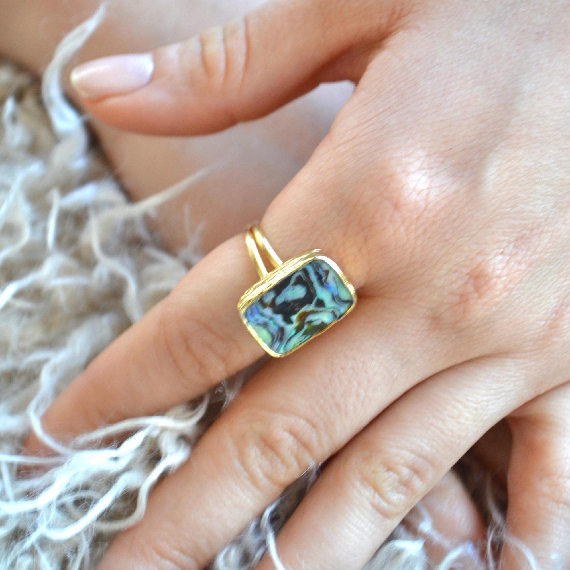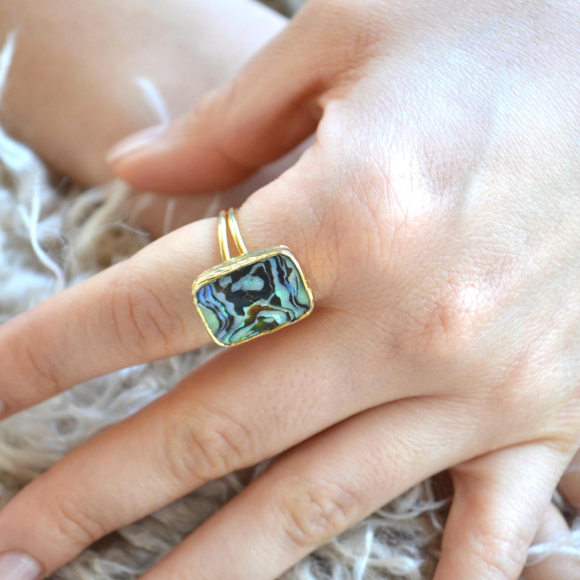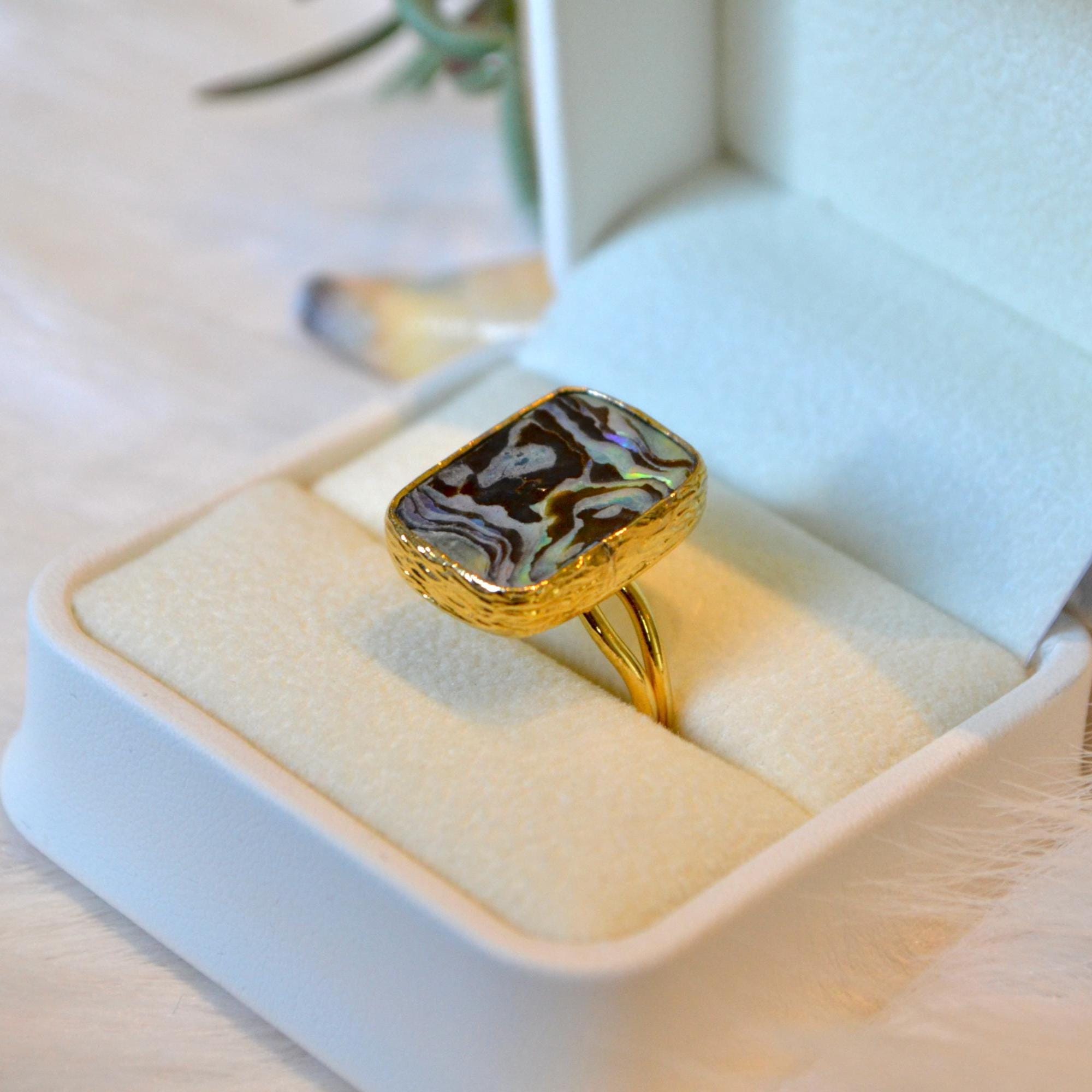 A bold rectangle abalone shell ring with natural iridescent glow minimal, modern, and effortlessly elegant.