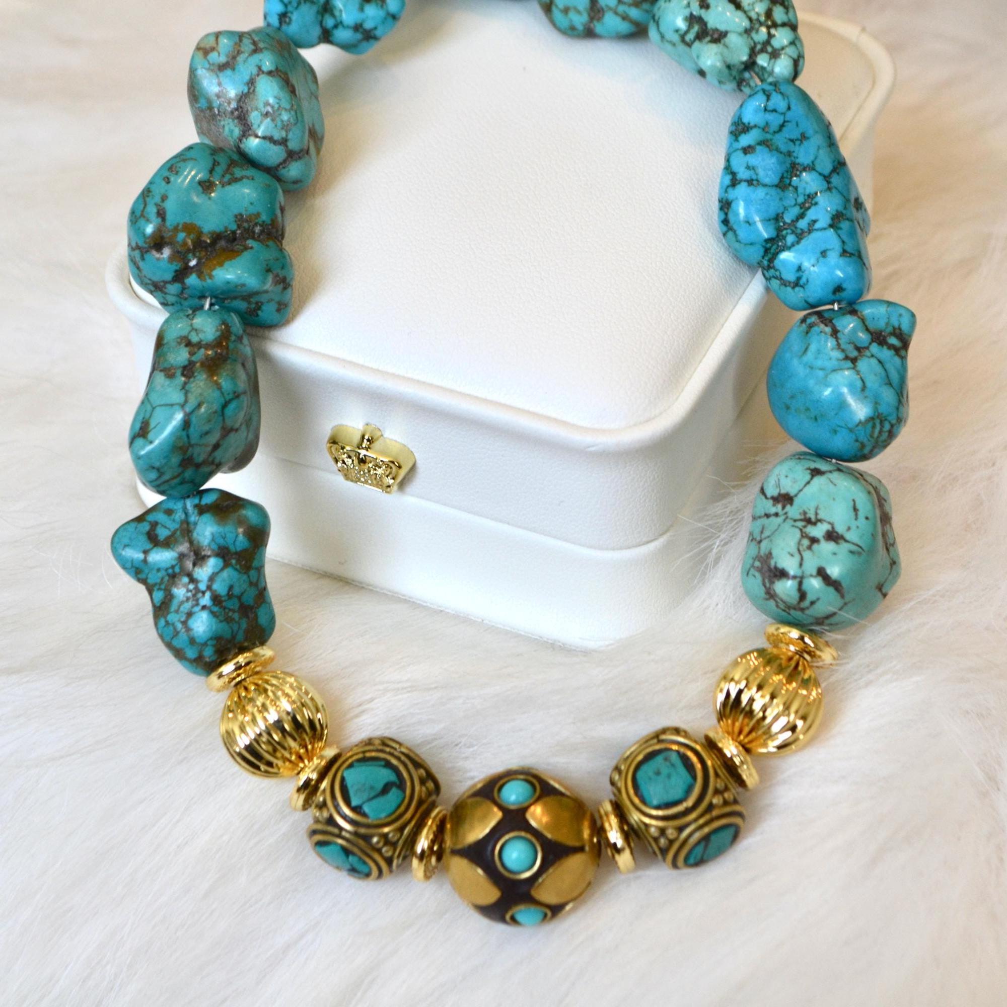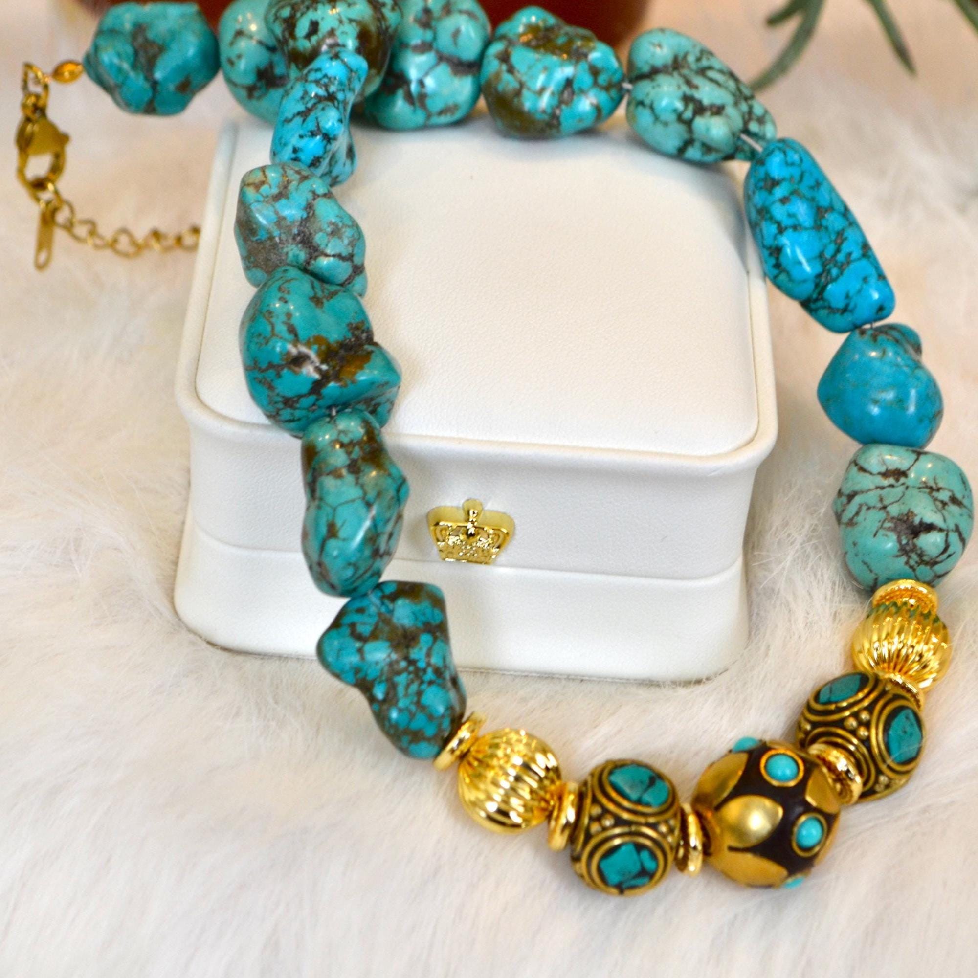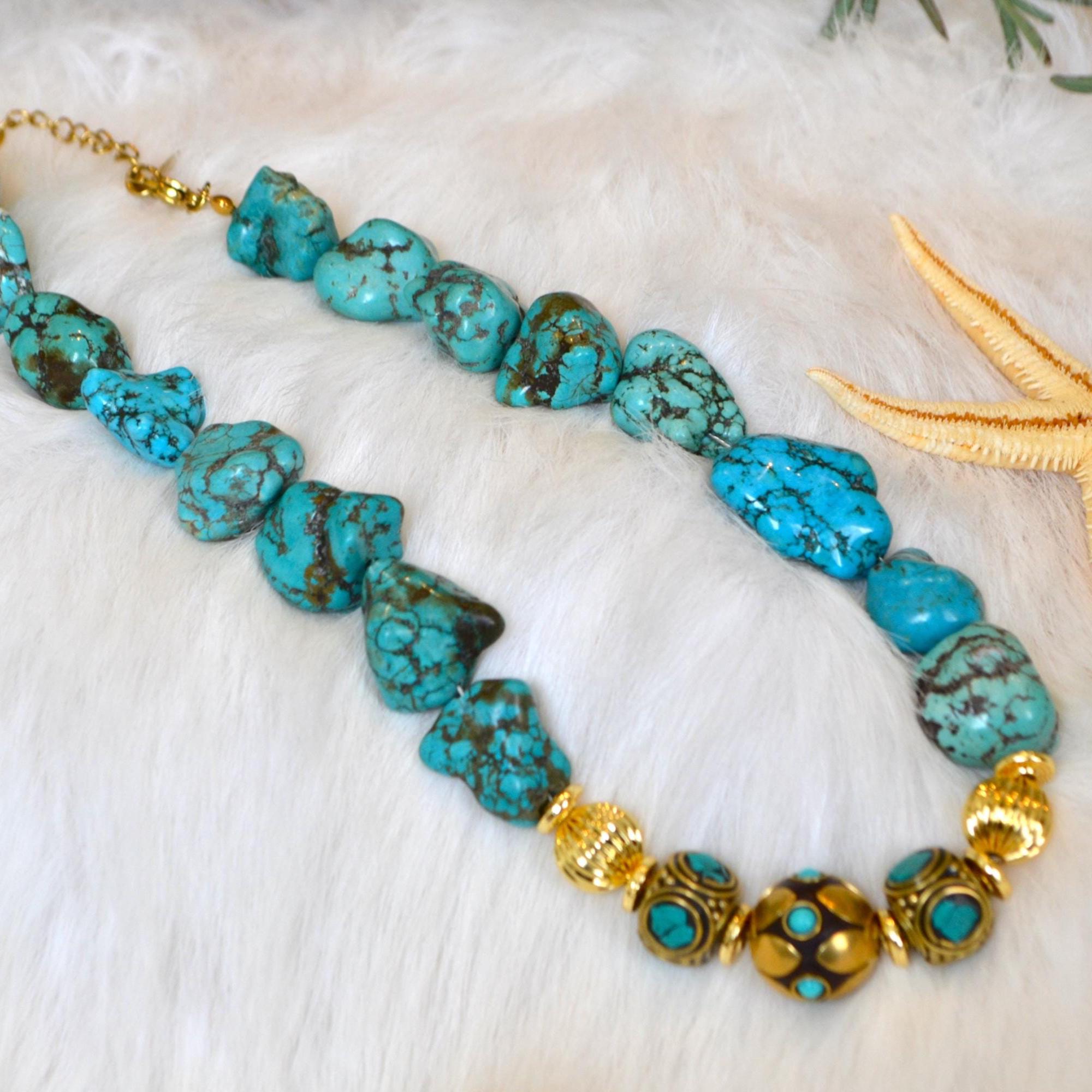 Make a bold statement with this turquoise nugget necklace, a striking piece of blue gemstone jewelry inspired by ocean colors and effortless summer style. Designed with natural turquoise stones and gold accents, this chunky turquoise statement necklace brings a vibrant boho look perfect for beach outfits, vacation styling, or everyday elegance.