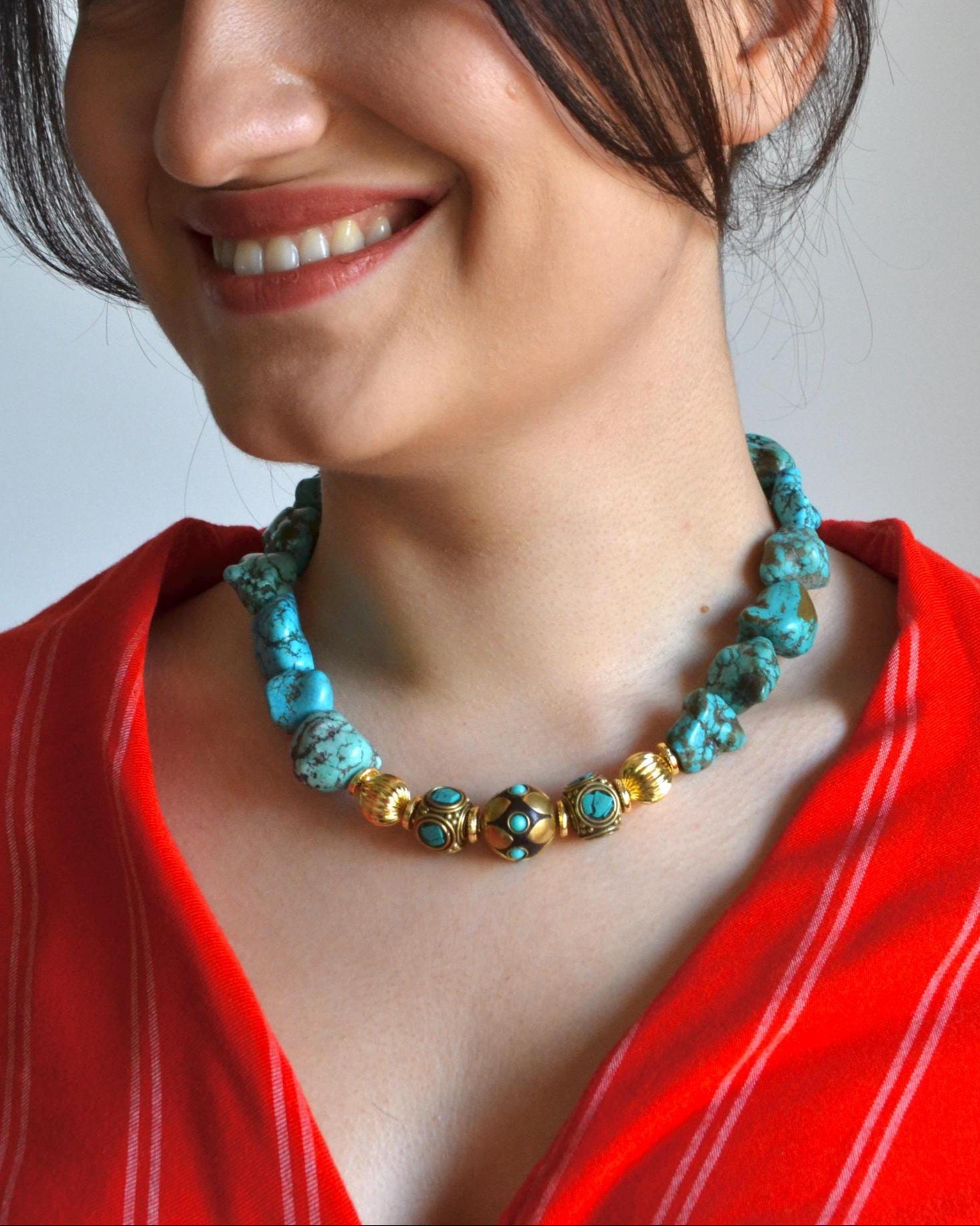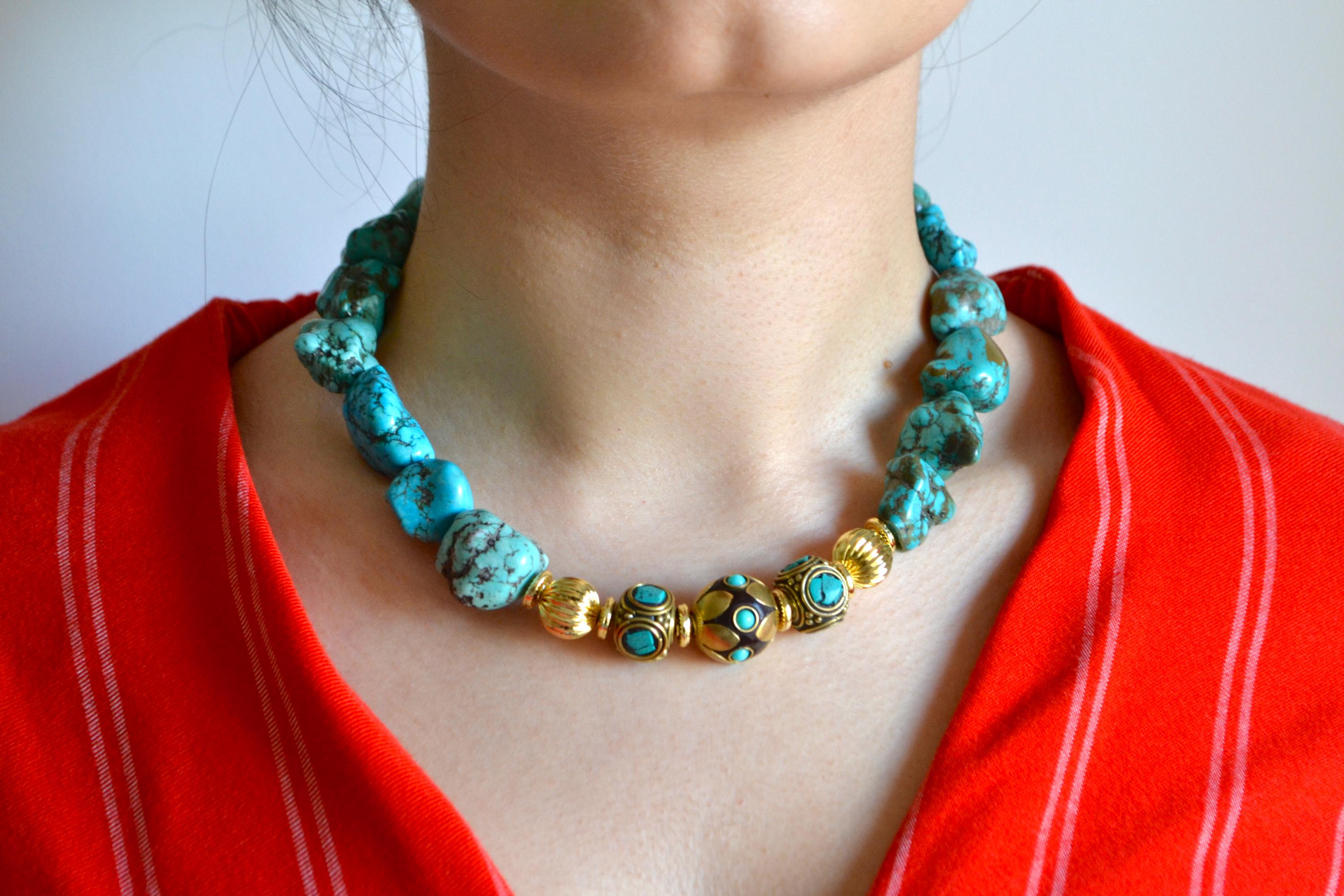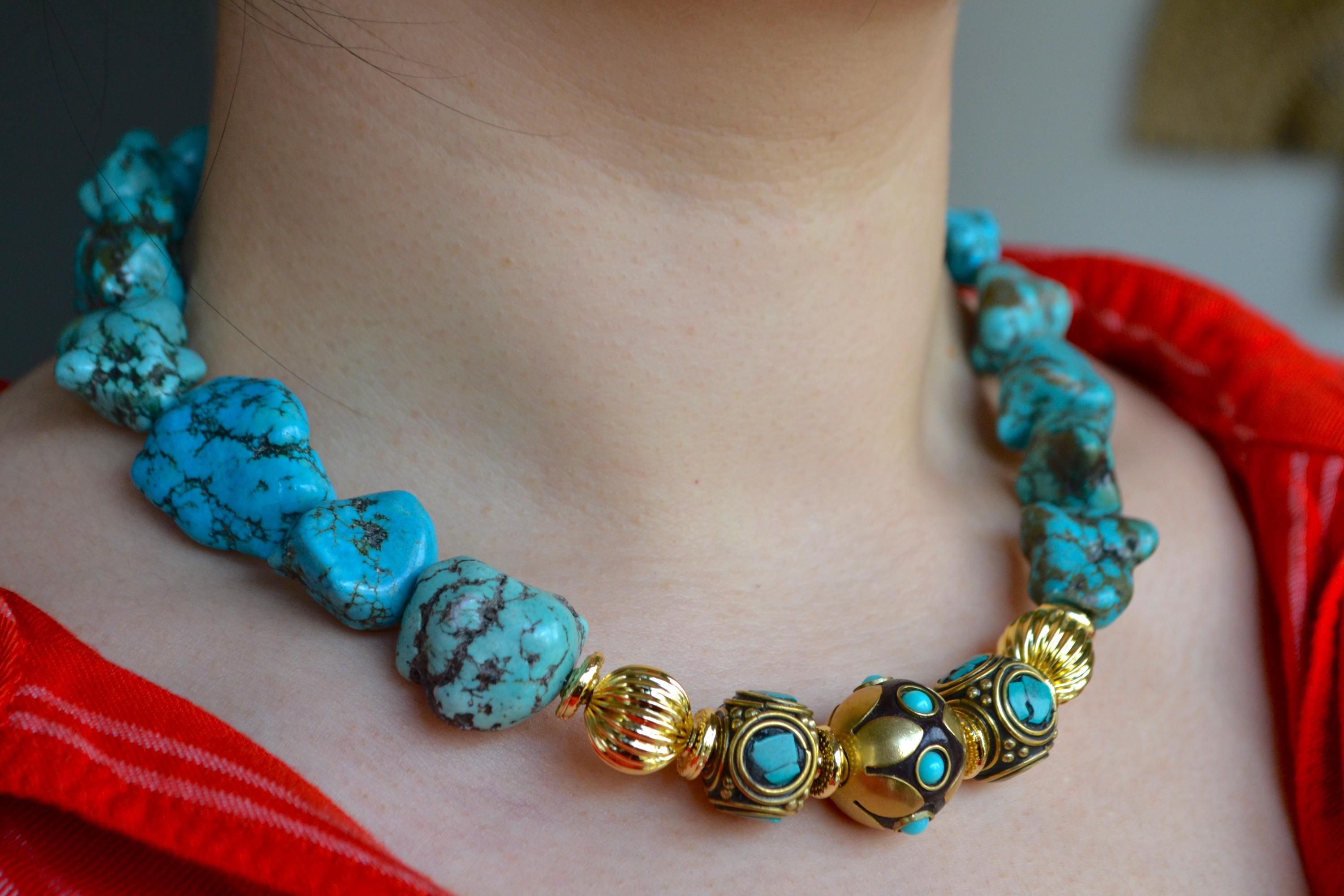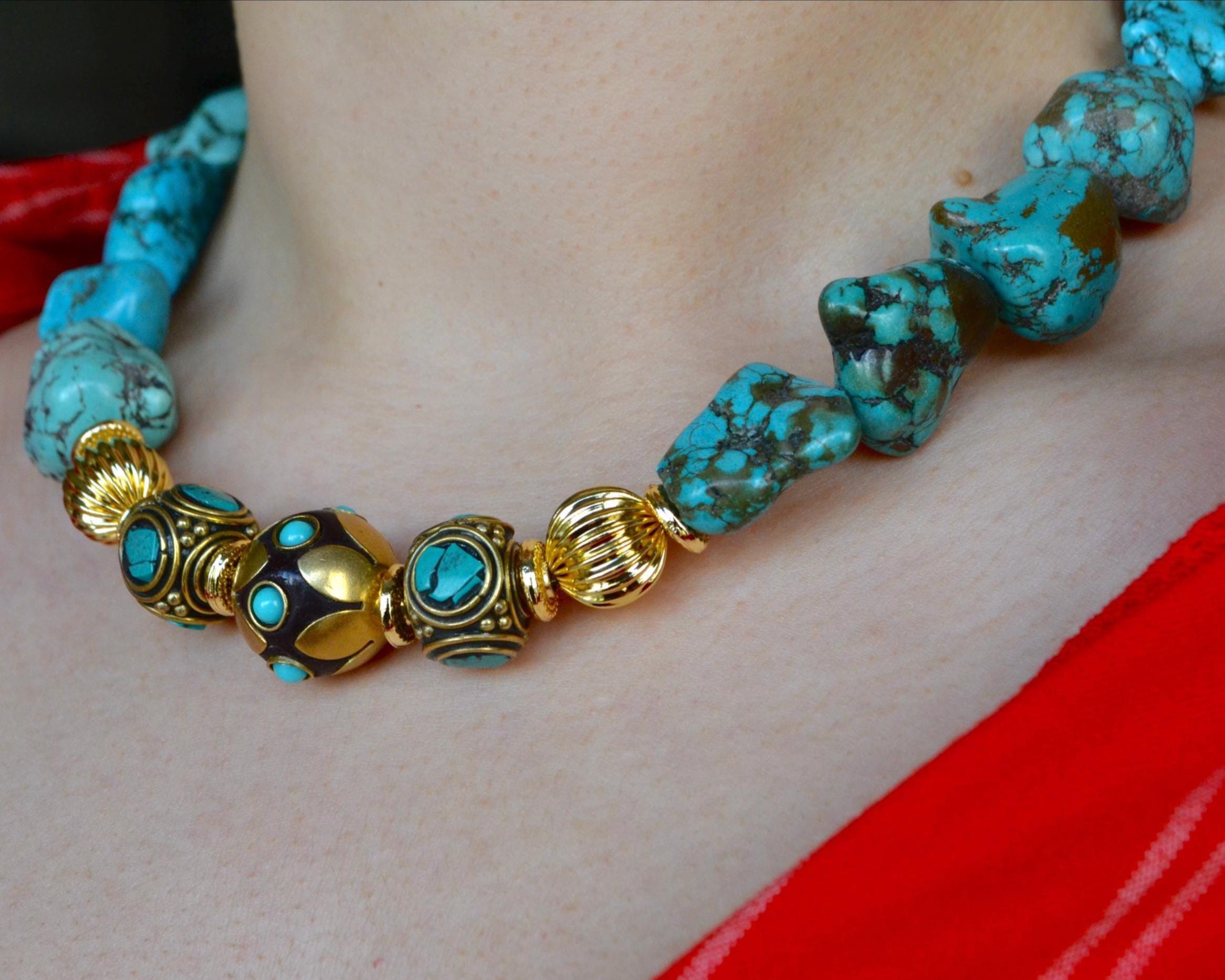 Make a bold statement with this turquoise nugget necklace, a striking piece of blue gemstone jewelry inspired by ocean colors and effortless summer style. Designed with natural turquoise stones and gold accents, this chunky turquoise statement necklace brings a vibrant boho look perfect for beach outfits, vacation styling, or everyday elegance.