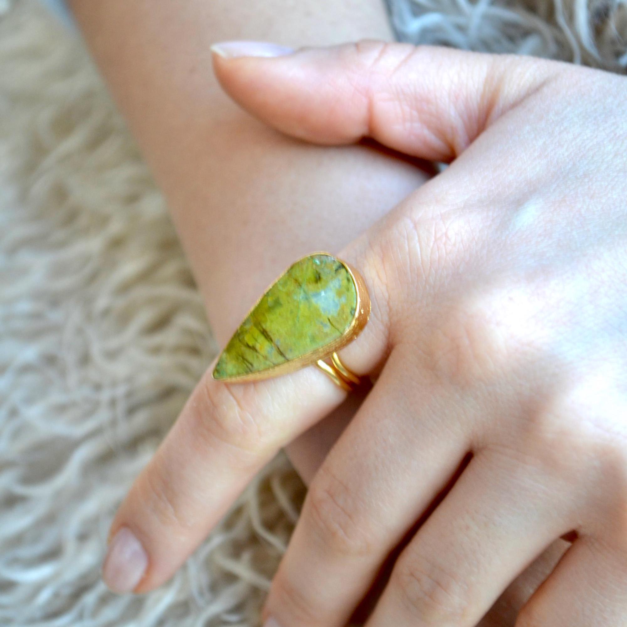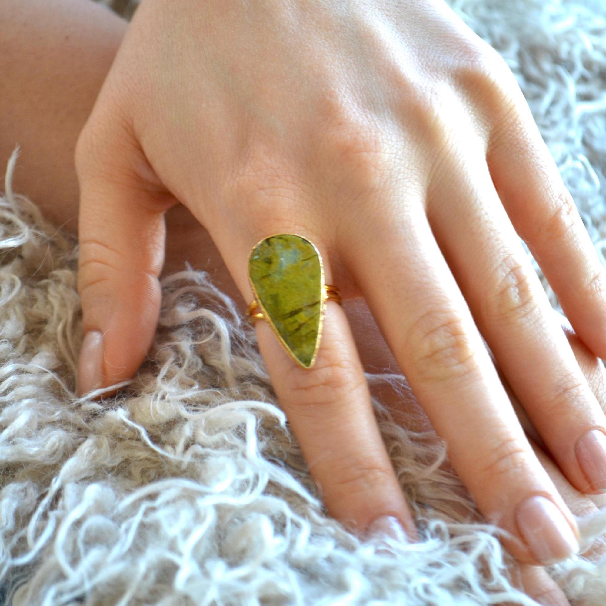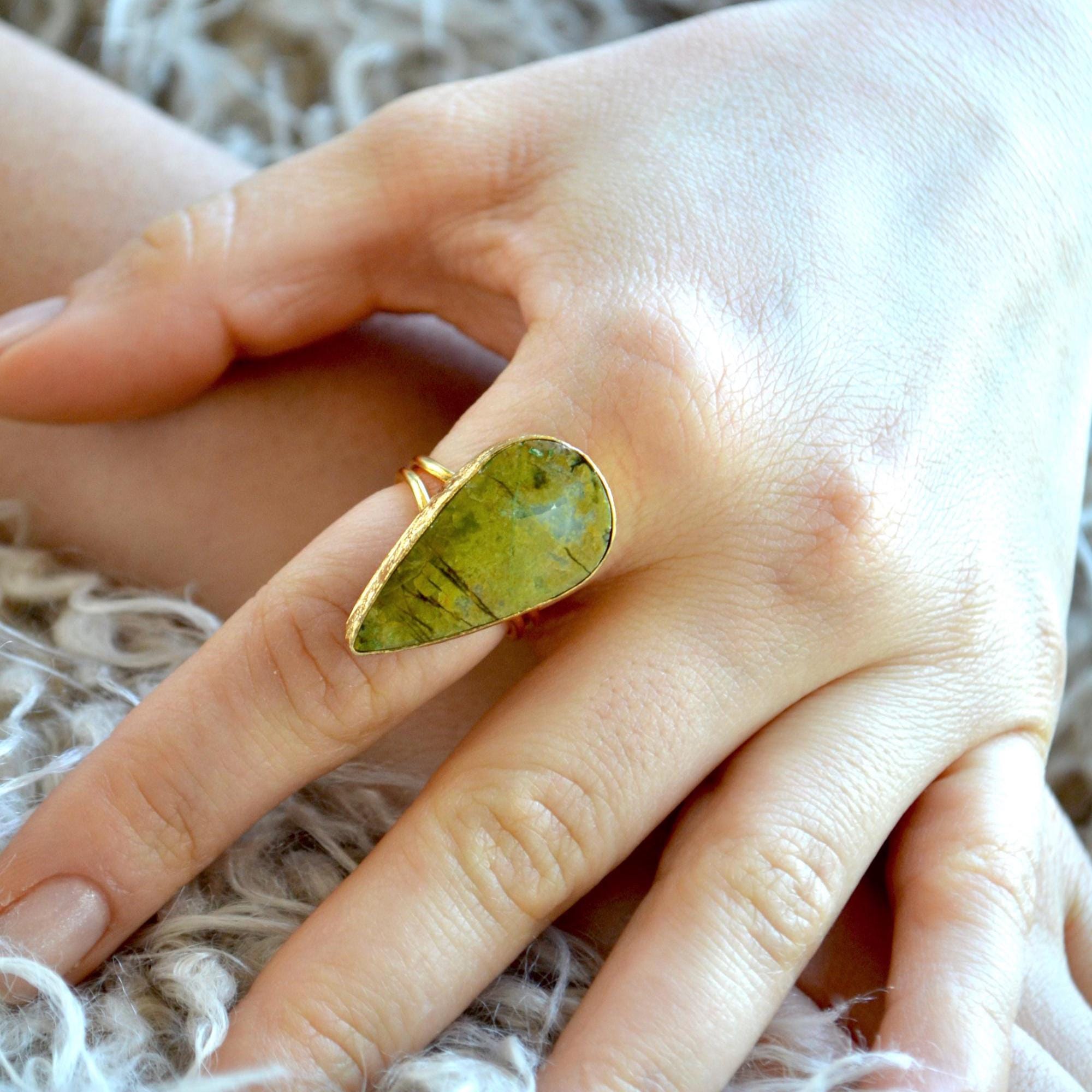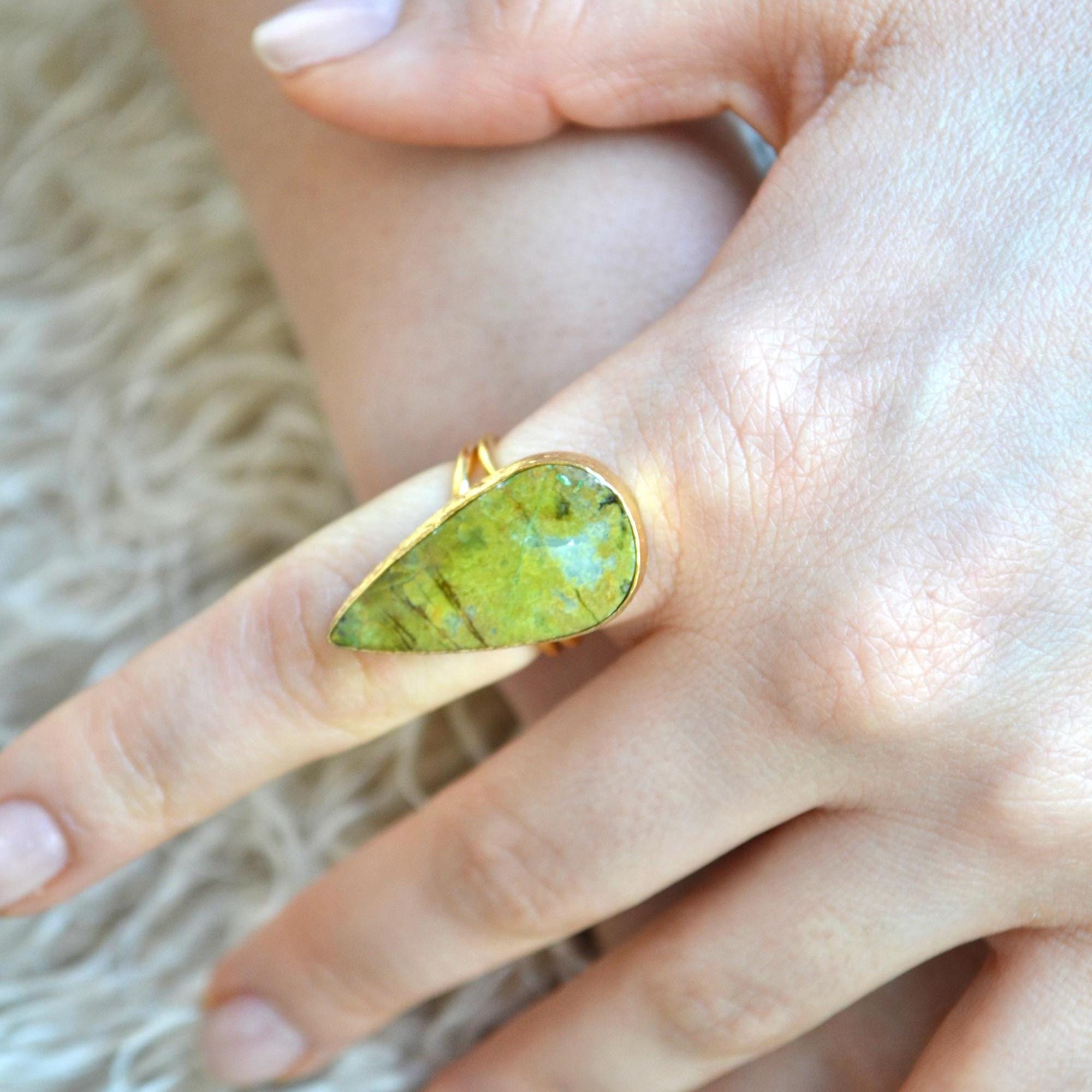 Teardrop Green Stone Ring, Pear Shape Adjustable Statement Jewelry, Minimal Natural Gem Gift for Her