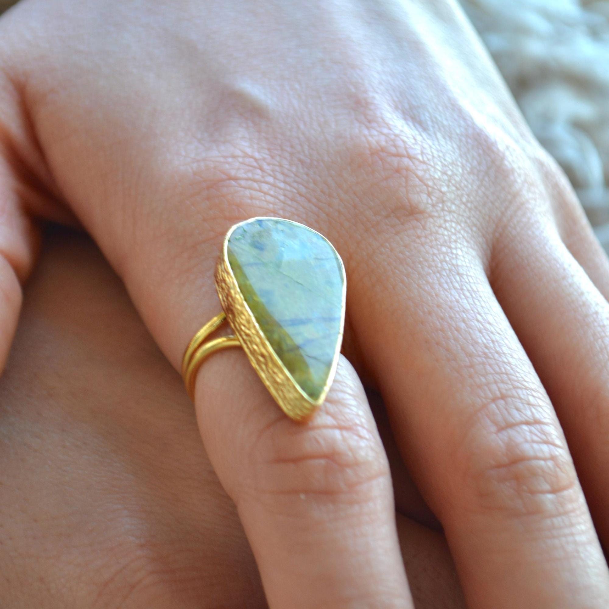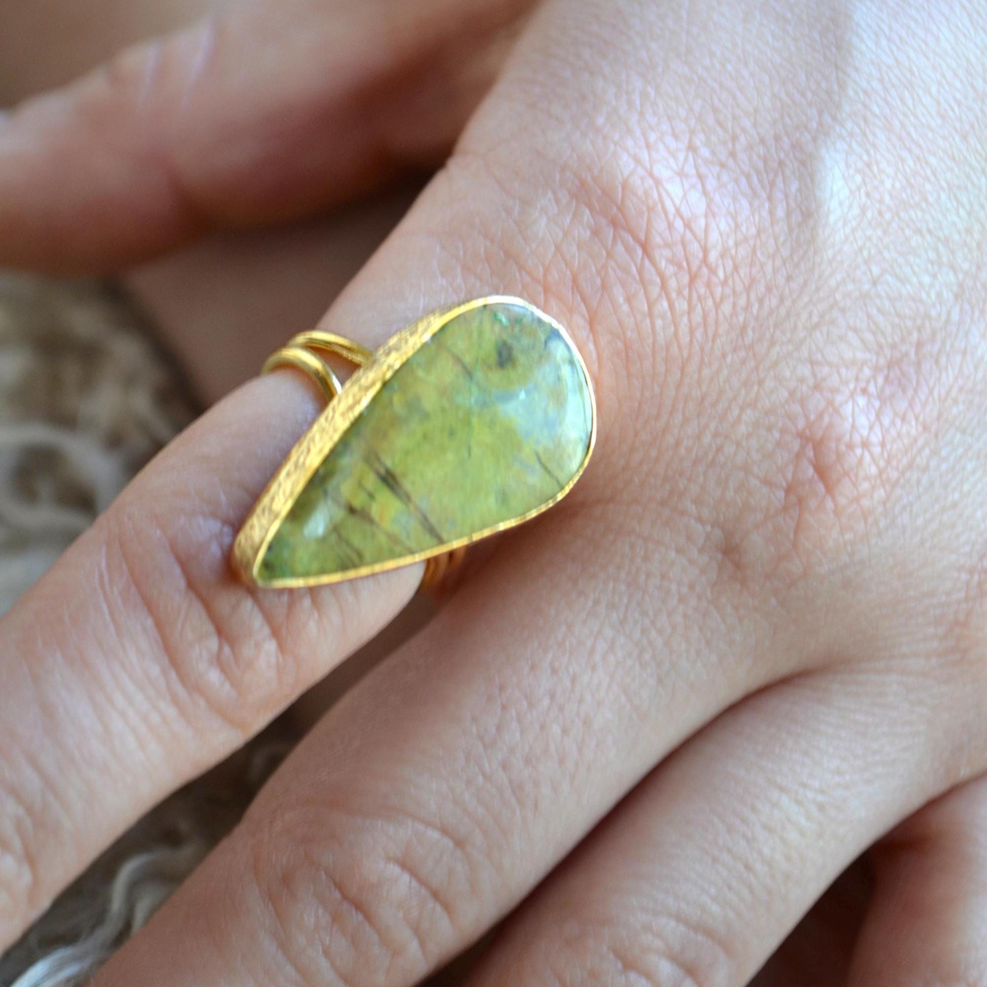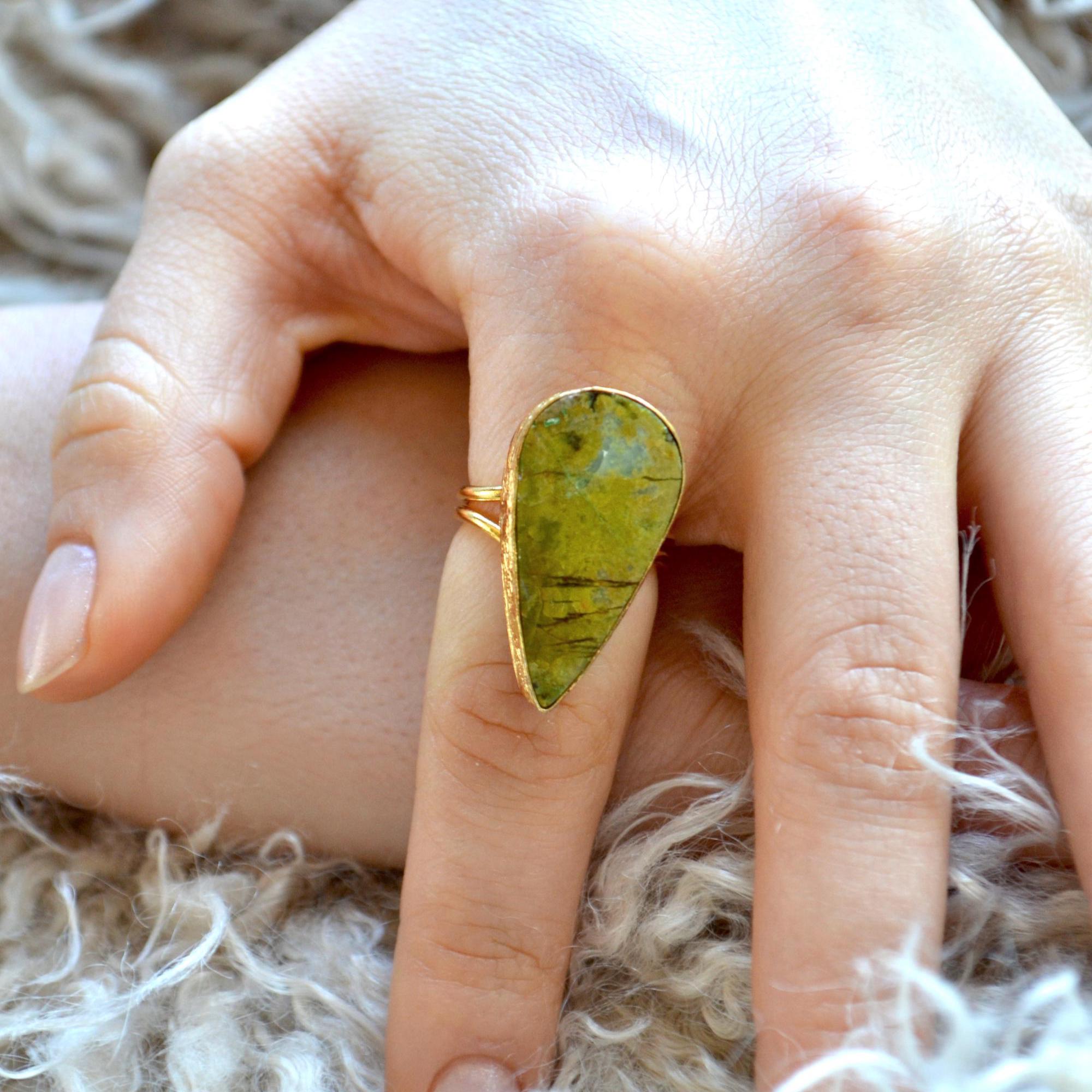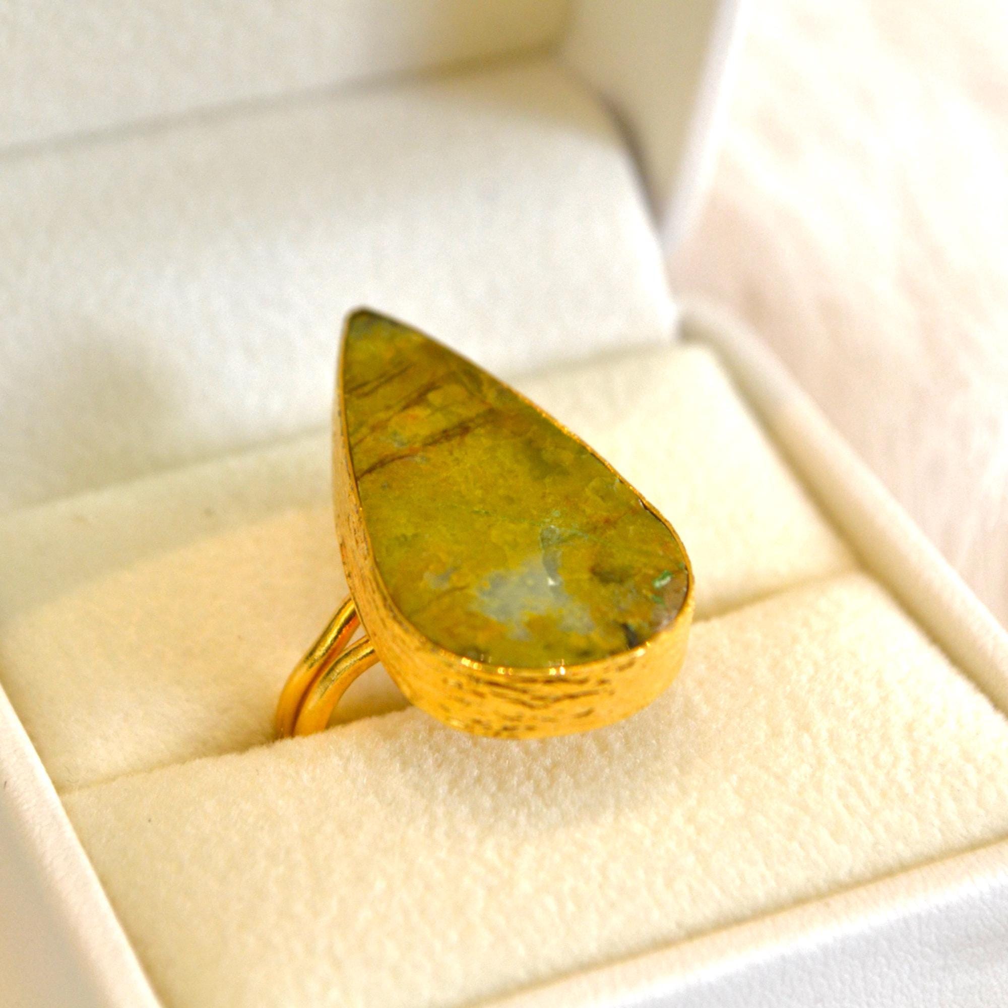 Teardrop Green Stone Ring, Pear Shape Adjustable Statement Jewelry, Minimal Natural Gem Gift for Her