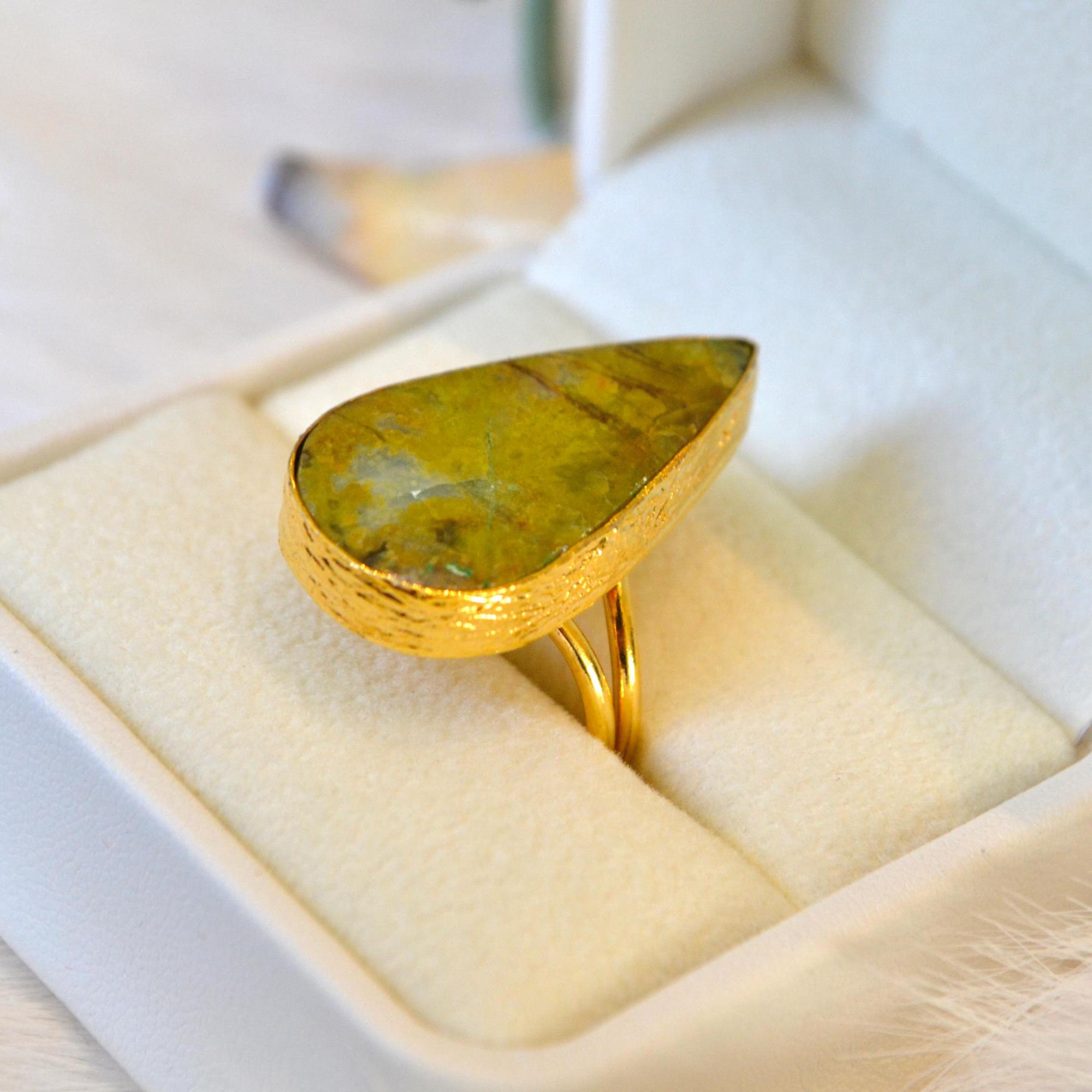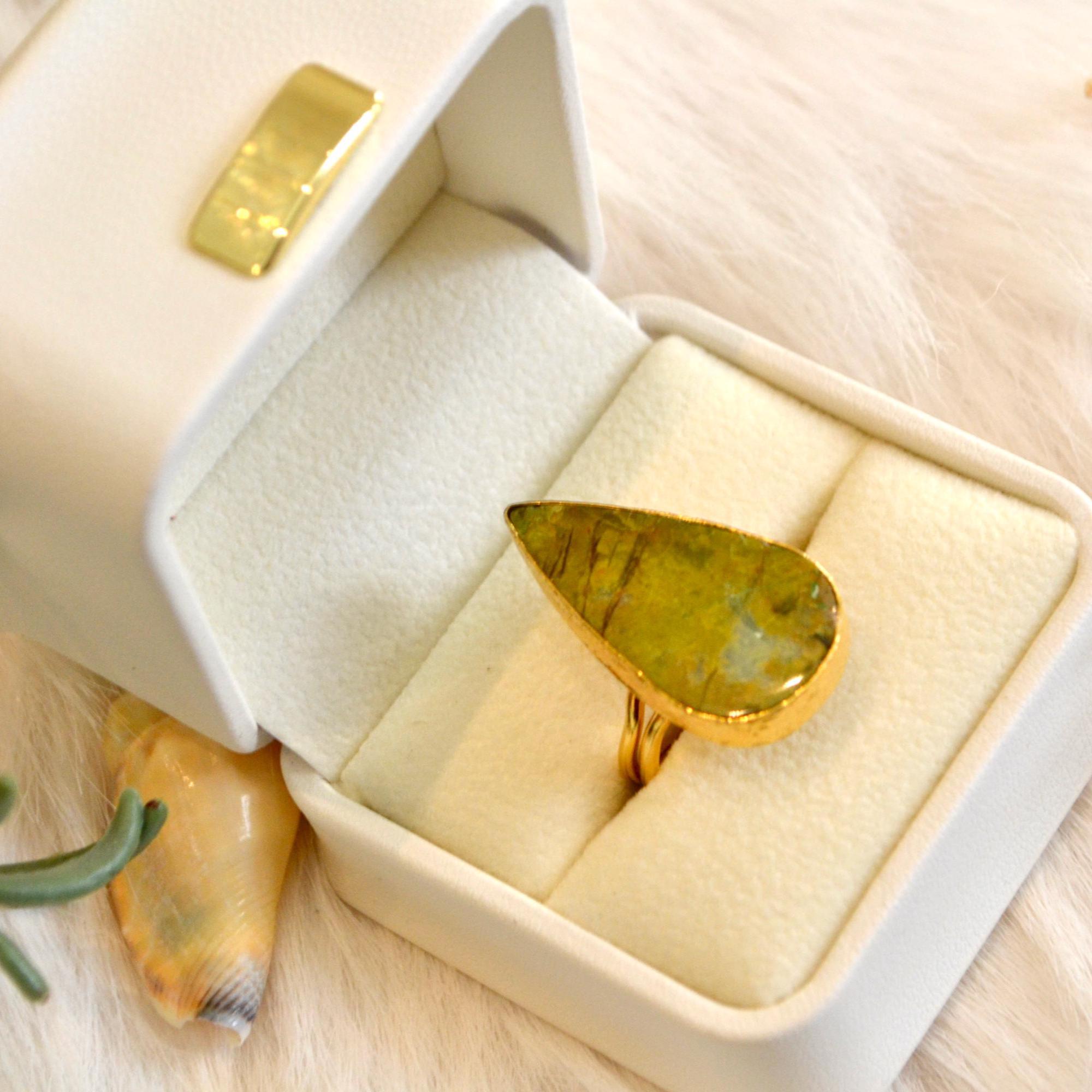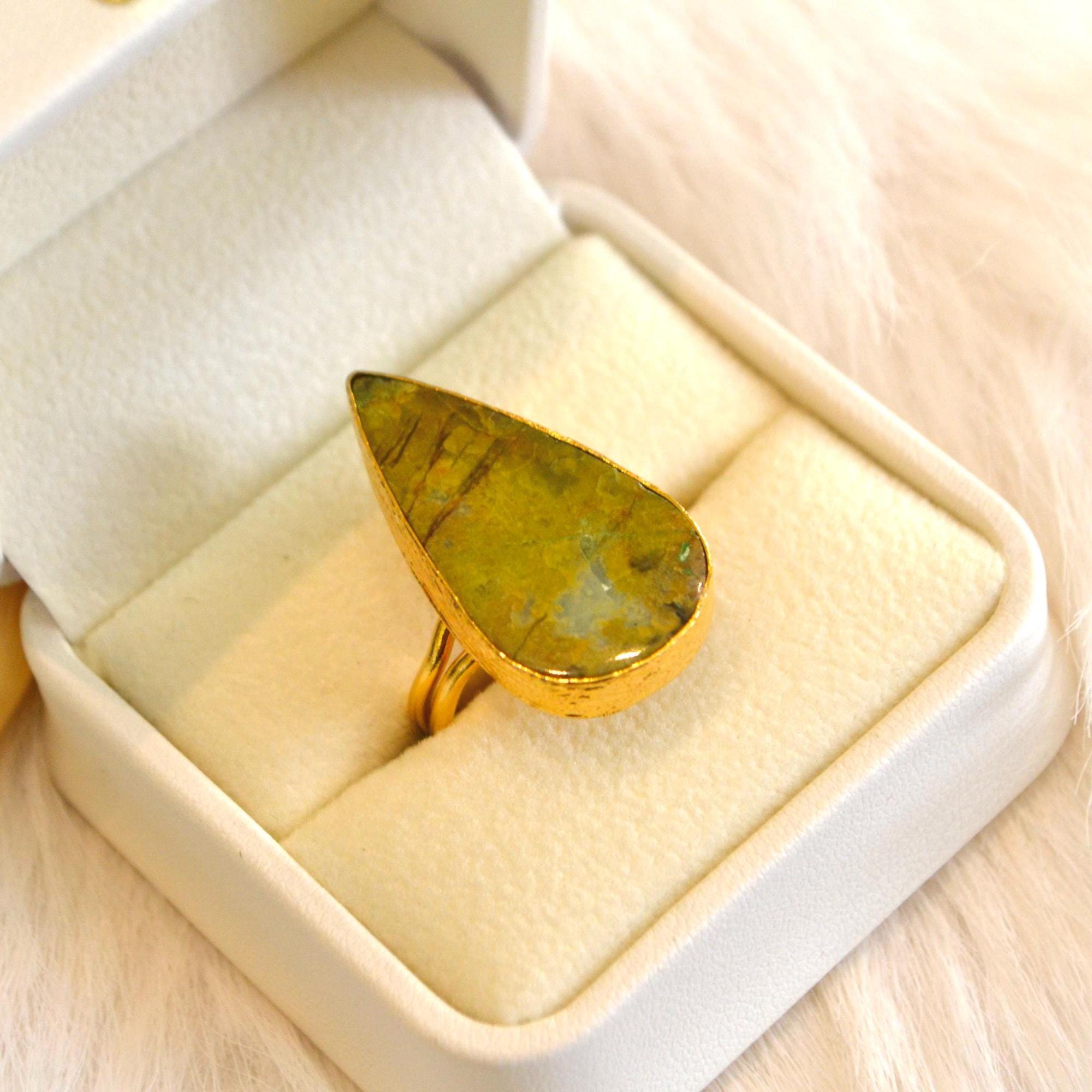 Finished with 22K gold plating, the setting adds a warm, refined glow that beautifully complements the earthy green tones of the stone. The adjustable band ensures a comfortable fit, making this ring a thoughtful and effortless gift option.
