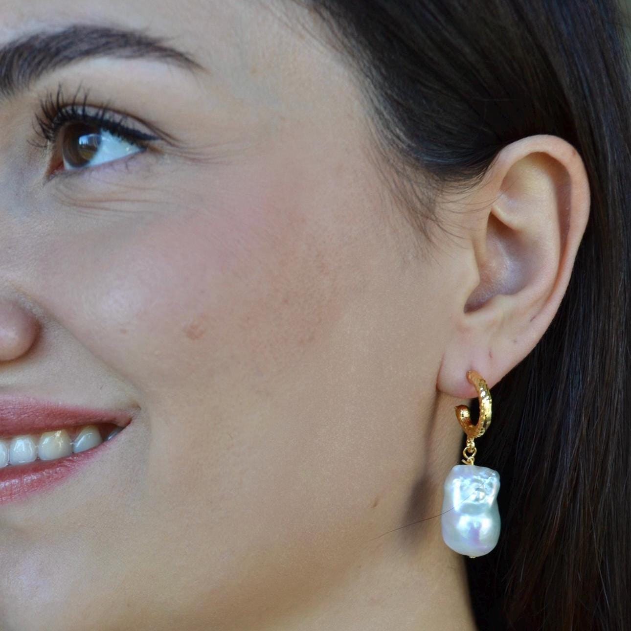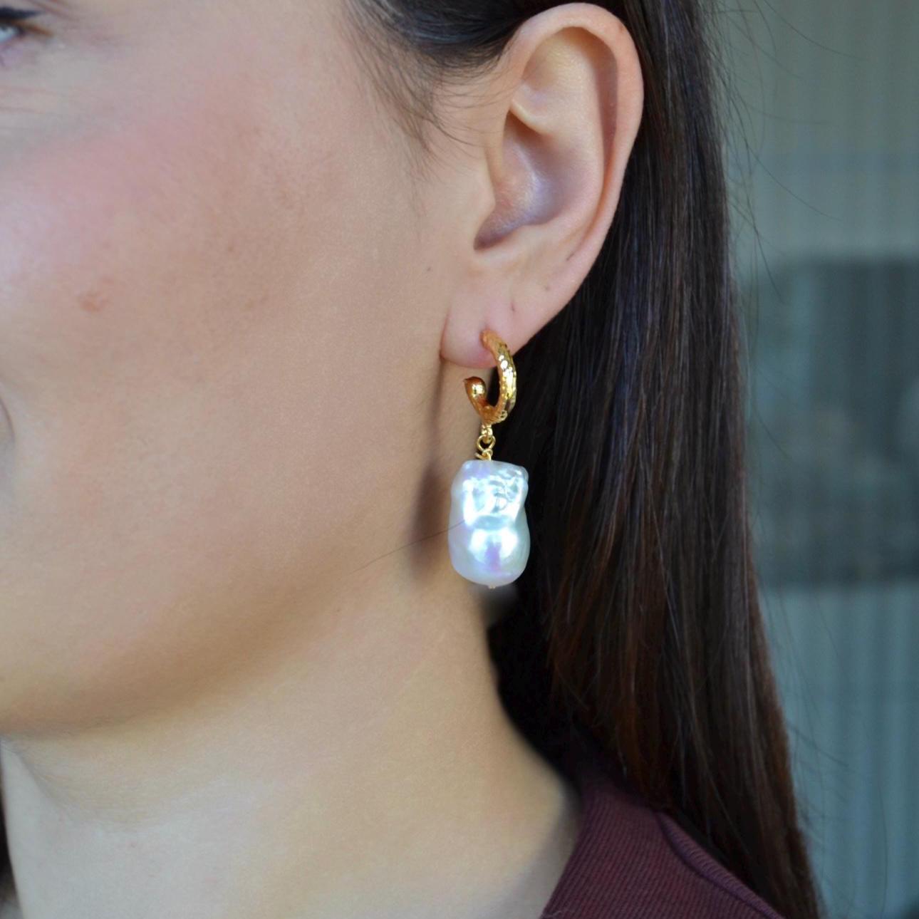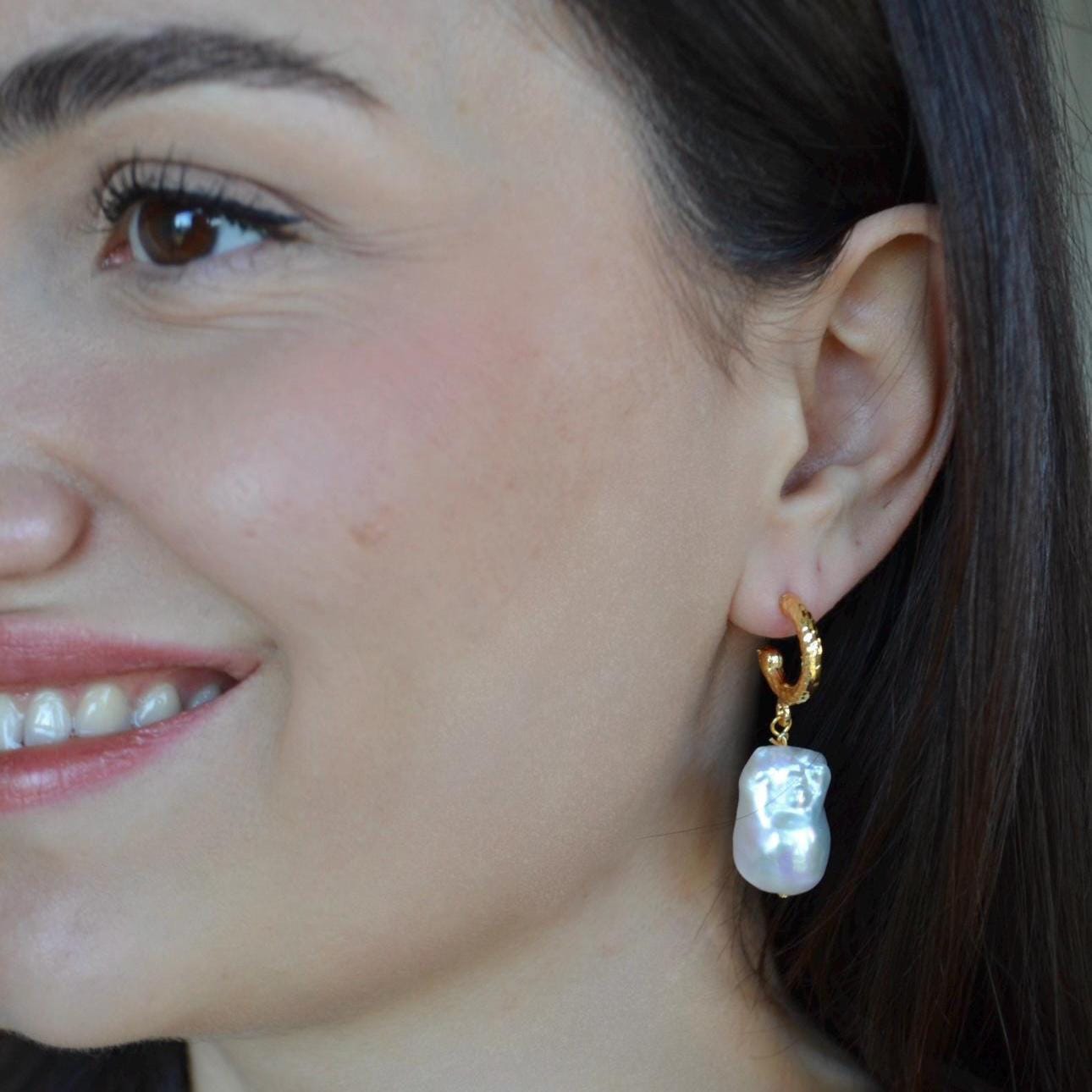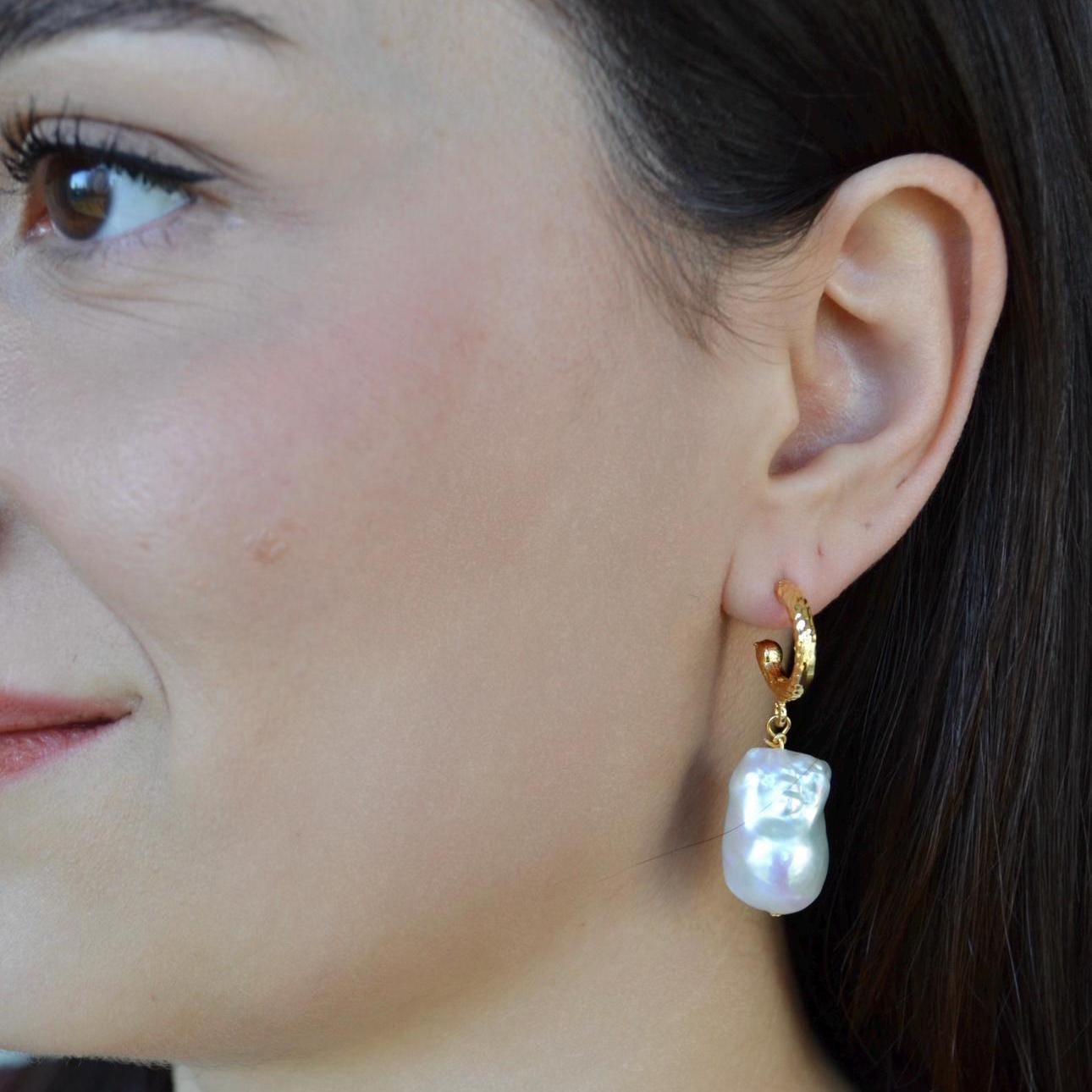 Baroque Pearl Drop Hoop Earrings, Gold Textured Huggie Dangles, Irregular Freshwater Pearl Statement Jewelry, Elegant Gift for Her