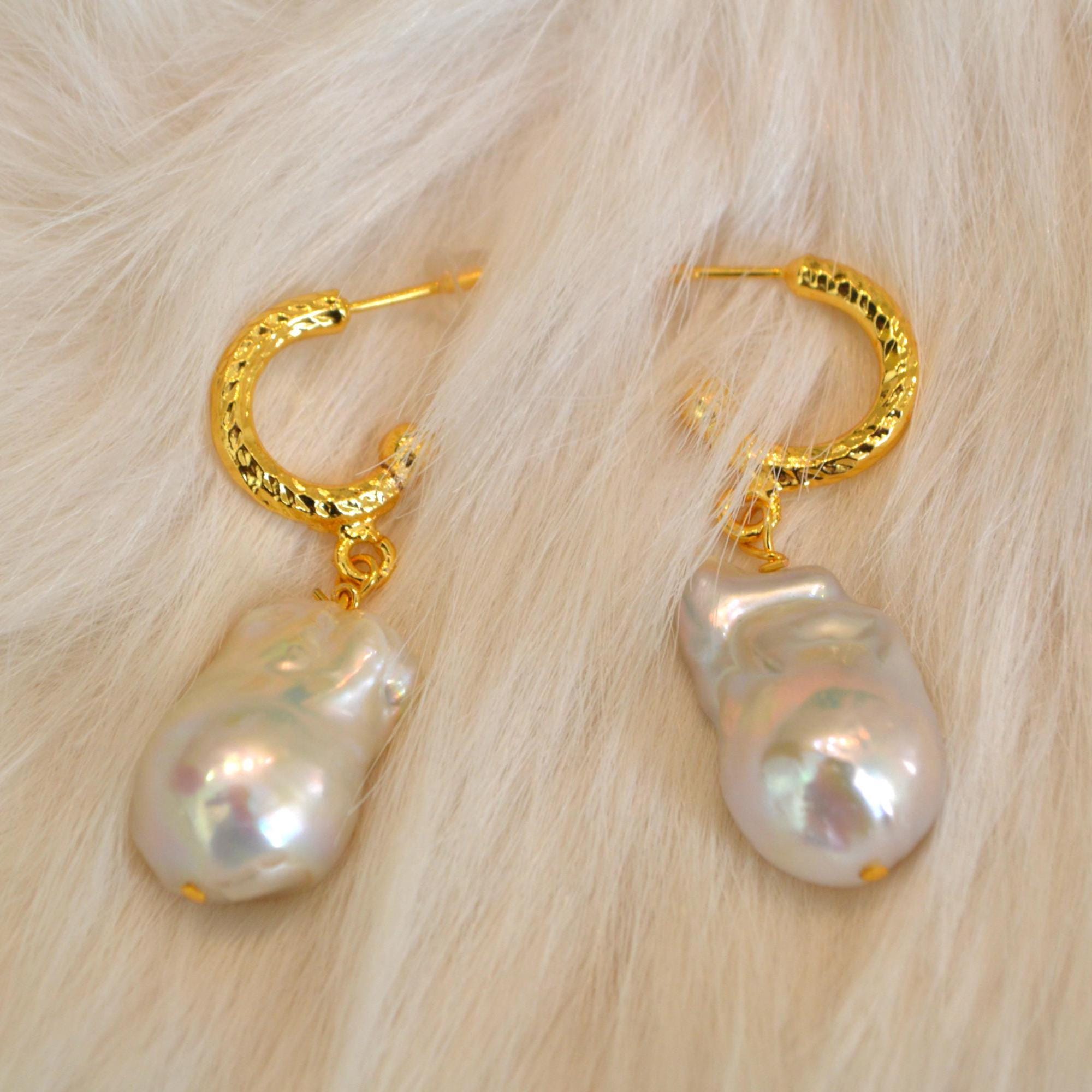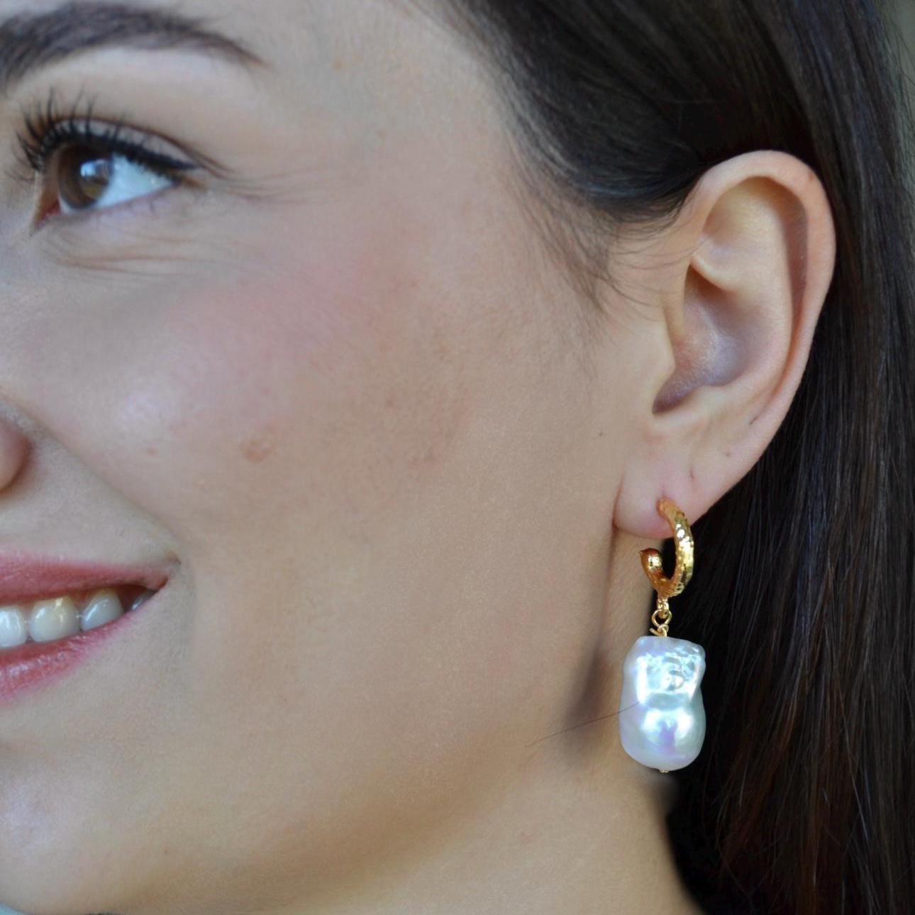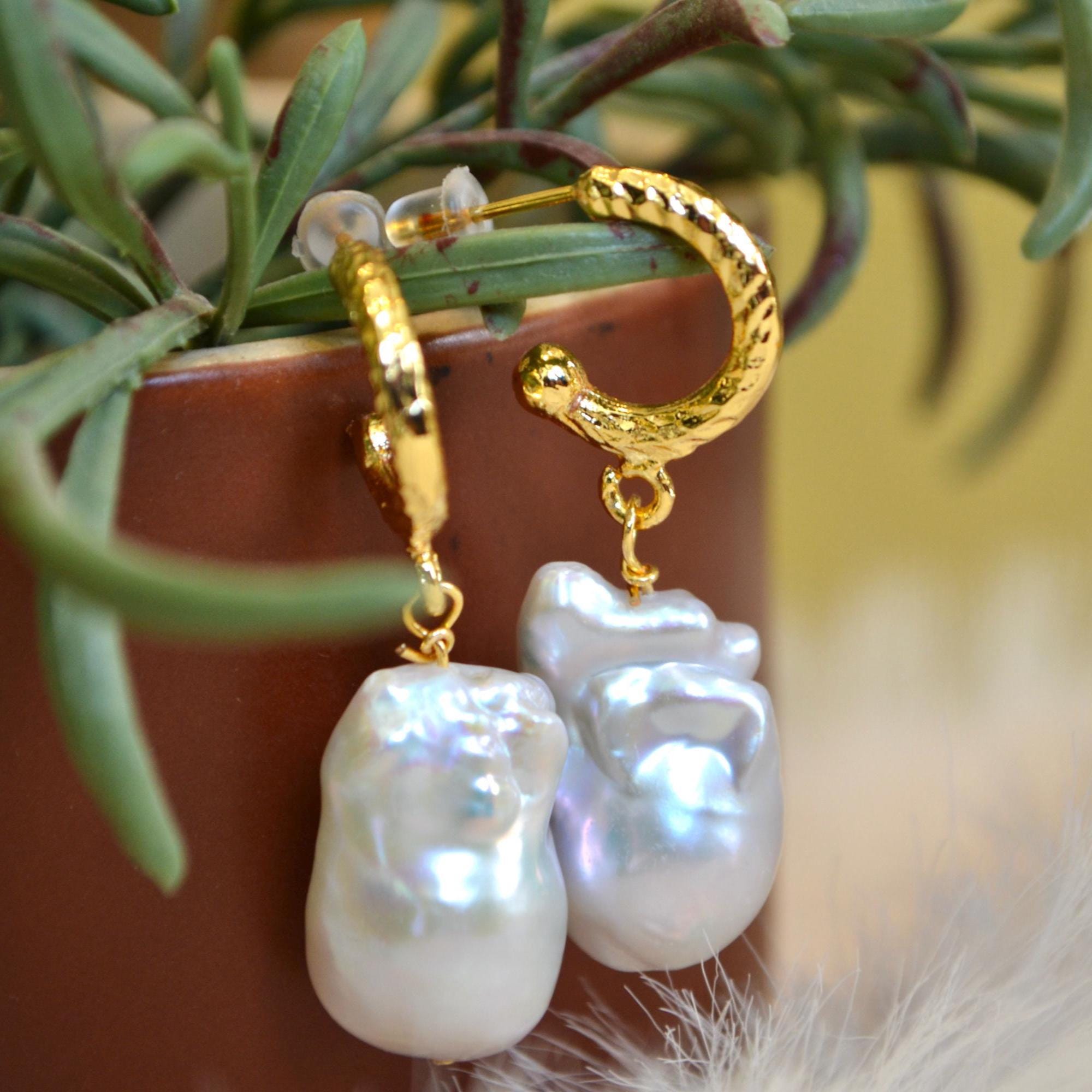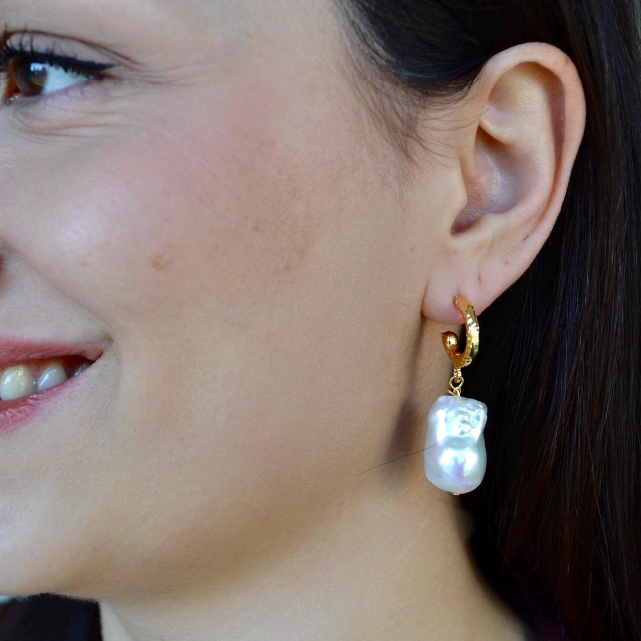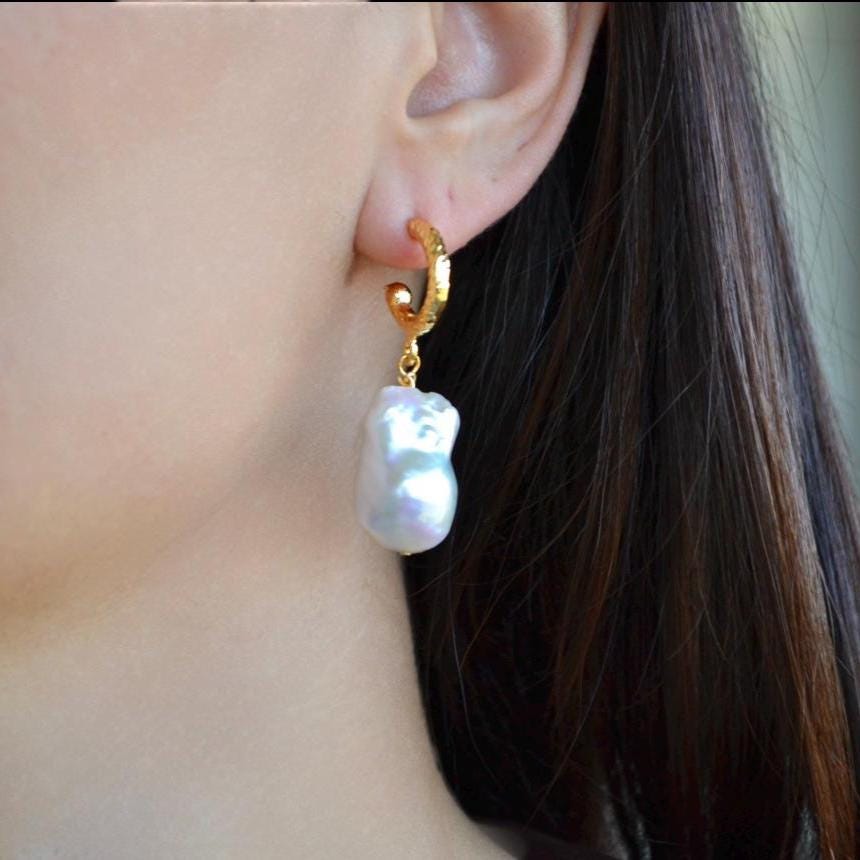 Baroque Pearl Drop Hoop Earrings, Gold Textured Huggie Dangles, Irregular Freshwater Pearl Statement Jewelry, Elegant Gift for Her
