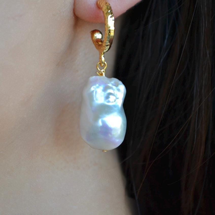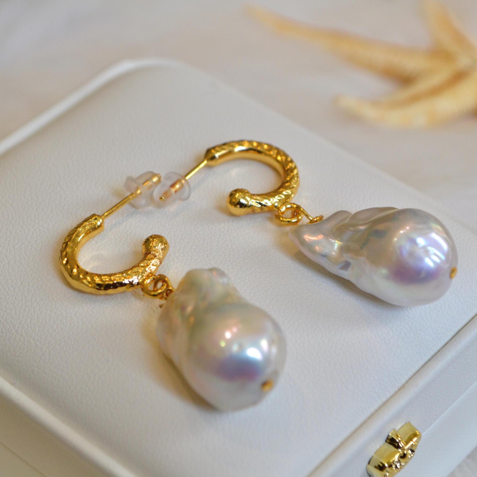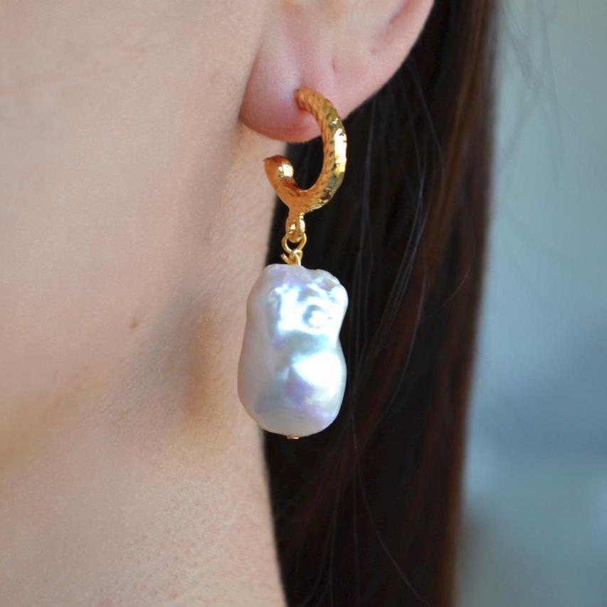 These gold hoop earrings are finished with luminous baroque freshwater pearls, each one naturally irregular and beautifully unique. Their organic shape catches the light from every angle, creating a soft glow that feels both elegant and effortless.