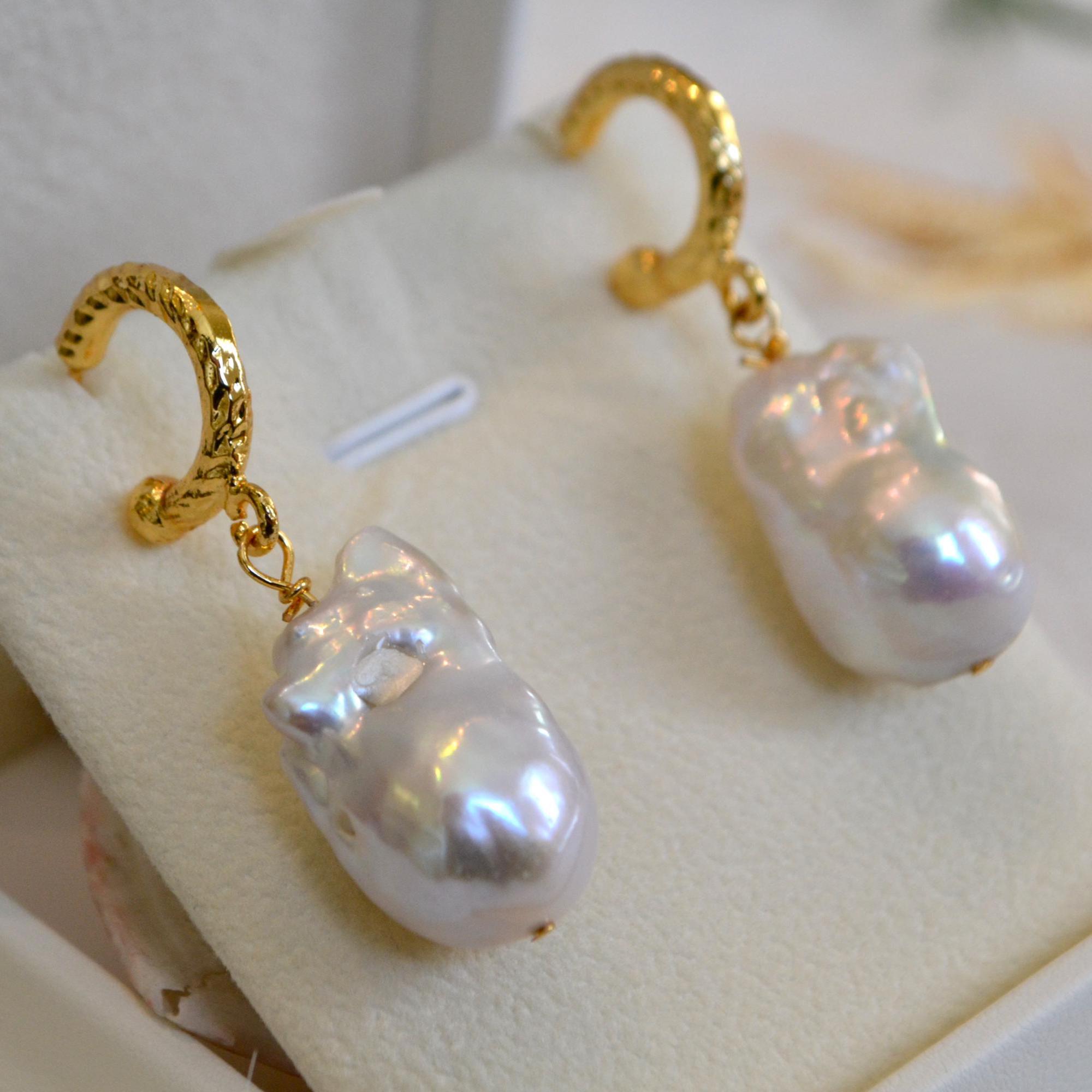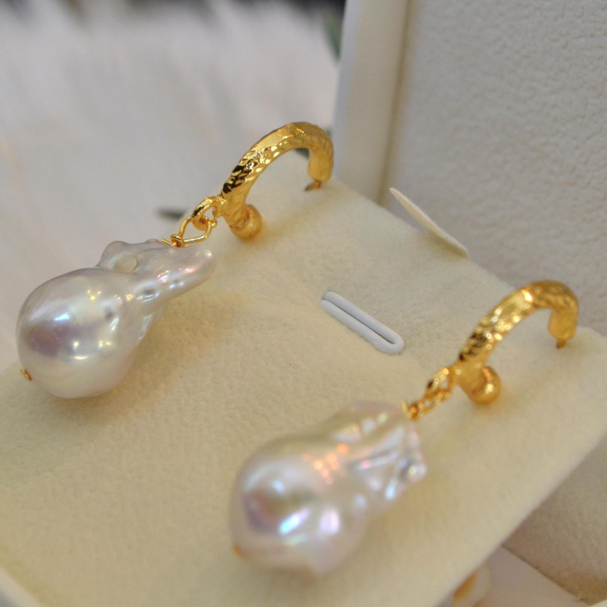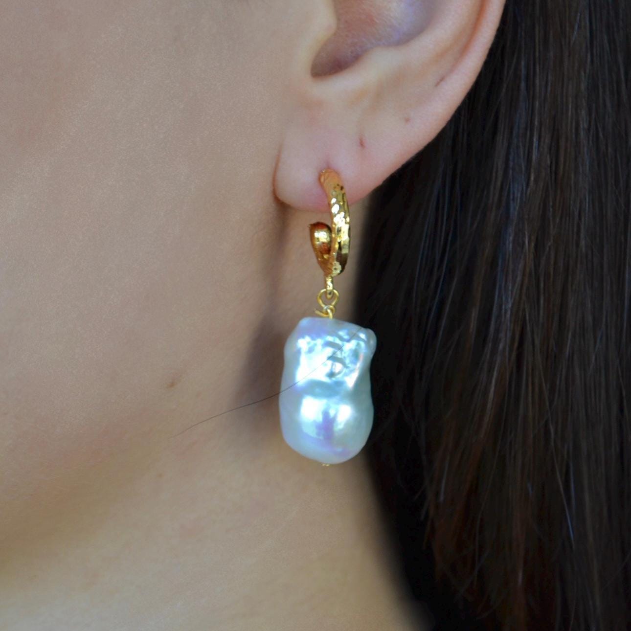 These gold hoop earrings are finished with luminous baroque freshwater pearls, each one naturally irregular and beautifully unique. Their organic shape catches the light from every angle, creating a soft glow that feels both elegant and effortless.