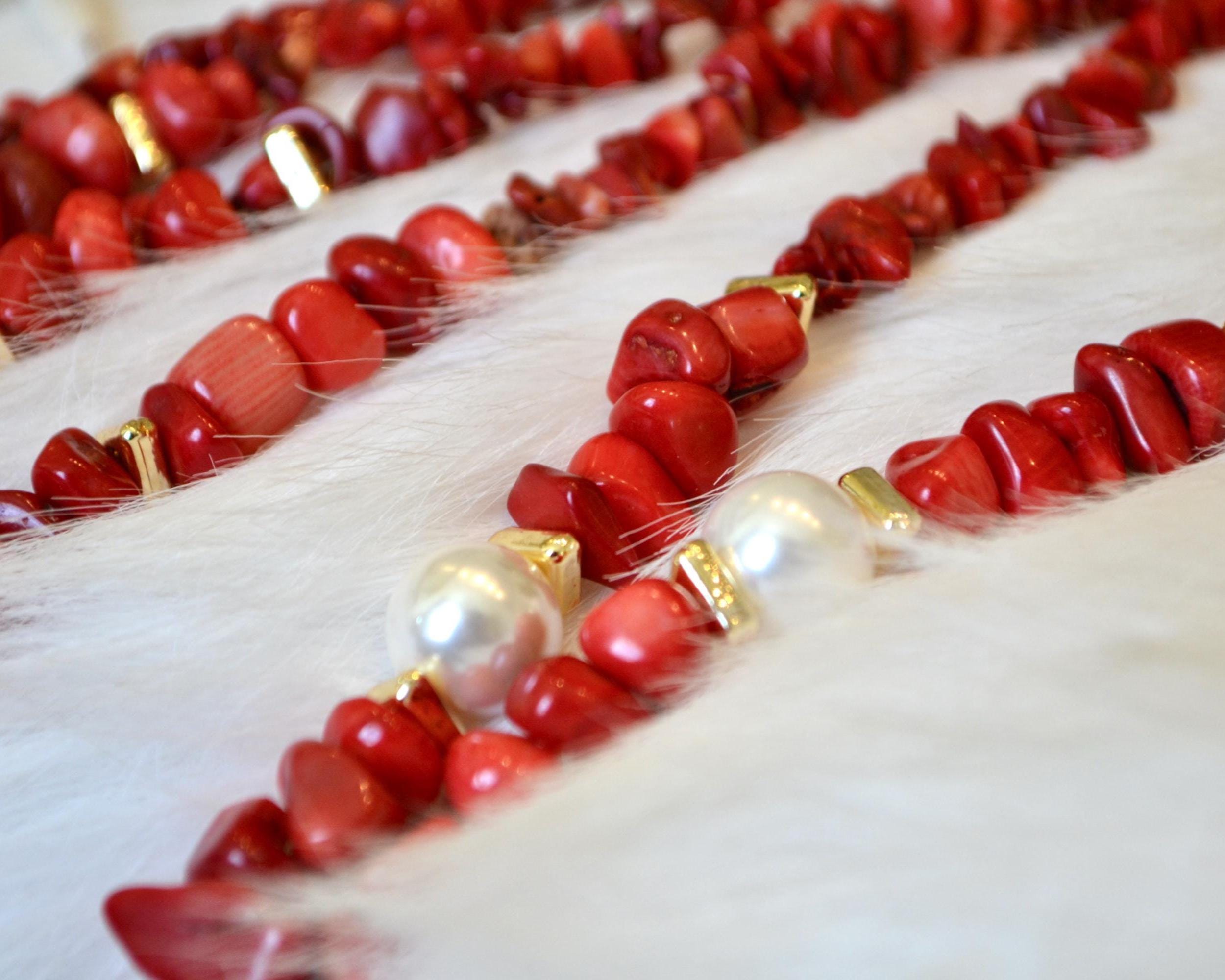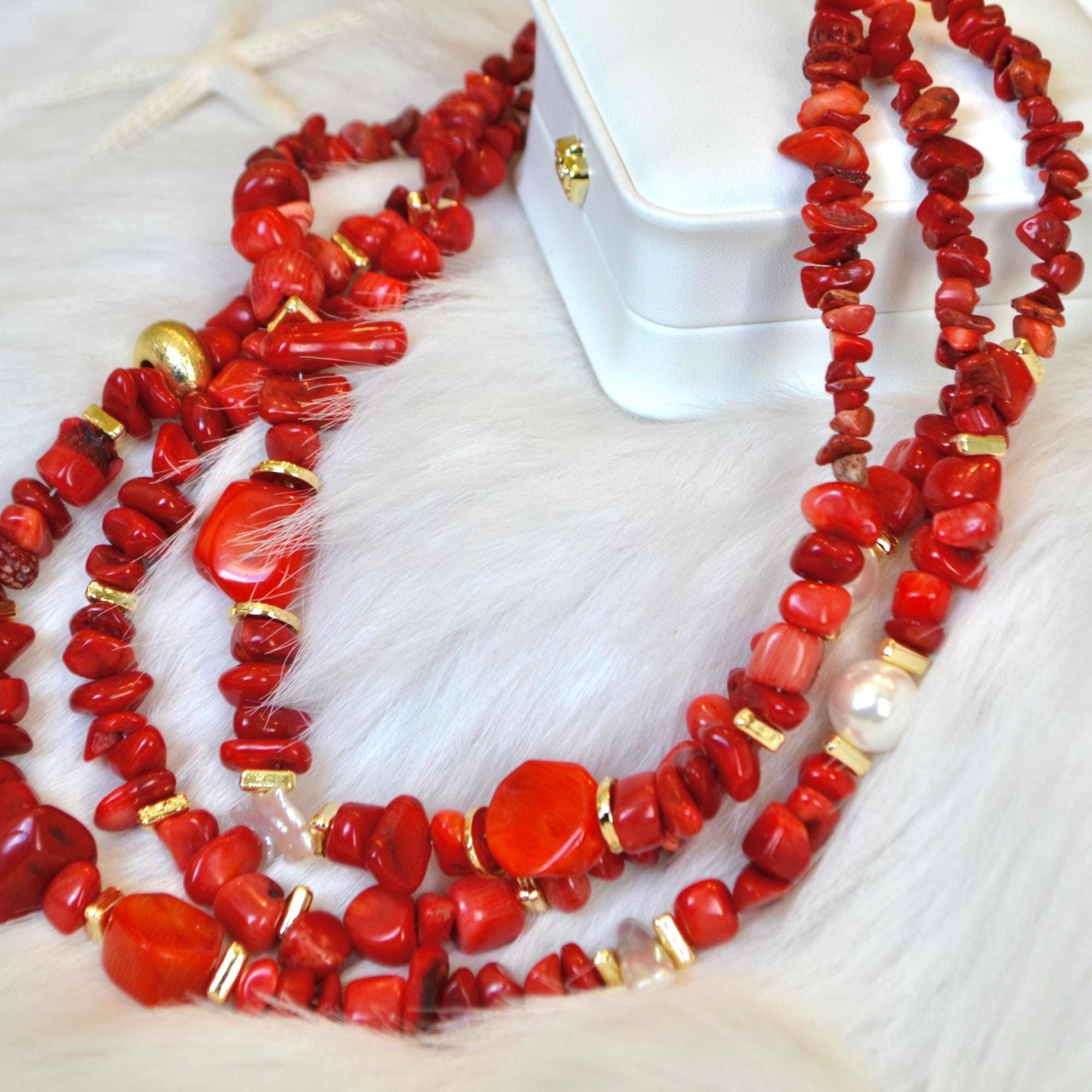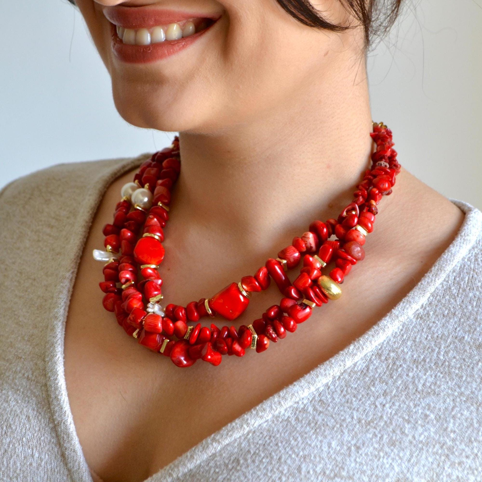 This red coral statement necklace features vibrant natural coral stones arranged in a bold layered design. The rich red color and organic shapes create a striking piece that instantly elevates any outfit.