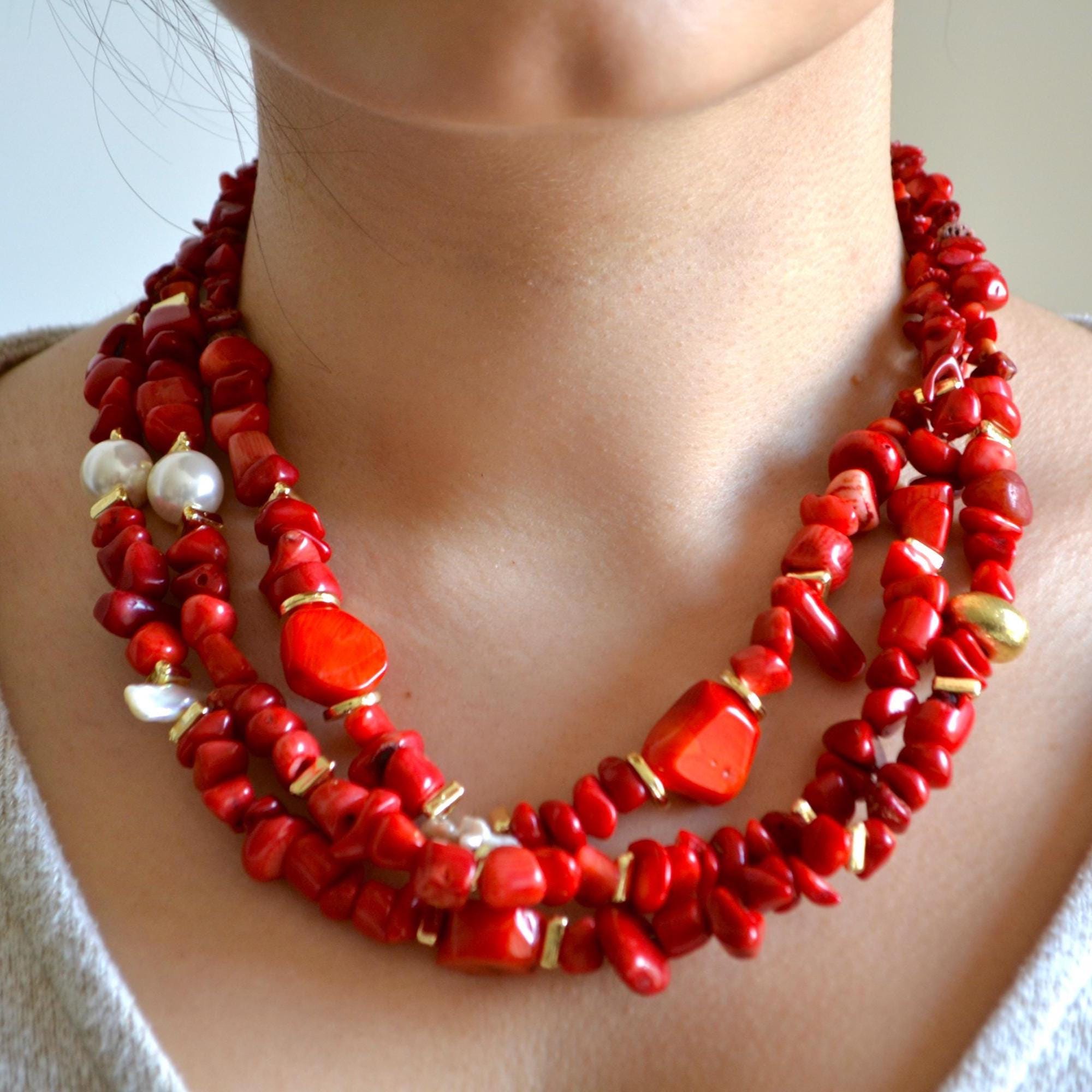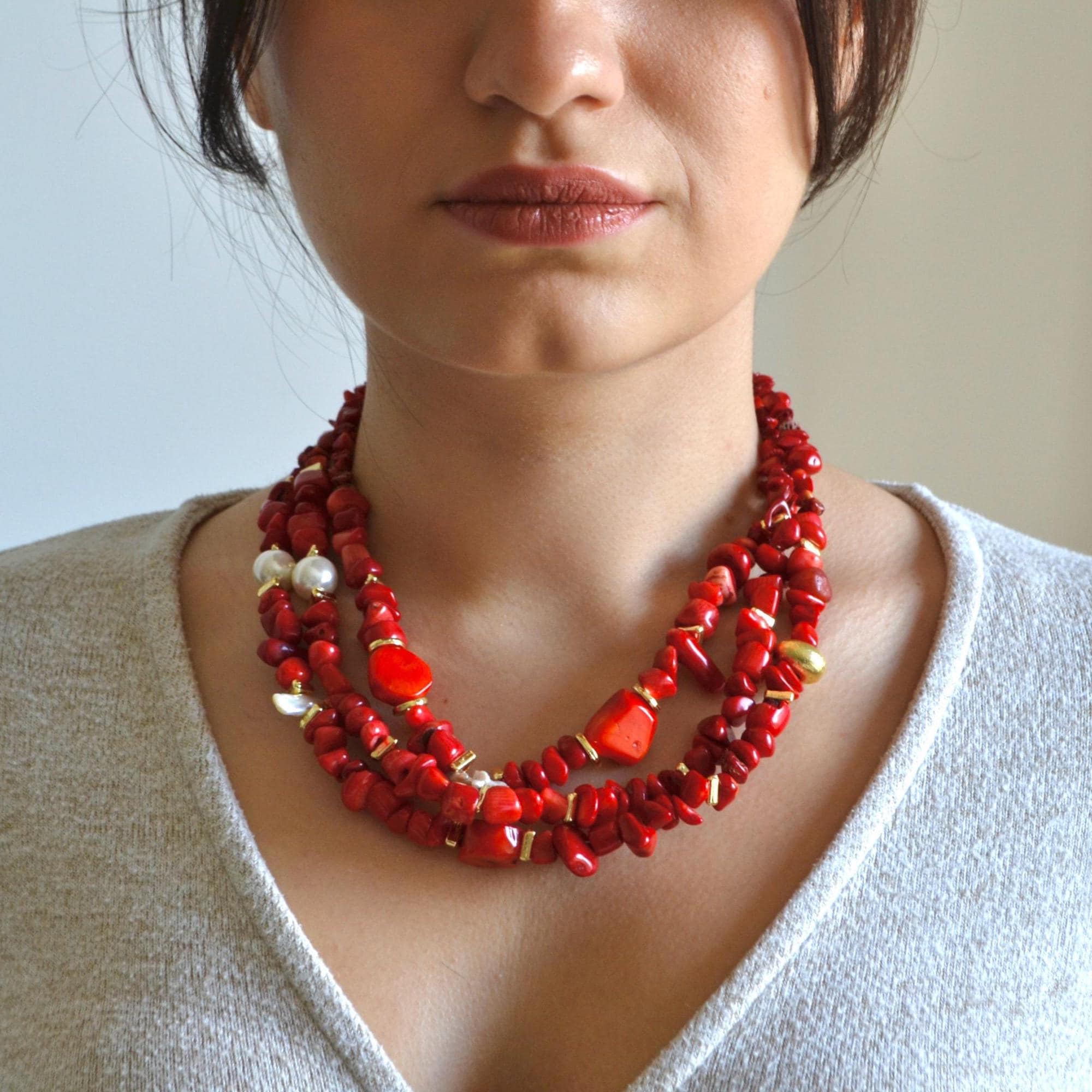Red Coral Statement Necklace Chunky Coral Necklace Bold Red Gemstone Jewelry Coral Beaded Necklace Gift for Her