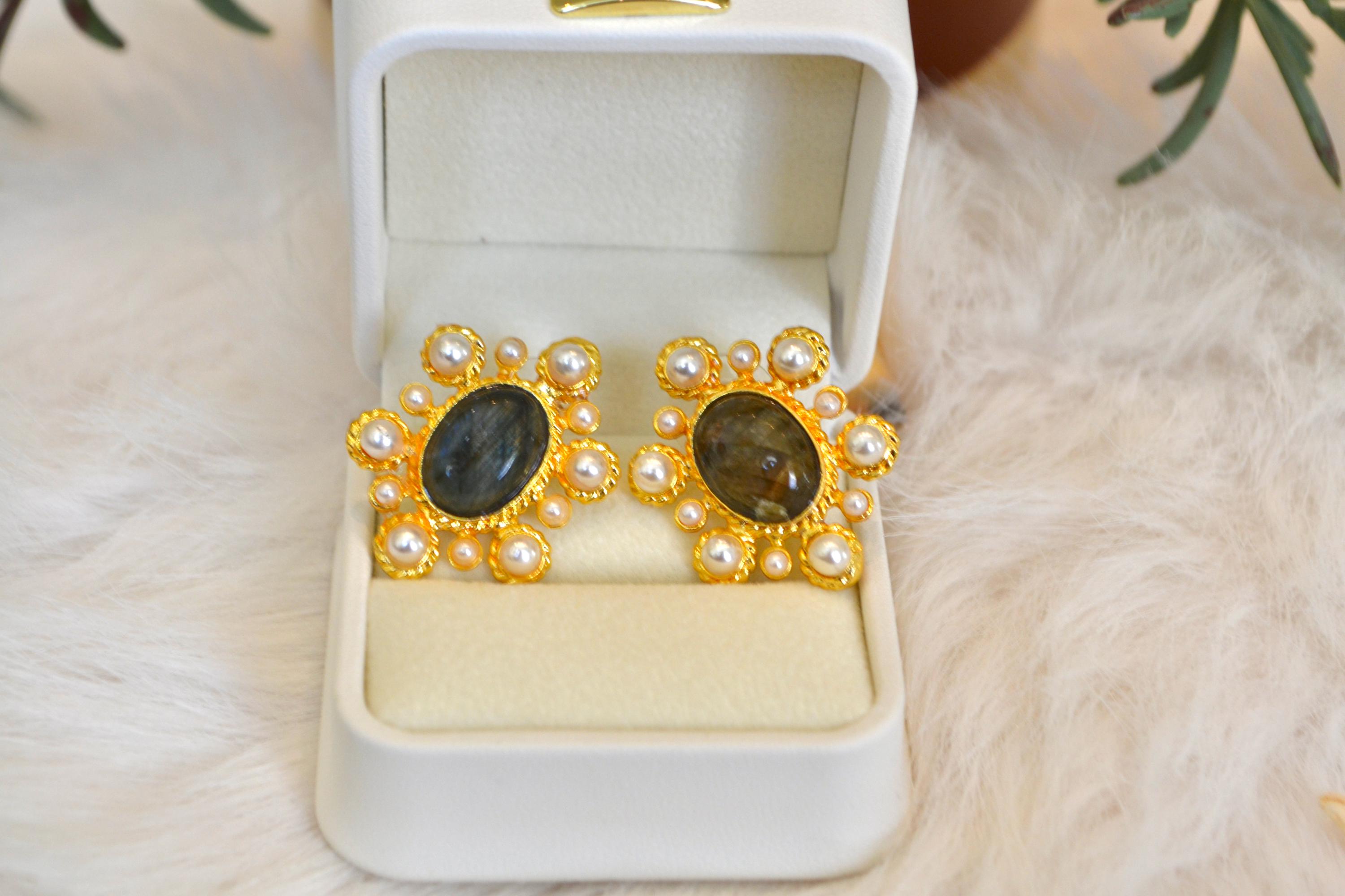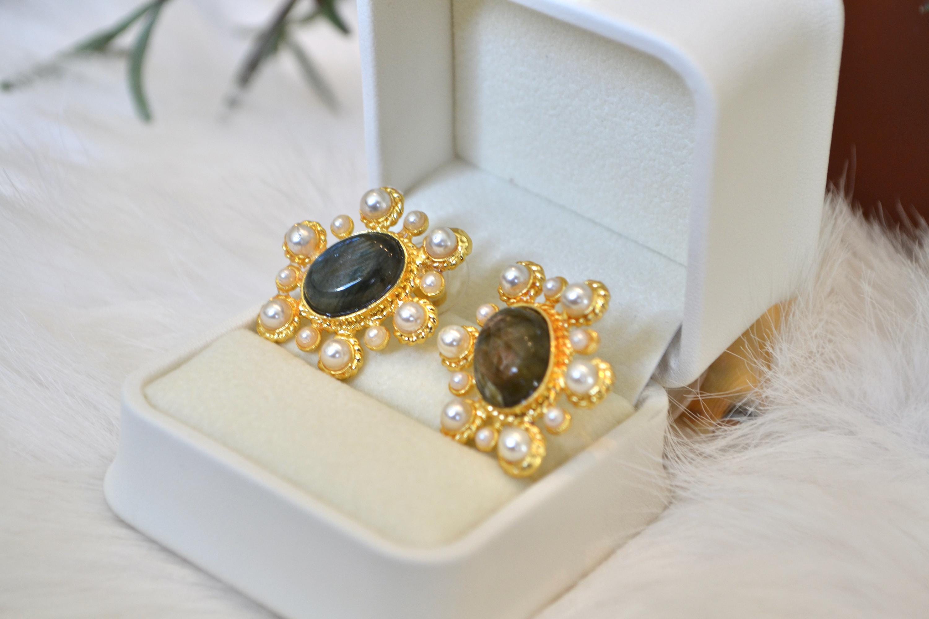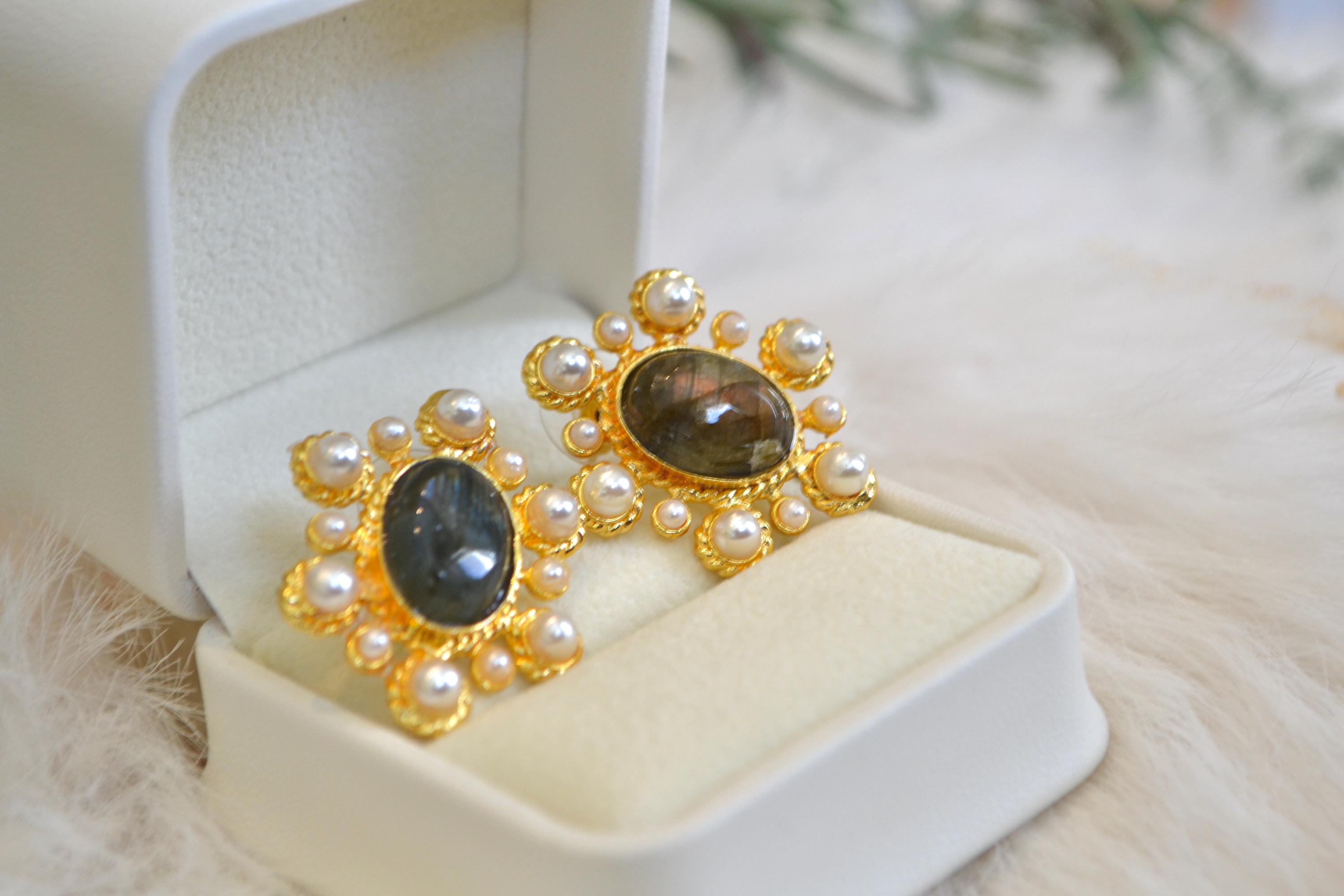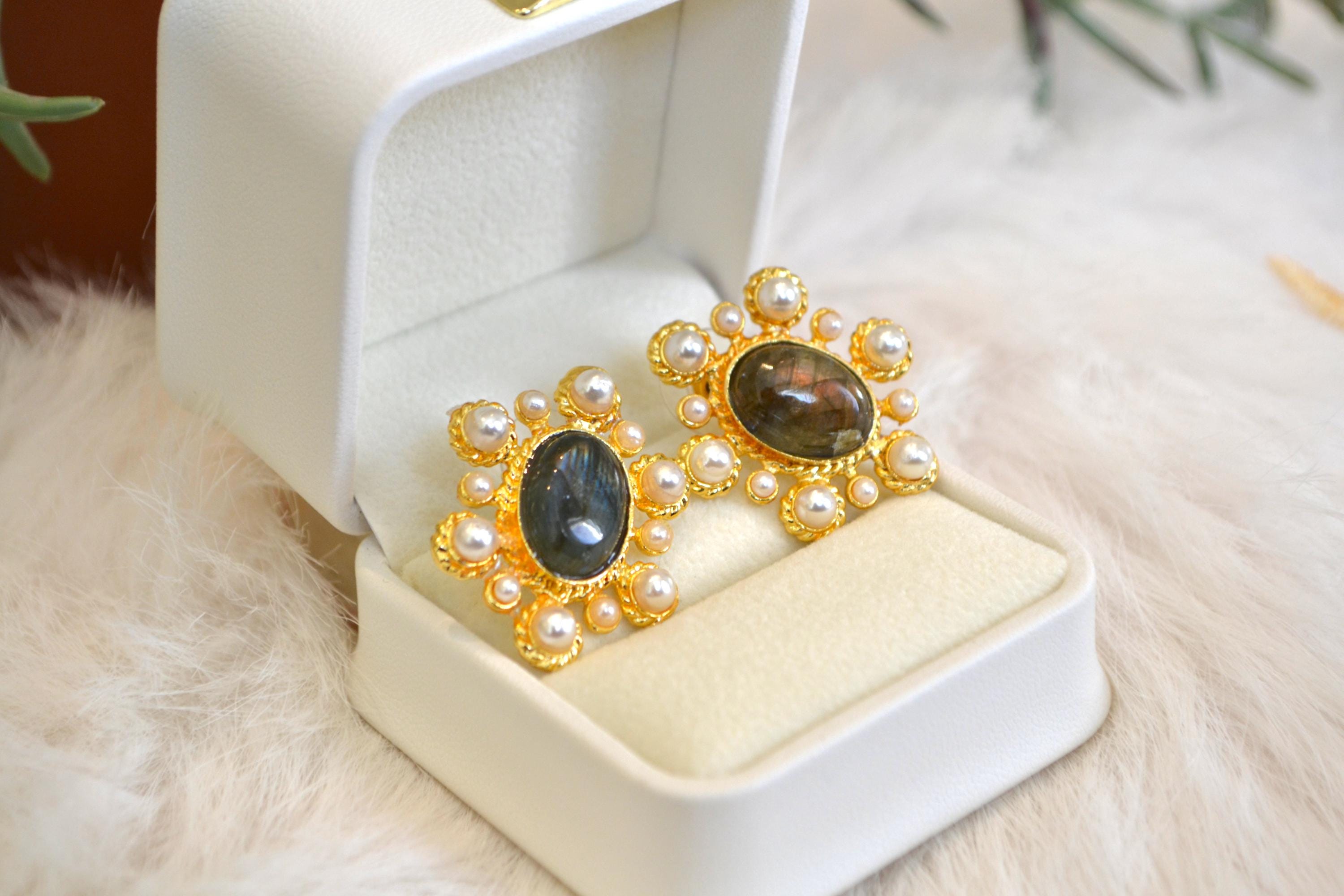 These statement stud earrings combine the glow of natural labradorite with the soft elegance of pearls, framed in rich gold details for a timeless vintage look.