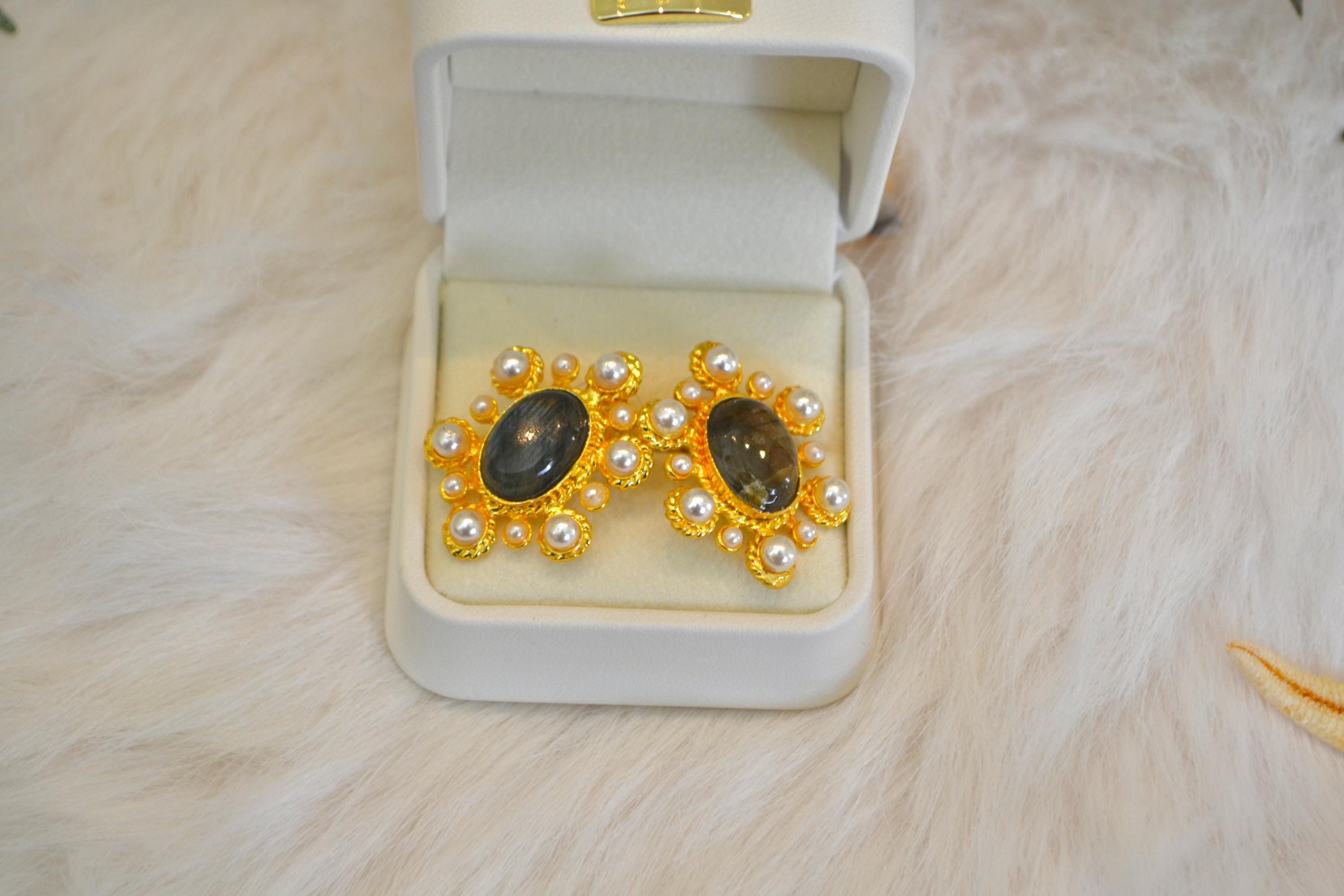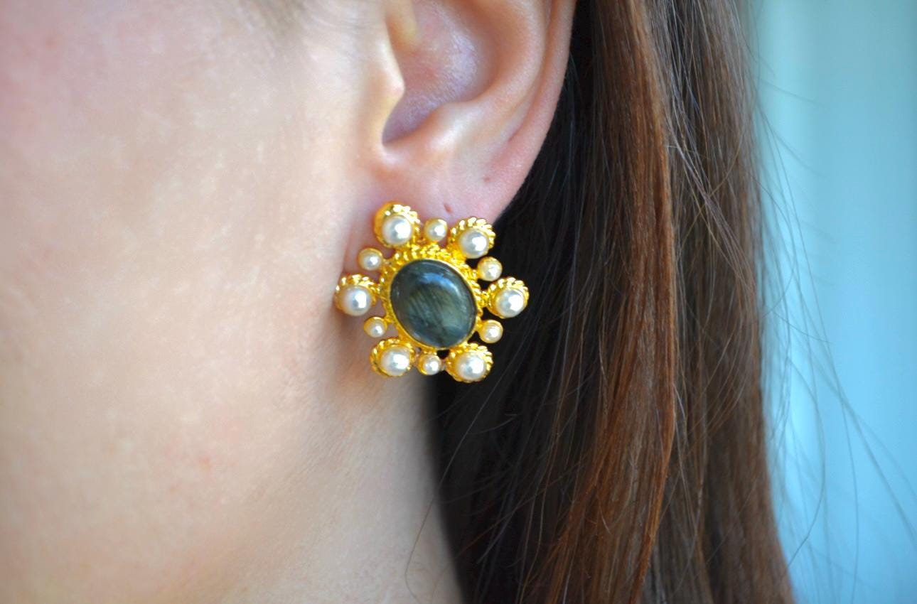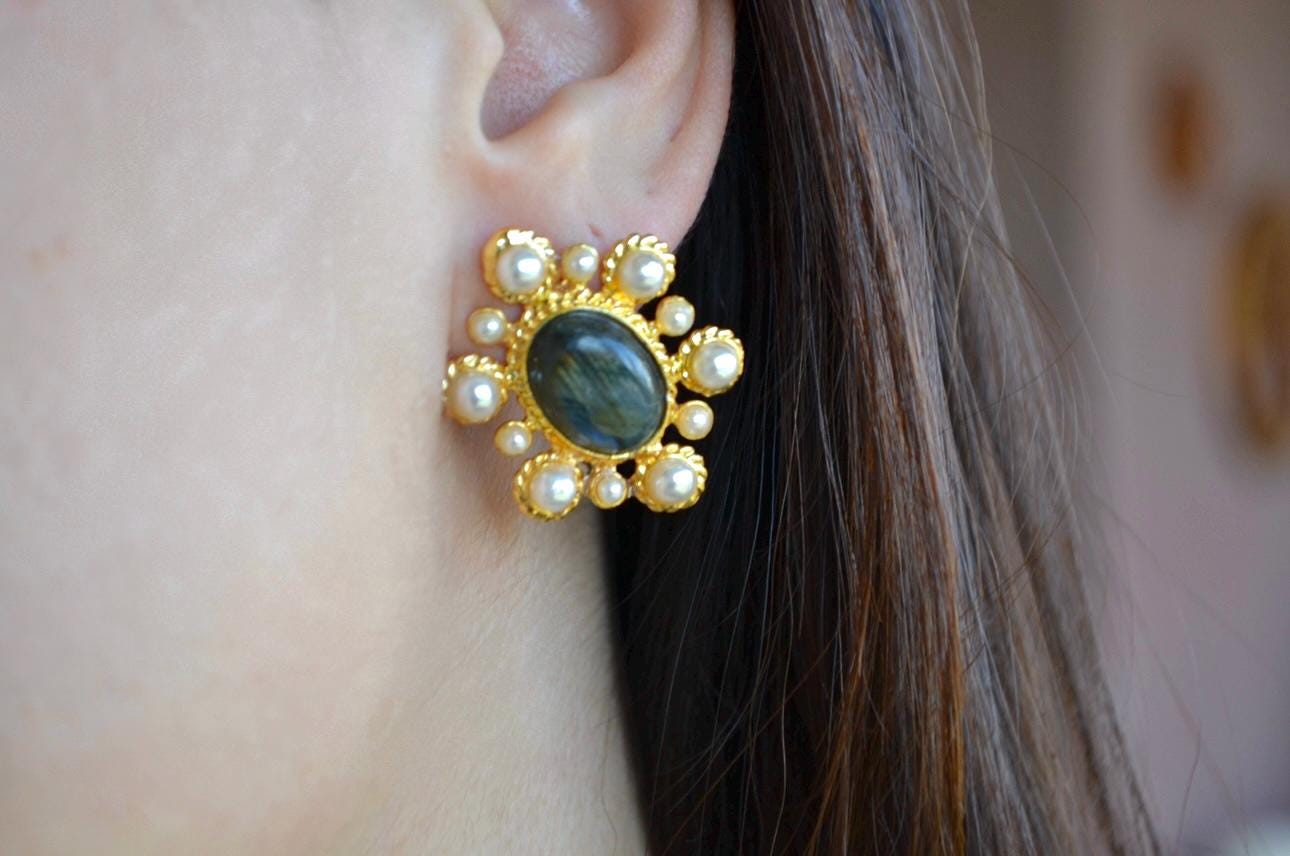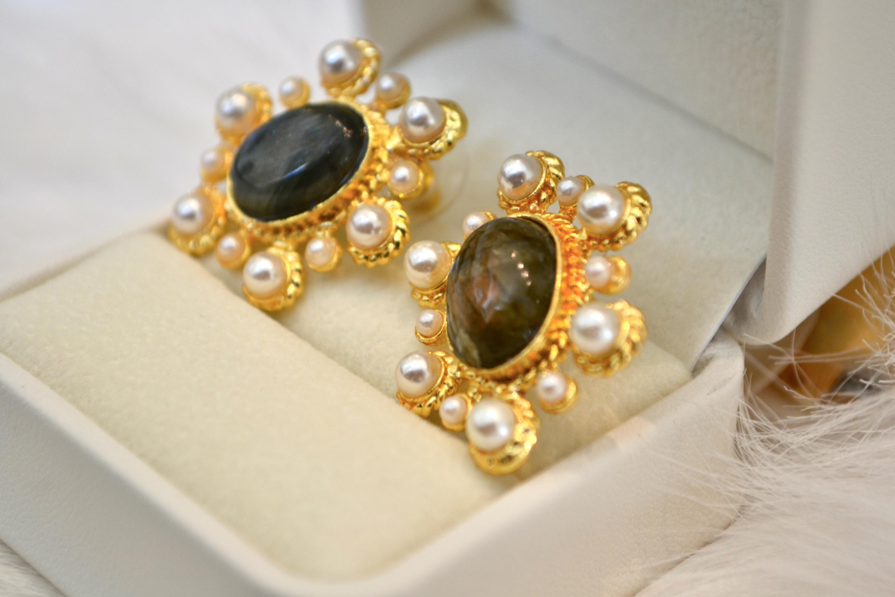 These statement stud earrings combine the glow of natural labradorite with the soft elegance of pearls, framed in rich gold details for a timeless vintage look.