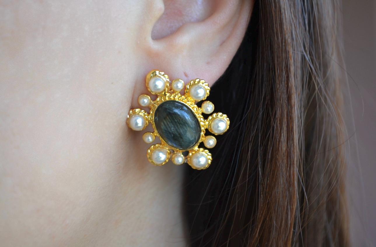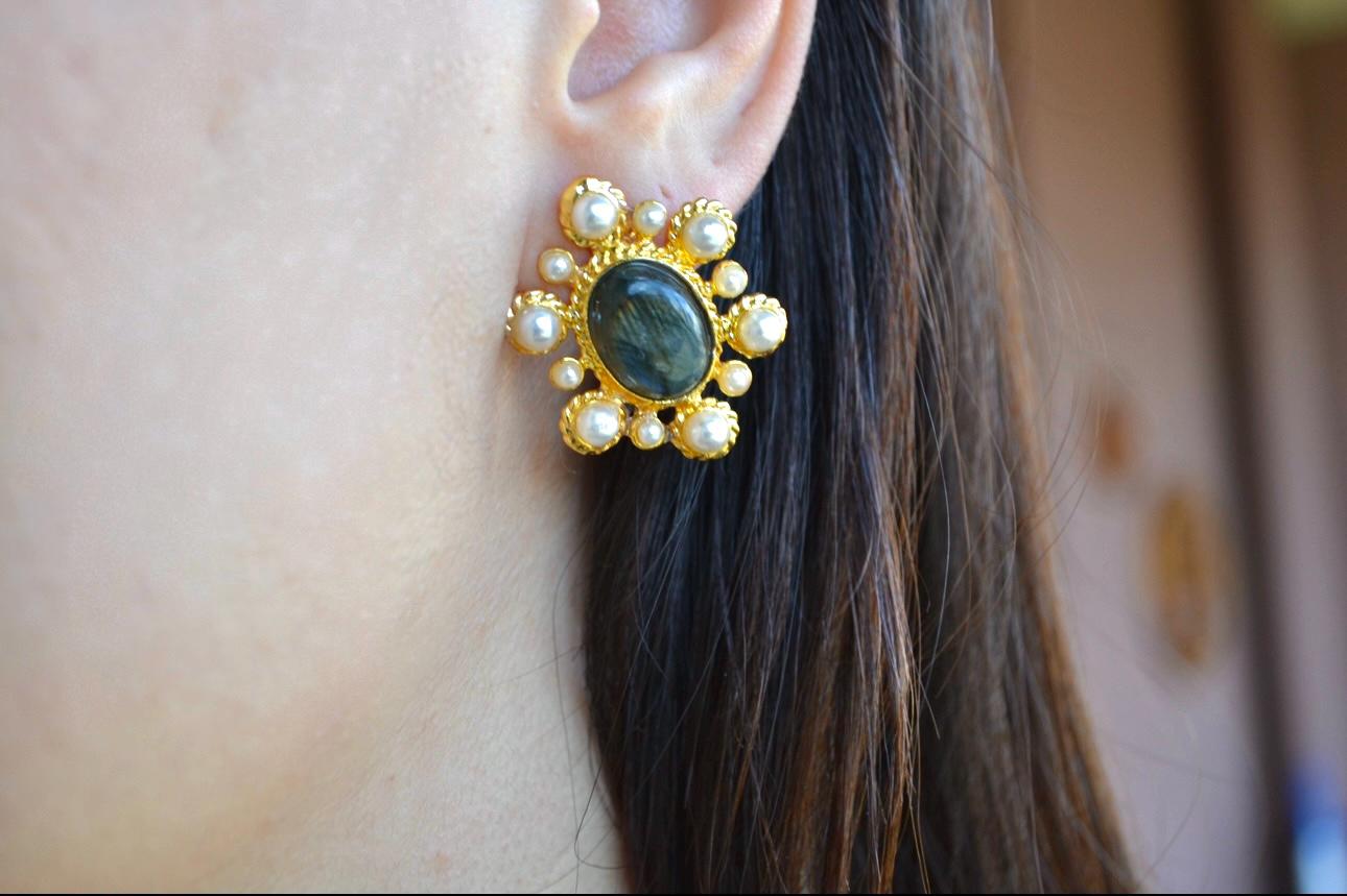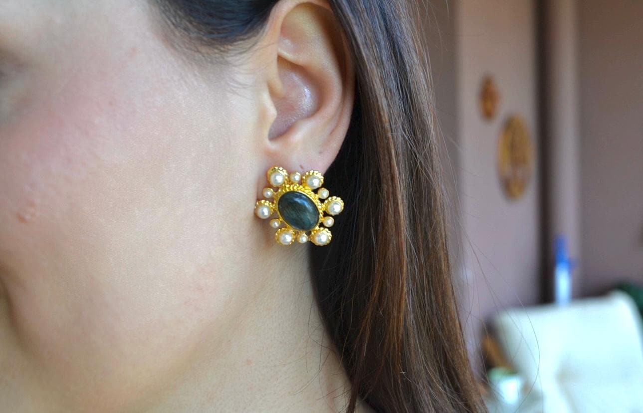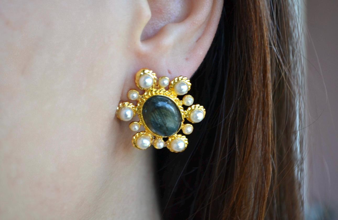 These statement stud earrings combine the glow of natural labradorite with the soft elegance of pearls, framed in rich gold details for a timeless vintage look.