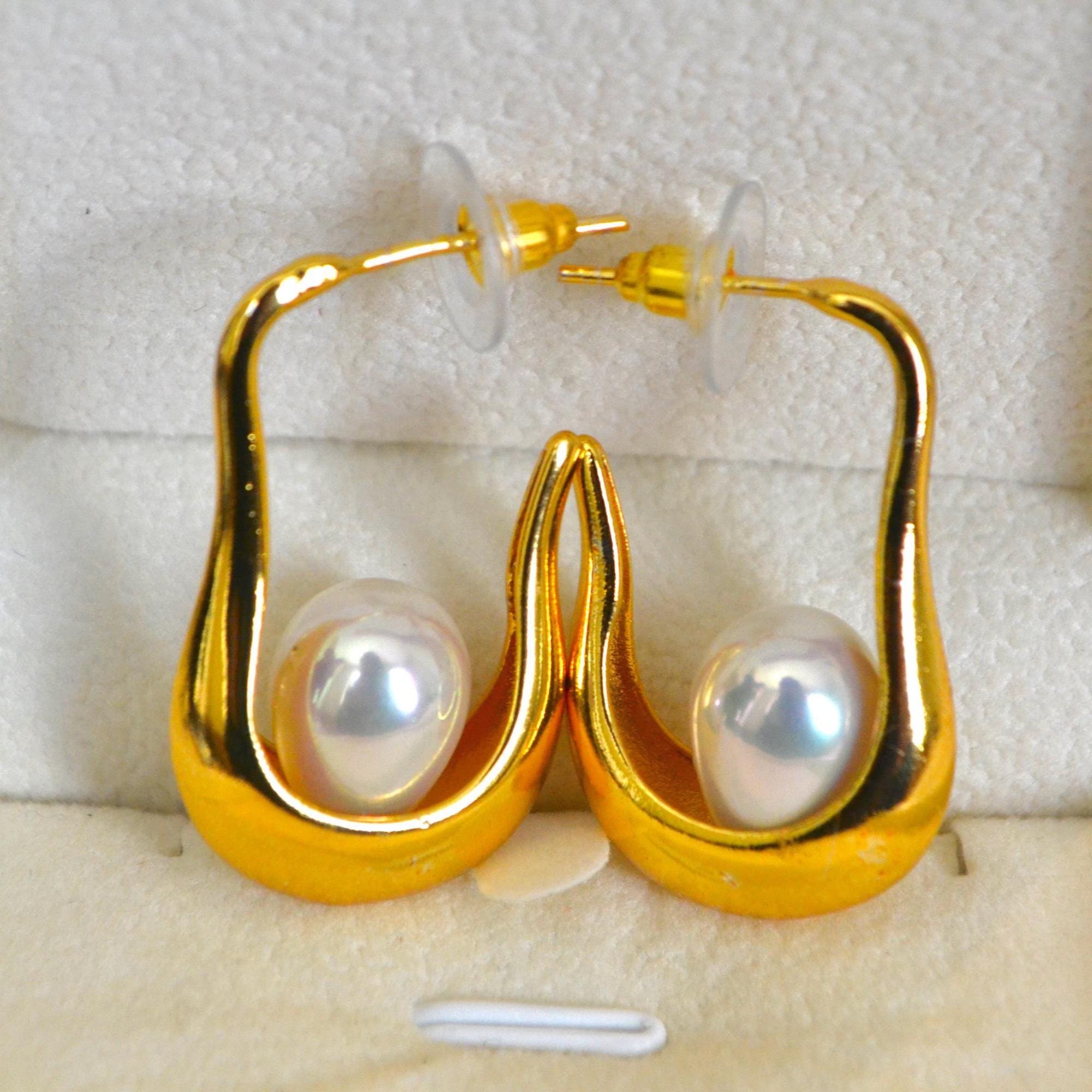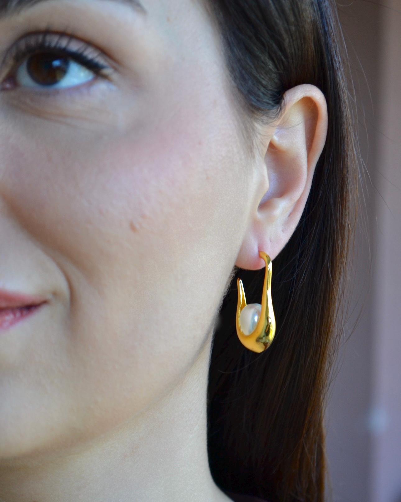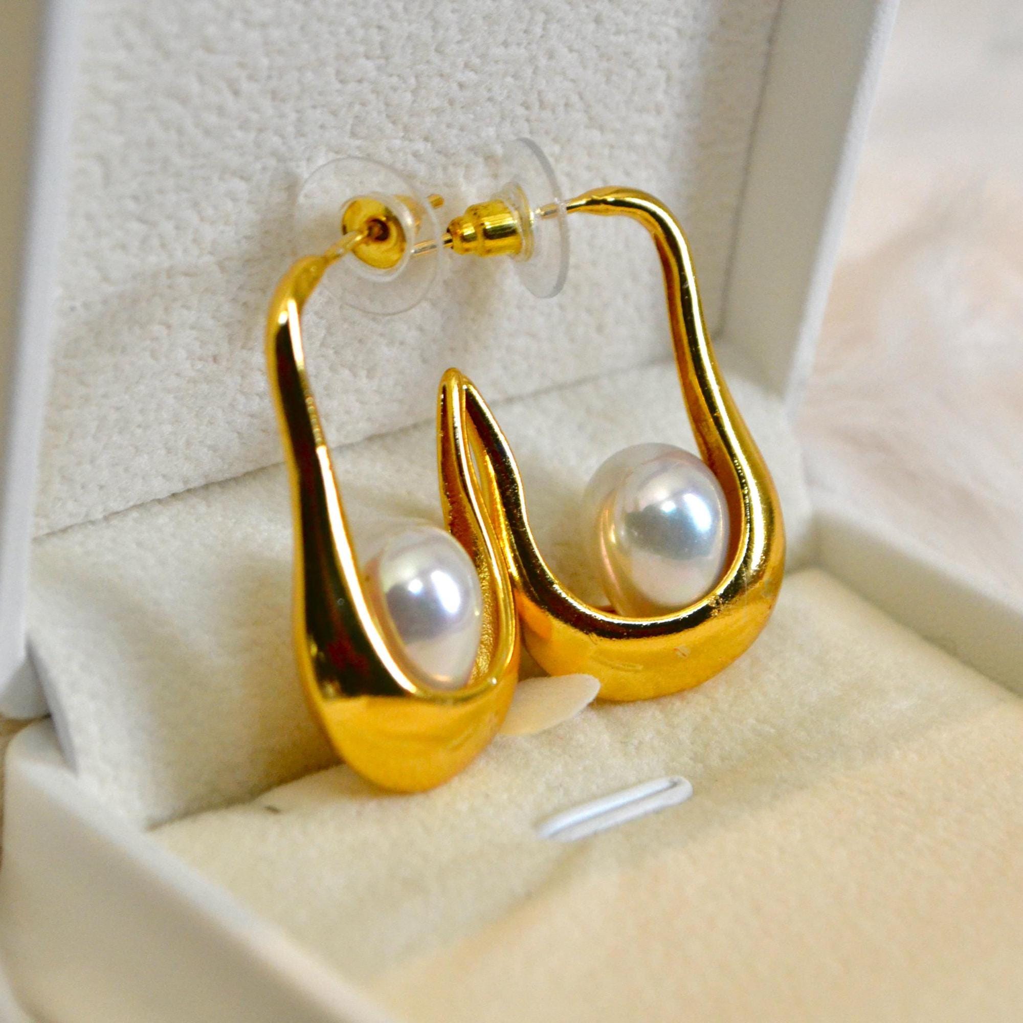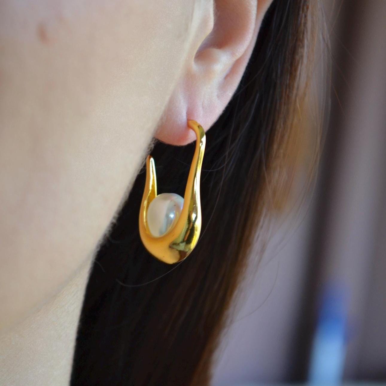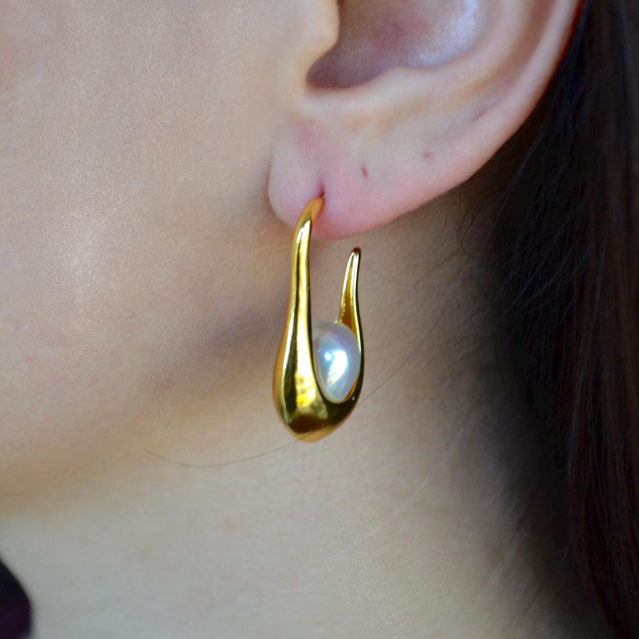 Gold Hoop Dangle Earrings, Teardrop Pearl, Minimalist Statement Jewelry, Elegant Gift for Her