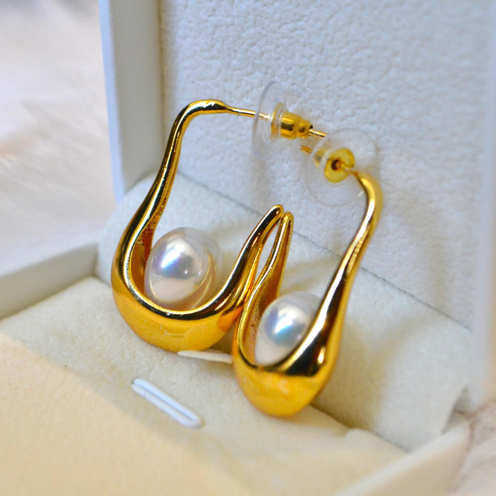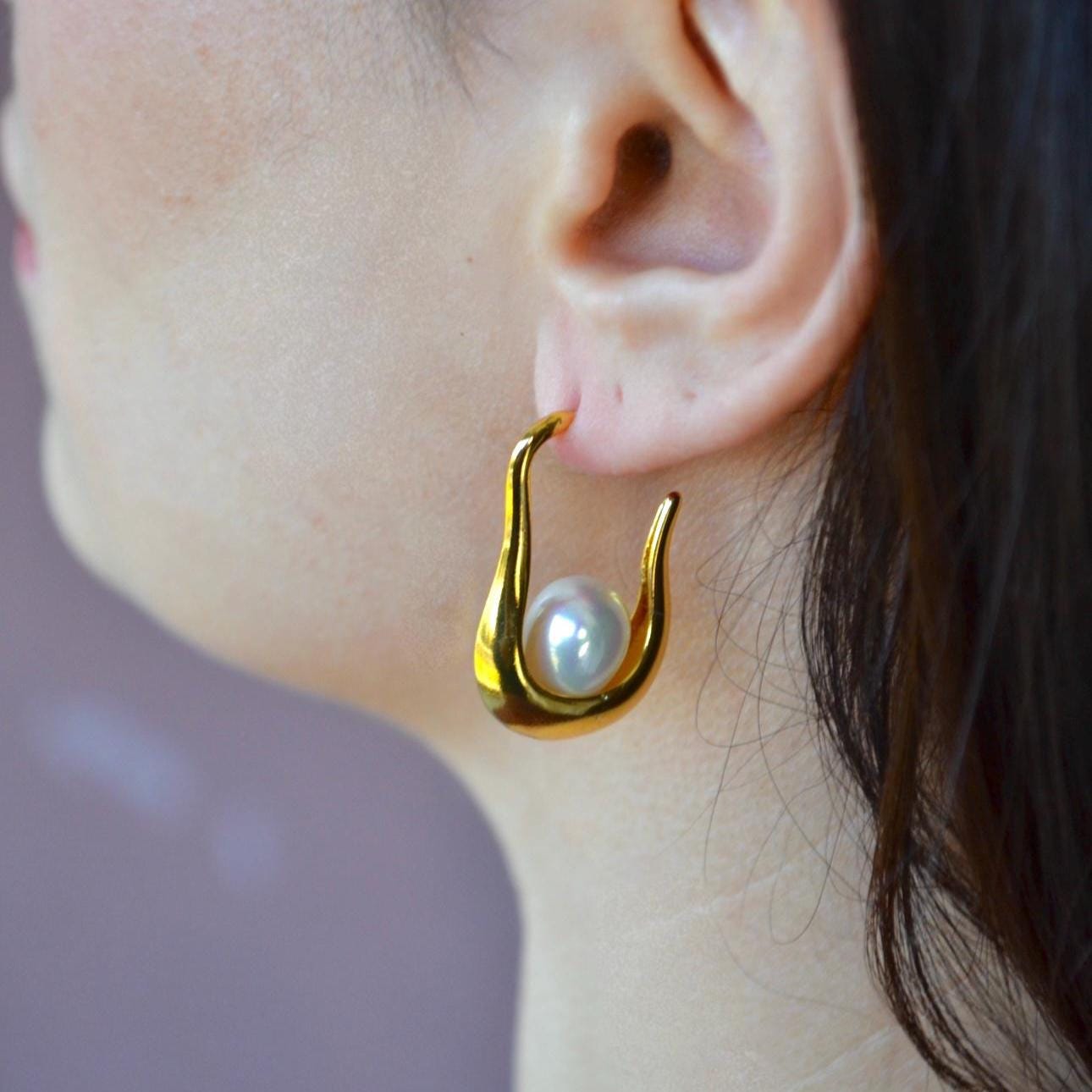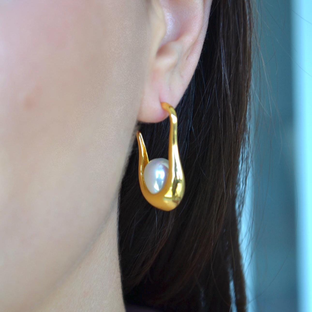 Designed with a fluid teardrop silhouette and a luminous natural pearl, these earrings blend modern minimalism with soft elegance. The sculptural curve gently hugs the ear, creating a refined yet eye-catching look that elevates even the simplest outfit.
