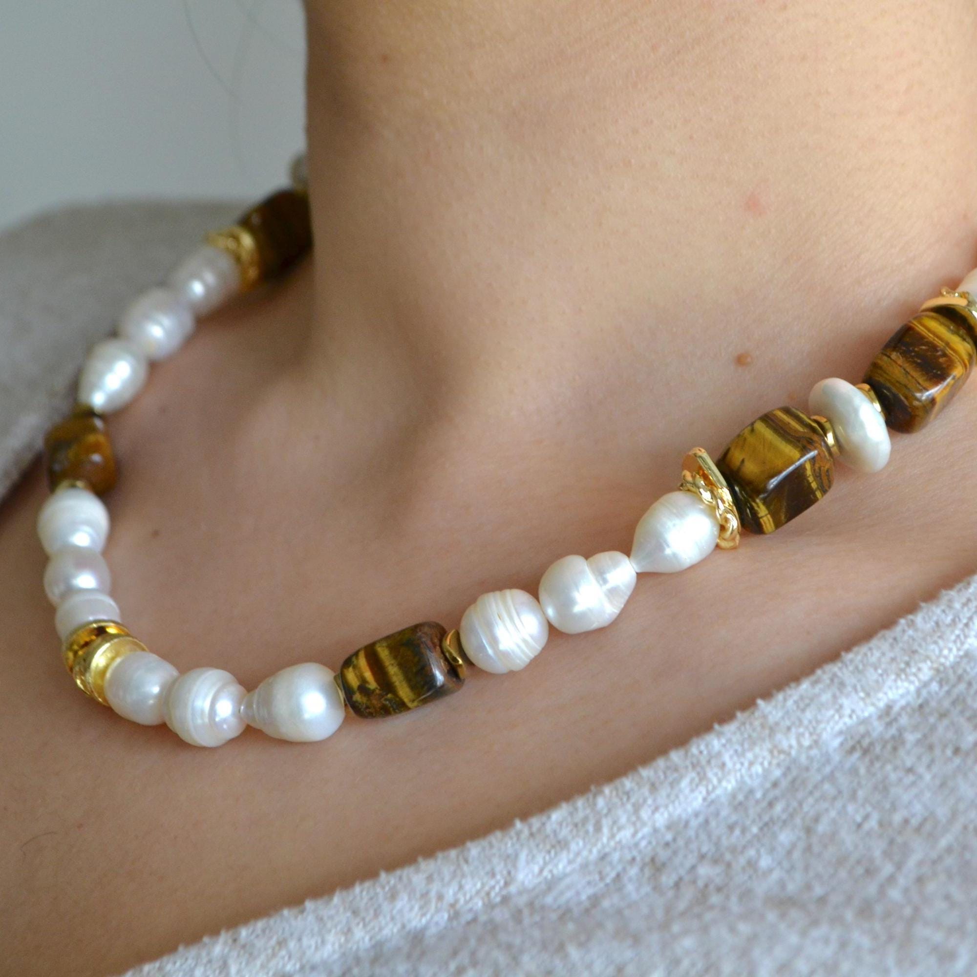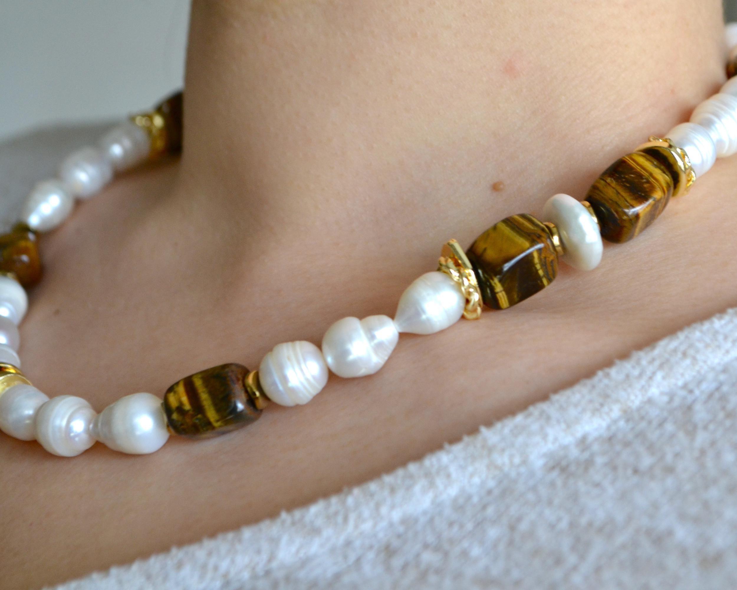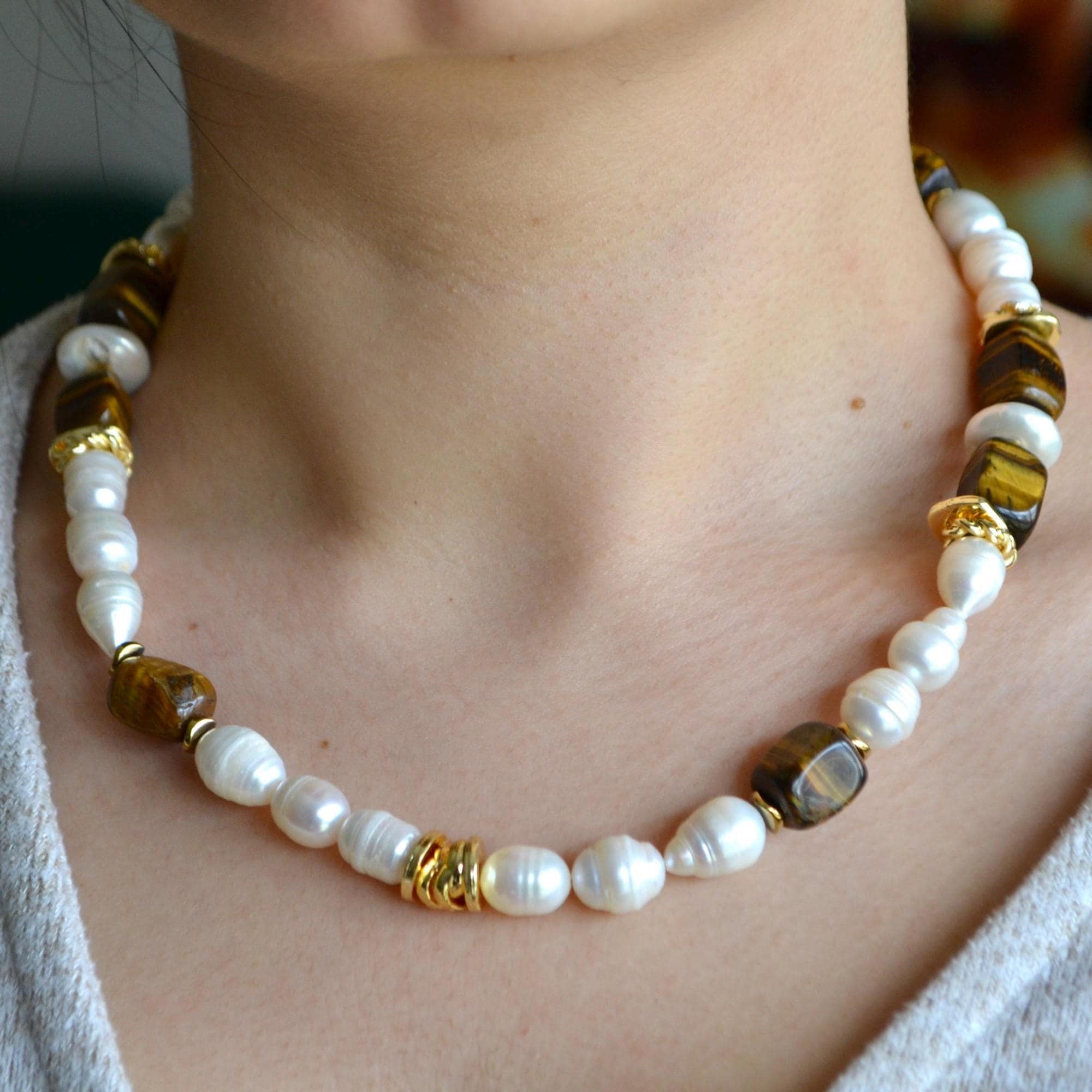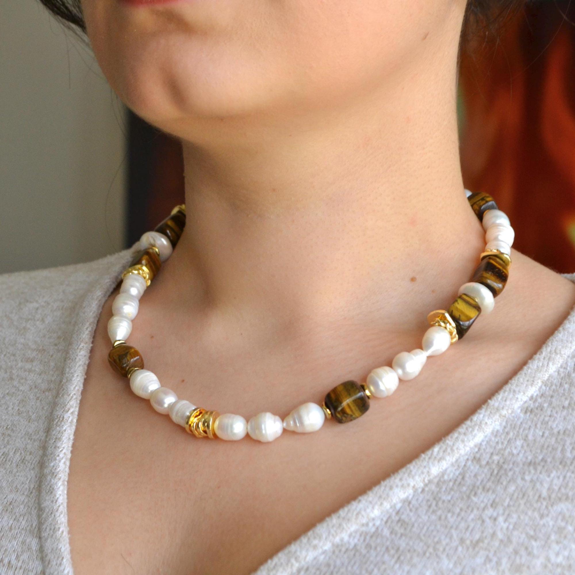 Tiger Eye Pearl Necklace for Women, Baroque Freshwater Pearl Choker, Natural Gemstone Beaded Necklace, Gold Statement Jewelry