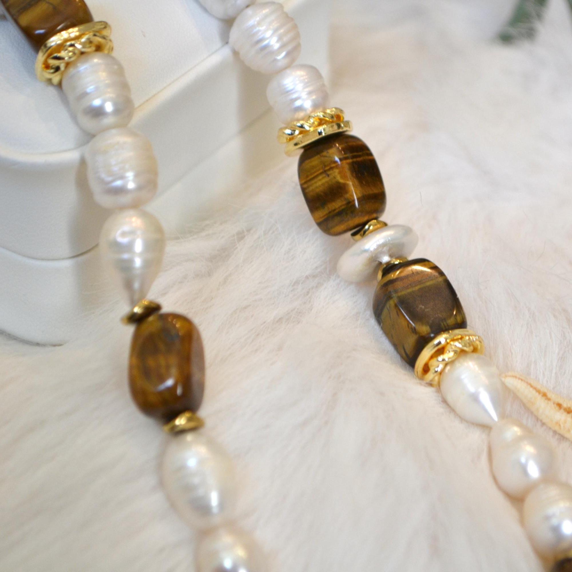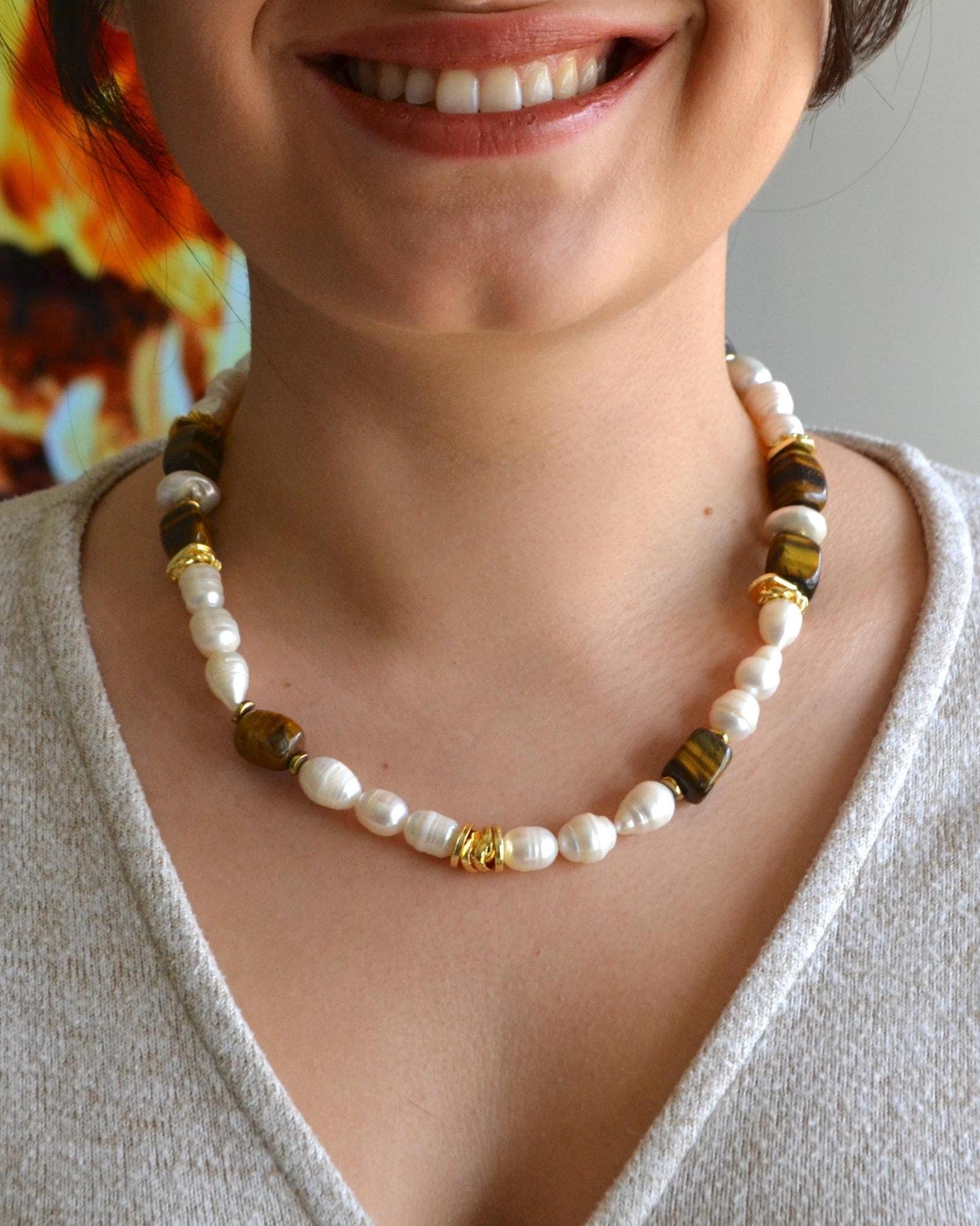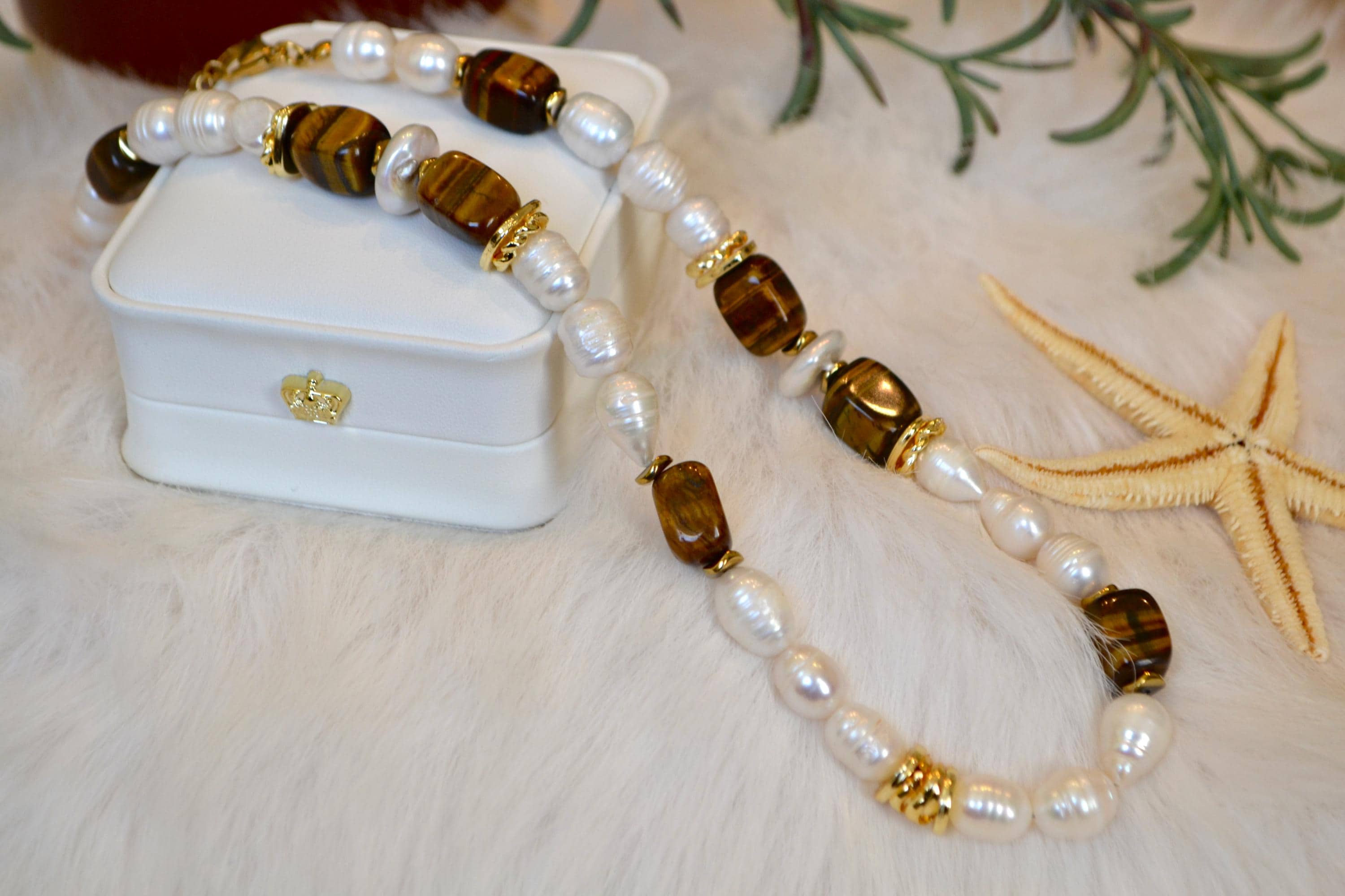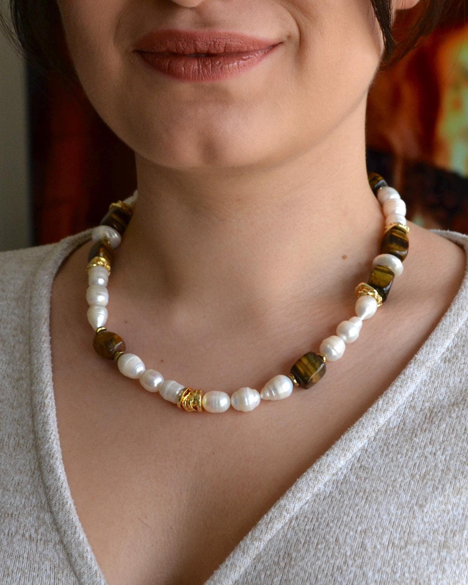 This necklace combines natural tiger eye stones with organic freshwater pearls and gold accents for a balanced, elegant look.